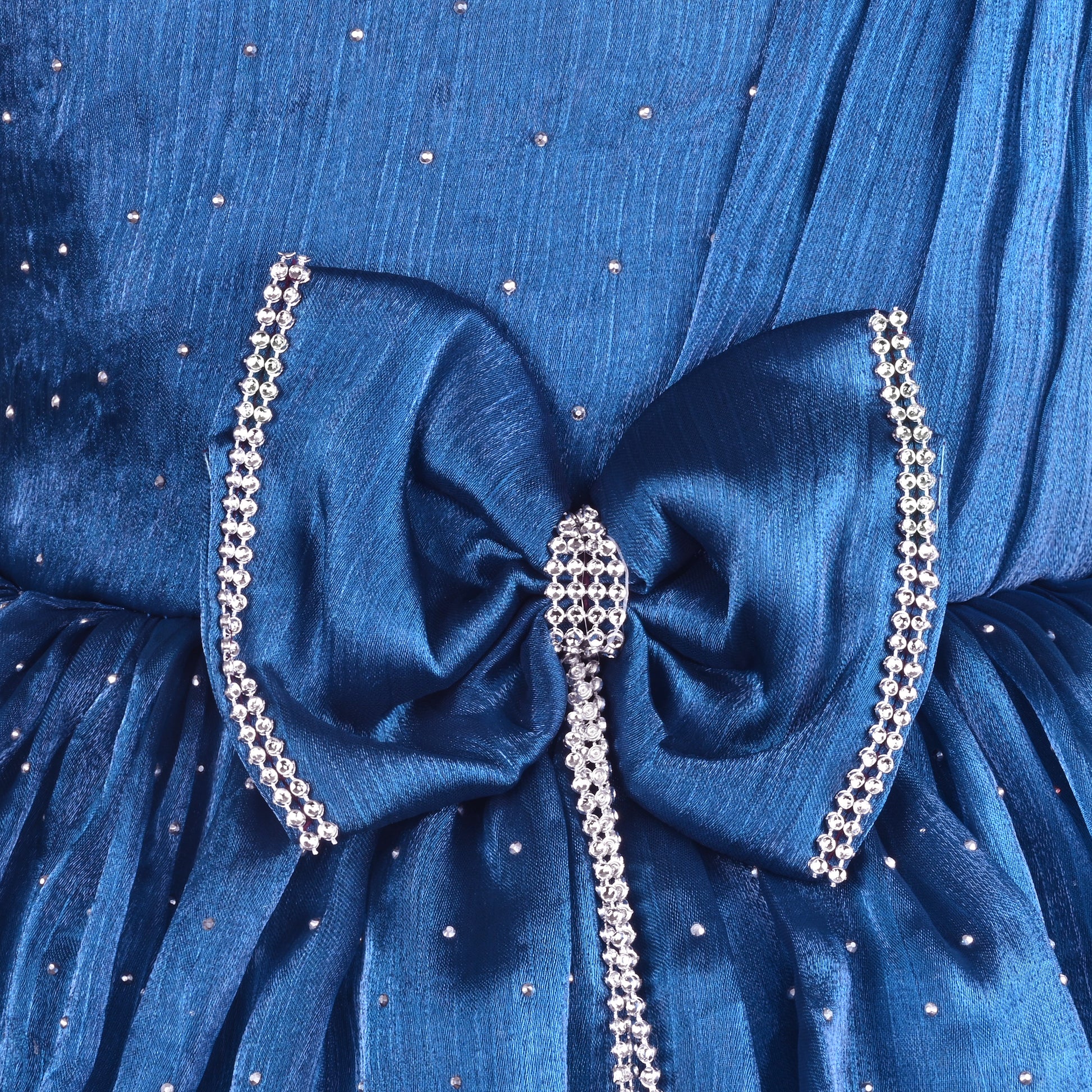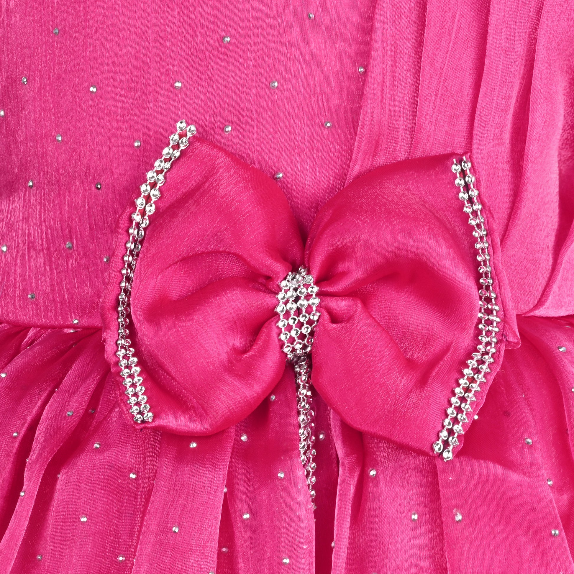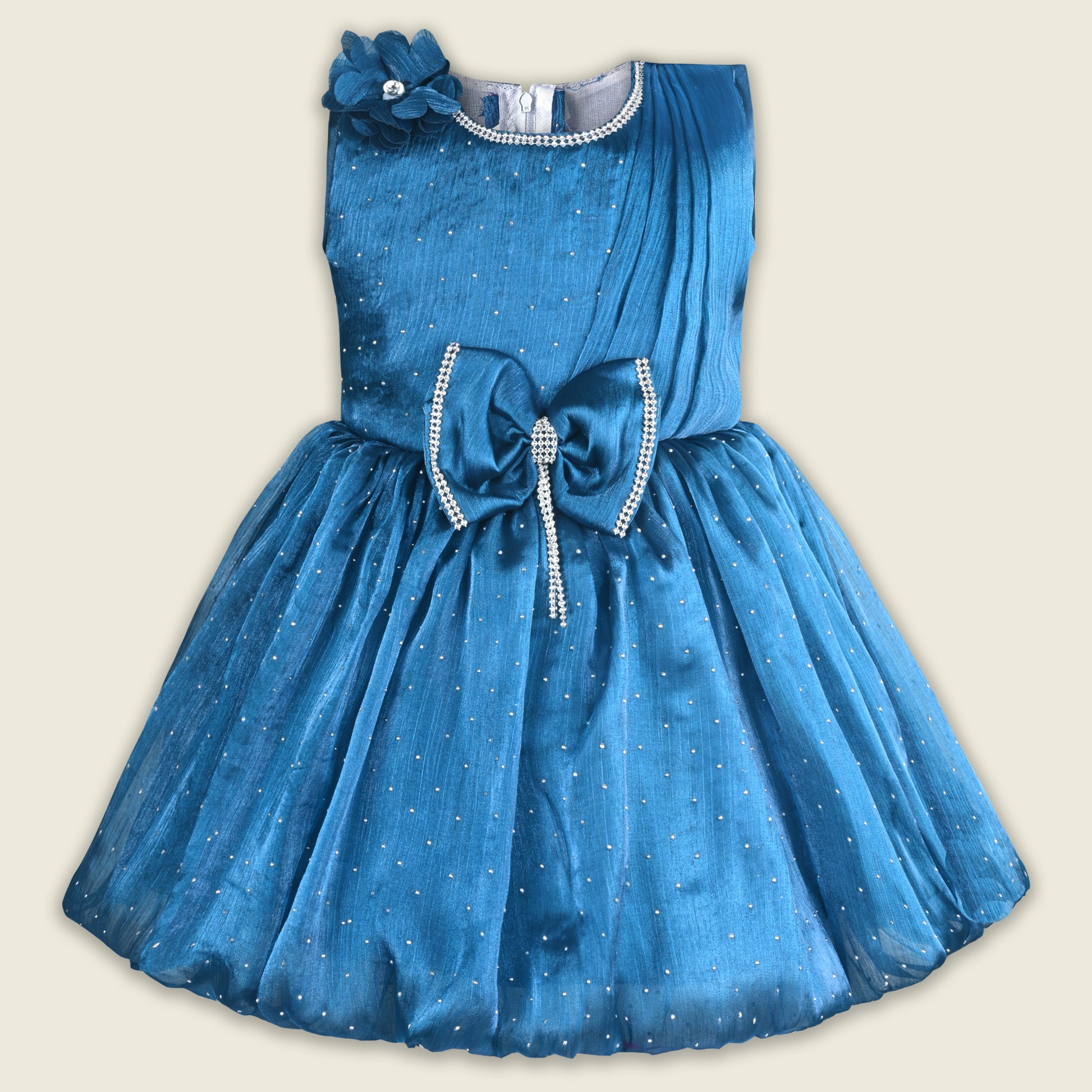 The bodice features a neat pleated design and is adorned with a beautiful 3D flower applique on the shoulder. The highlight of the outfit is the eye-catching big bow at the waist, decorated with shimmering pearl borders for a premium party look. The soft chiffon skirt adds volume and charm, making it perfect for birthdays, weddings, and festive celebrations.