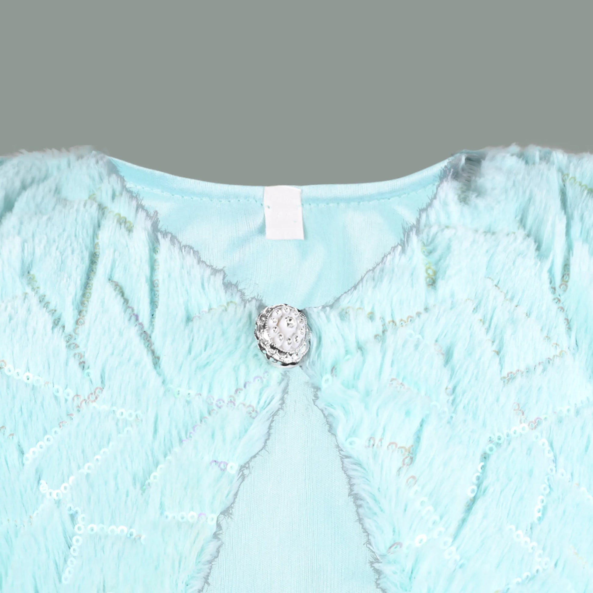 Keep your little princess warm and stylish with this Baby Girls Fur Party Wear Shrug, crafted from ultra-soft faux fur in a beautiful pastel aqua blue shade. The shrug features delicate sequin detailing that adds a touch of sparkle, making it perfect for winter weddings, parties, and festive celebrations.