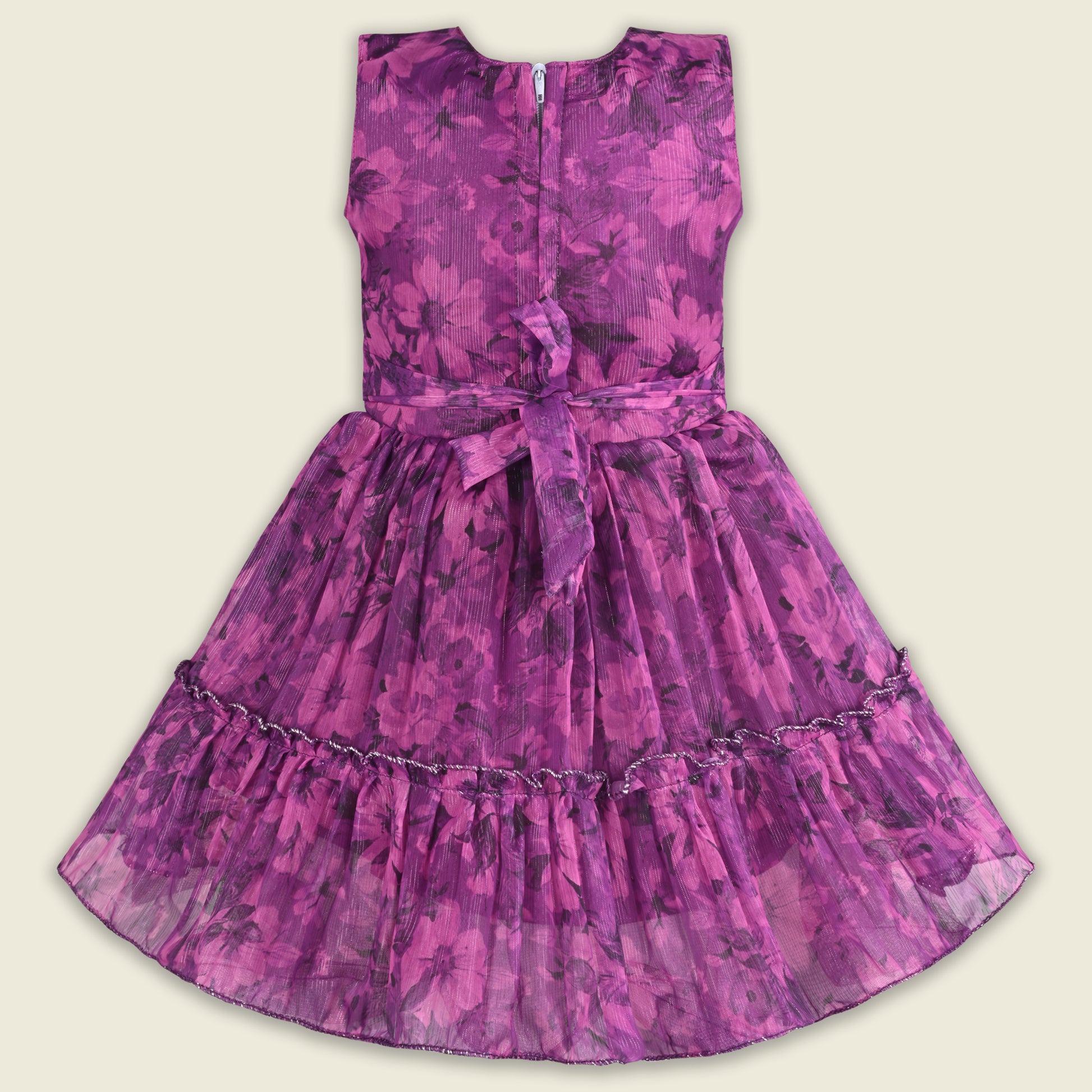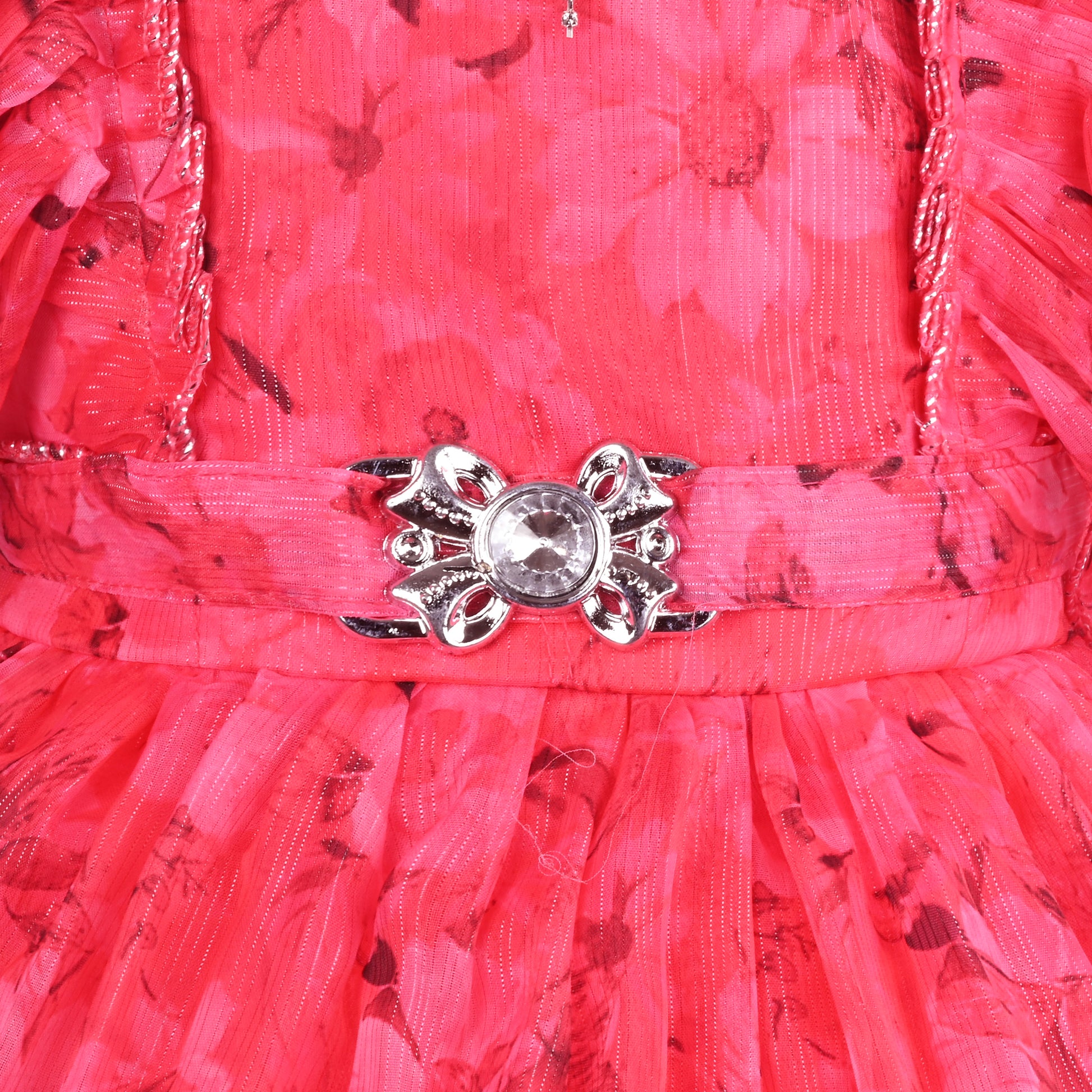 The bodice is enhanced with delicate stone embellishments and elegant detailing, adding a premium and festive shine. The stylish layered ruffle georgette sleeves bring a graceful touch while offering comfort and breathability. A sparkling waist embellishment further elevates the dress, giving your child a charming and royal appearance.