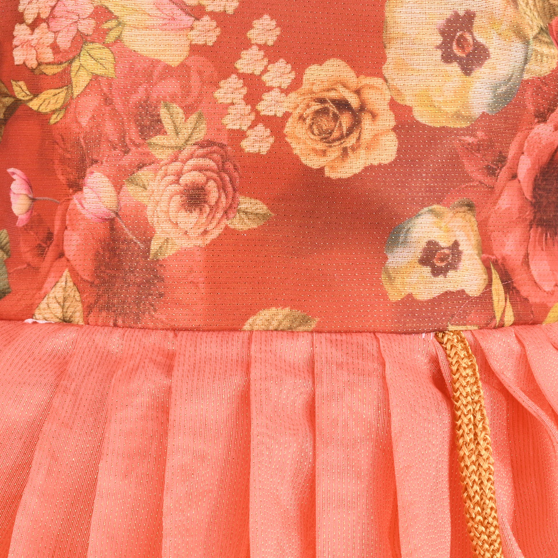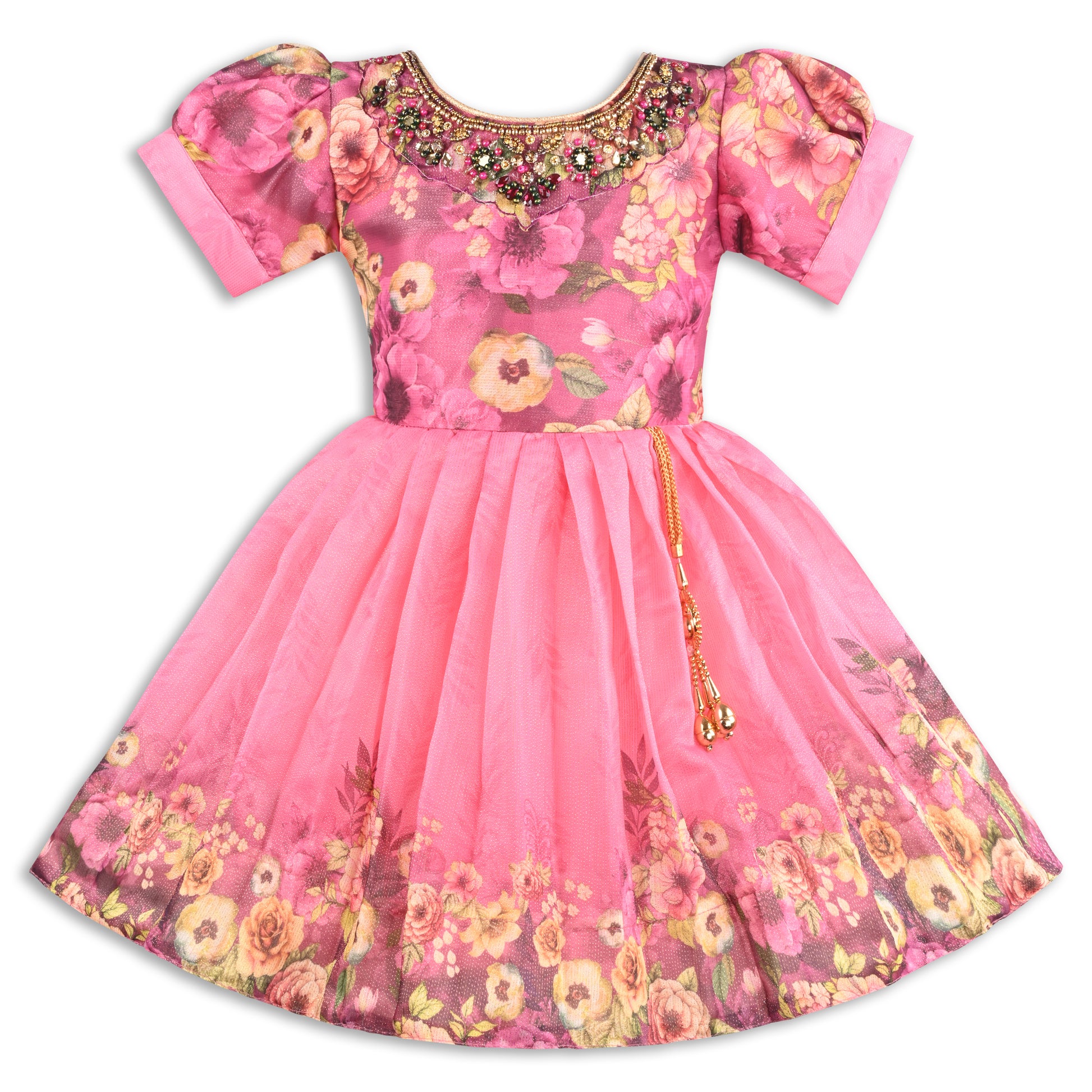 The bodice features a beautiful all-over floral satin print paired with intricate heavy neck embroidery and beadwork, giving the outfit a luxurious and traditional touch. The elegant puff sleeves enhance the princess look, while the flared satin skirt with floral border detailing brings a graceful and flowy silhouette. A stylish waist tassel adds an extra festive charm to complete the outfit.