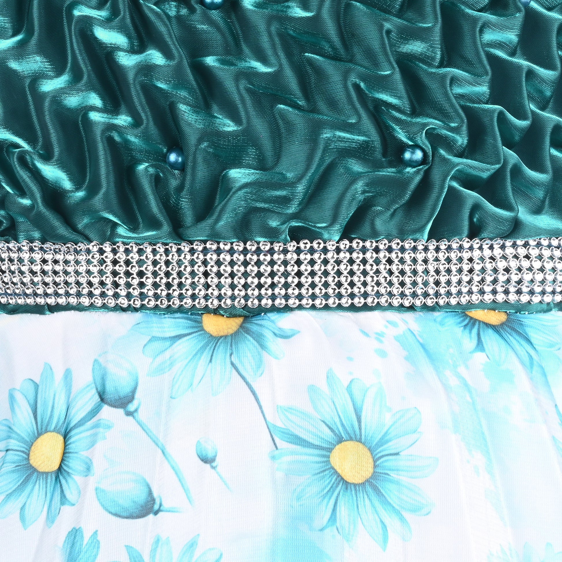 The dress comes with short puff sleeves made of satin and net blend, adding a graceful flair to the outfit. The waistline is highlighted with a shimmering silver belt, giving a perfect festive sparkle. The white satin skirt is beautifully printed with turquoise-blue daisies, creating a fresh and joyful appeal. Ideal for birthdays, parties, weddings, and festive events, this satin dress perfectly balances comfort, style, and charm.