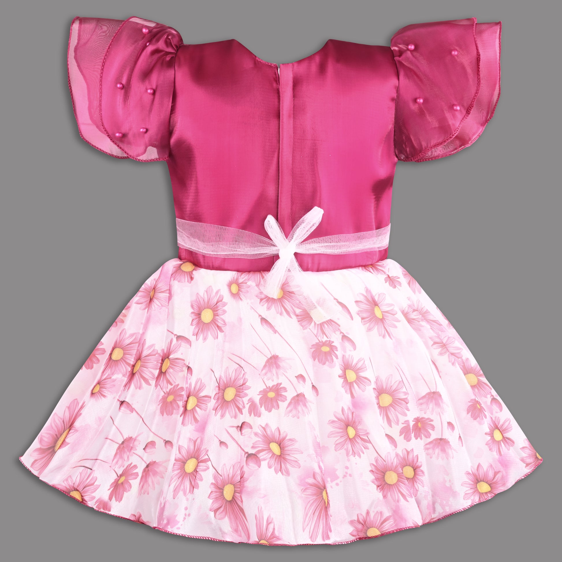 Beautiful Satin Party Dress for Girls – Puff Sleeves with Floral Print Skirt and Pearl Detailing