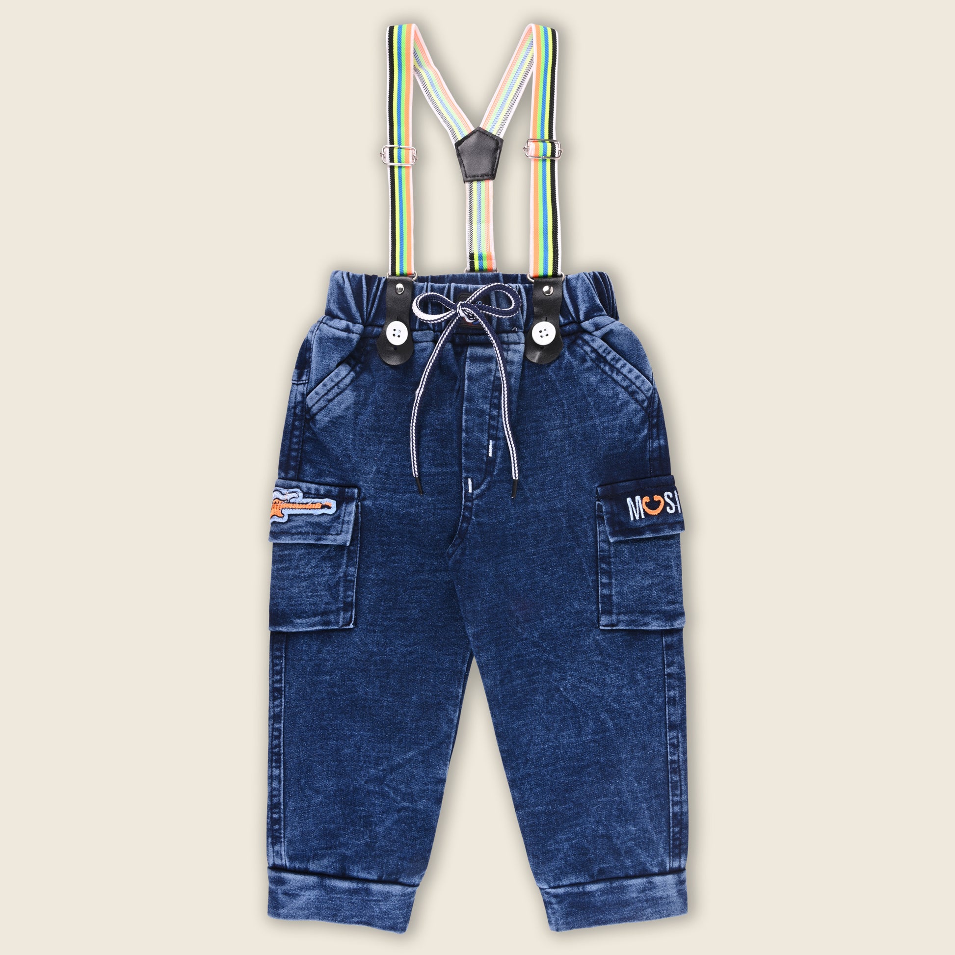 These boys' denim elastic cargo trousers with suspenders offer a stylish and functional twist to classic cargo pants. Made from premium-quality denim, they provide durability and comfort for all-day wear. The elastic waistband ensures a snug and adjustable fit, while the detachable suspenders add a trendy and playful touch. Featuring multiple spacious cargo pockets, these trousers are perfect for carrying small essentials, making them ideal for active kids. Their versatile design pairs well with t-shirts, shirts, or jackets for a cool and casual look. Perfect for outings, playdates, or special occasions, these trousers bring both style and practicality to any young boy’s wardrobe.