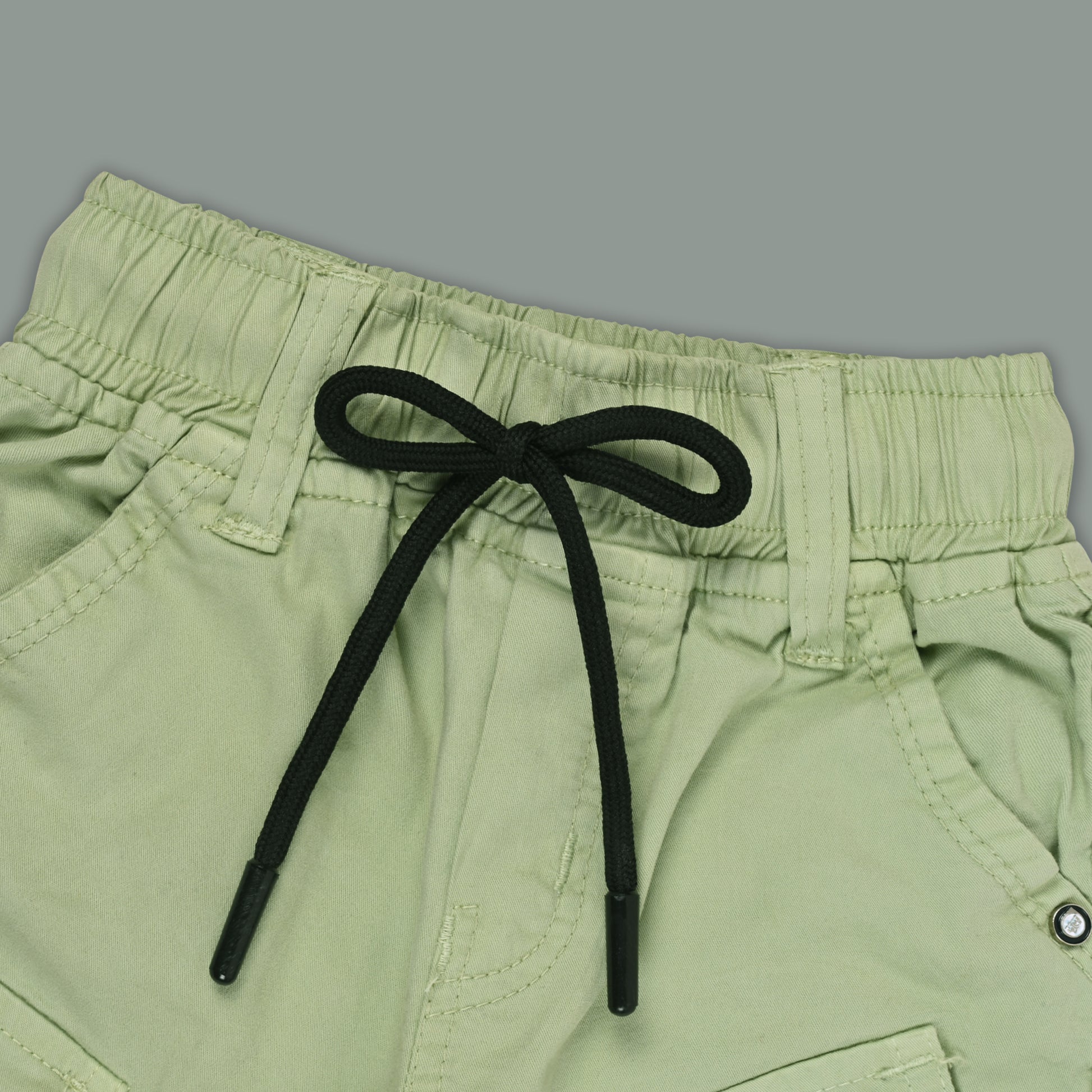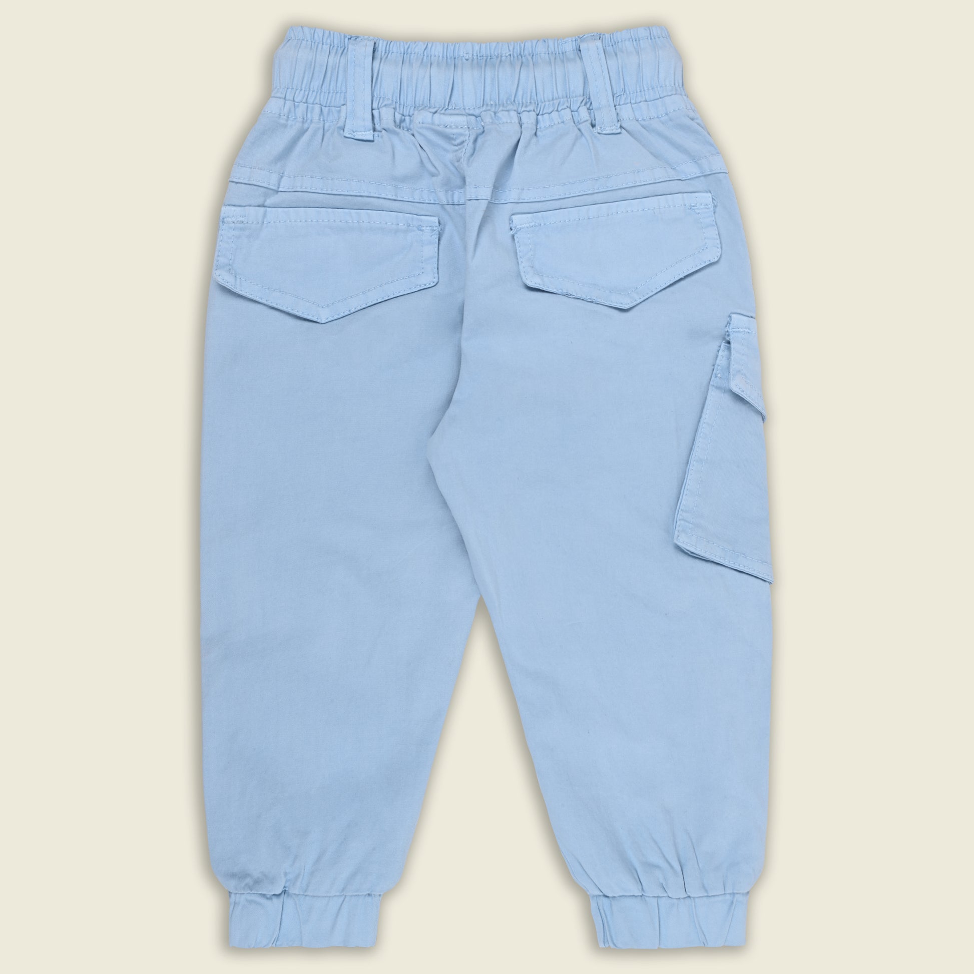 Upgrade your child’s casual style with these cotton denim cargo joggers. Made from soft, breathable, and stretchable fabric, they ensure comfort all day long. Designed with trendy printed details, flap cargo pockets, and an elastic waistband with contrast drawstring for a secure fit. Perfect for school, playtime, or outings.