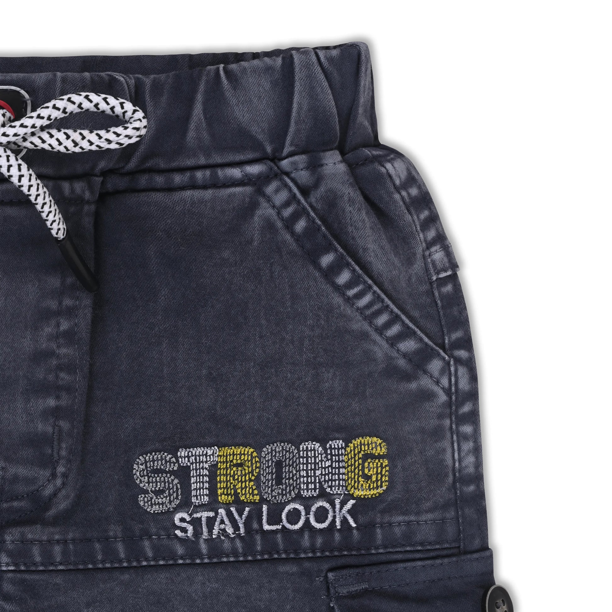 These stylish boys’ cargo jogger pants are crafted from durable denim fabric, giving a rugged yet comfortable feel for everyday wear. Designed with an elasticated waistband and adjustable drawstring, they ensure a secure and flexible fit. The cargo-style flap pockets and bold text embroidery add a trendy, utility-inspired look, while the jogger cuffs provide a neat finish. Perfect for casual outings, playtime, and daily wear.