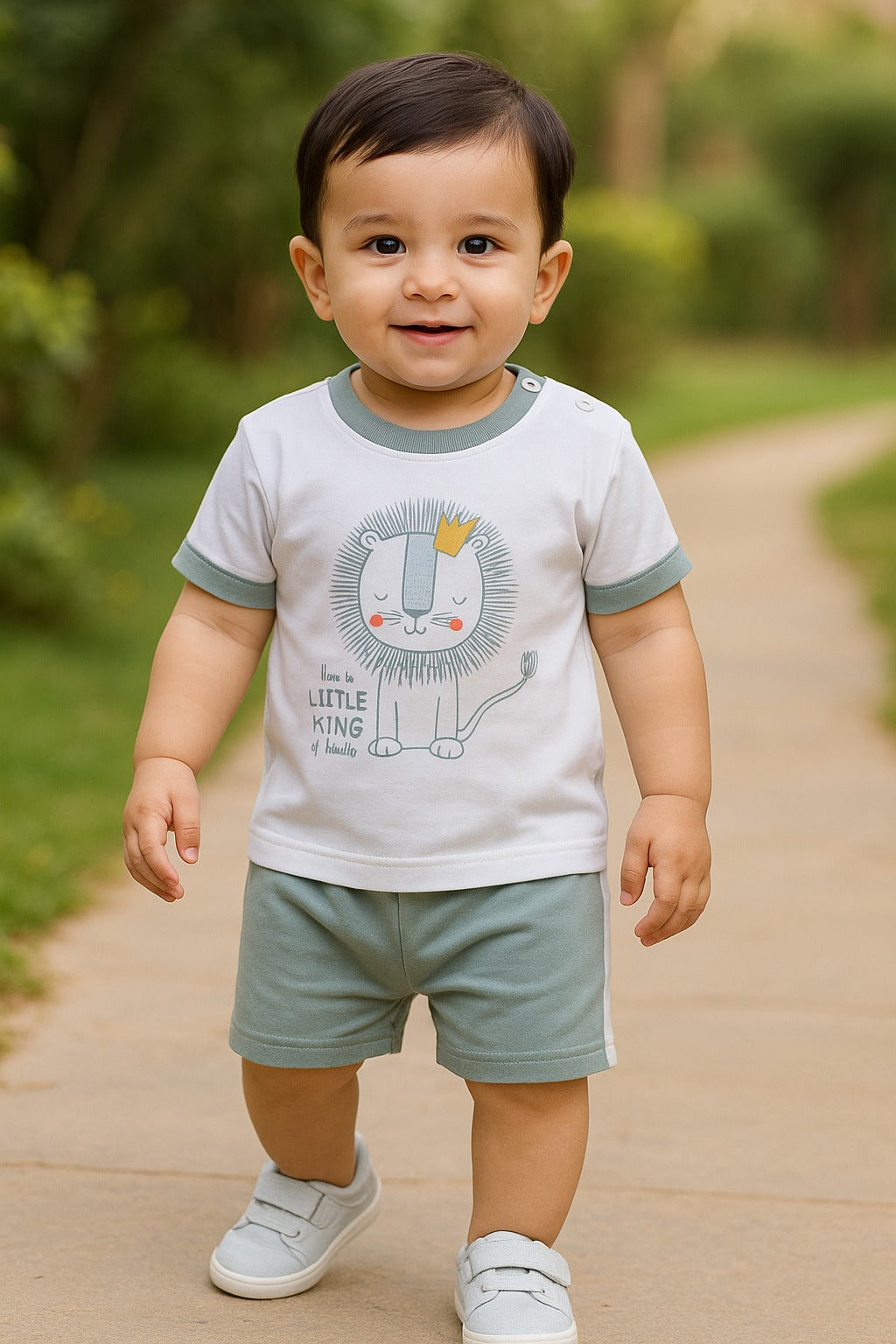 Dress your little boy for cool comfort and bright style with this boys’ printed cotton tank and shorts set. Crafted from 100% breathable cotton, the tshirt boasts lively prints that bring a cheerful summer vibe. The elasticated shorts offer a comfy fit and freedom of movement—whether he’s running at the park, playing at the beach, or relaxing at home. Style this set with sneakers or sandals for a complete warm-weather look.