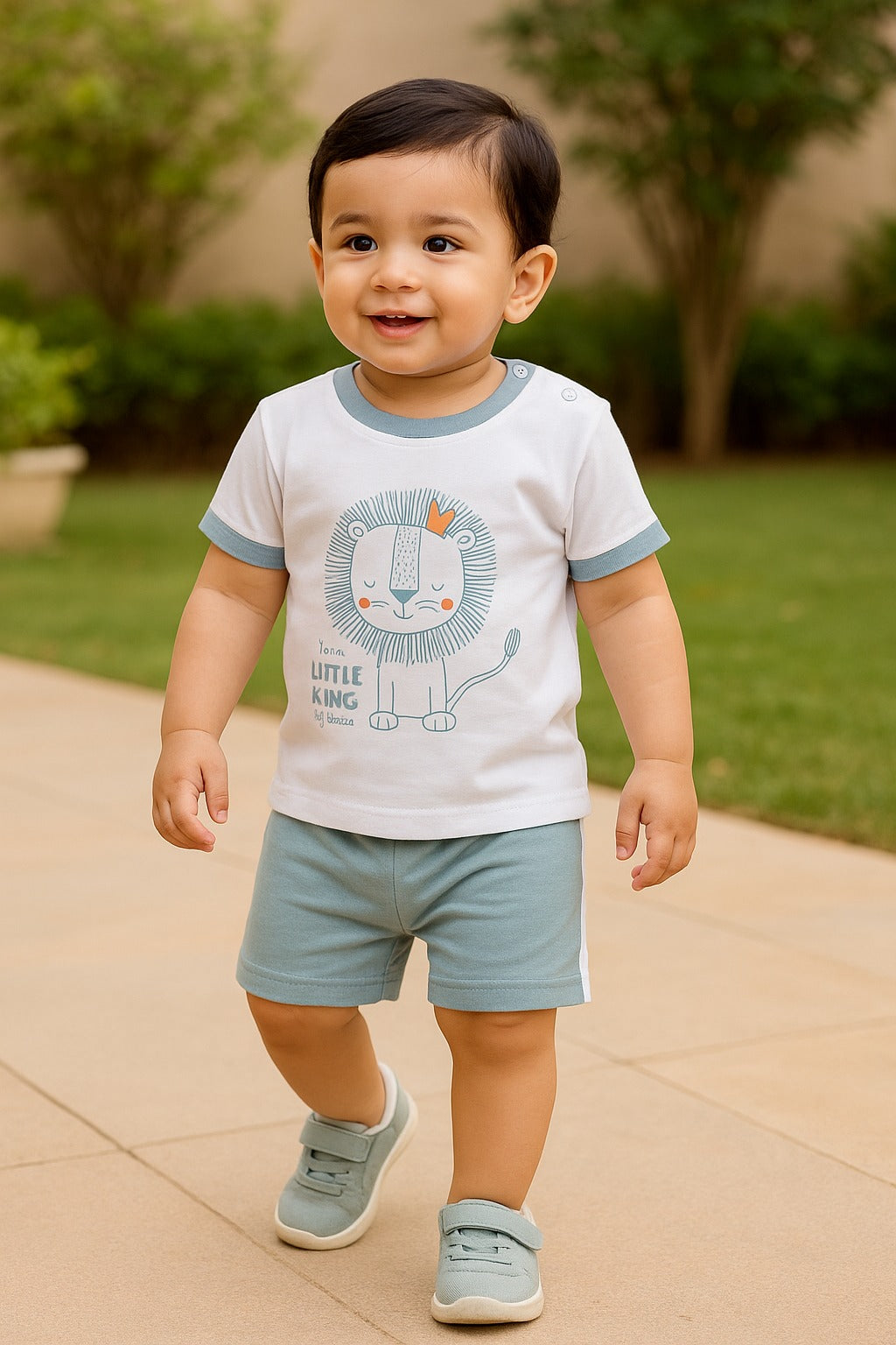 Dress your little boy for cool comfort and bright style with this boys’ printed cotton tank and shorts set. Crafted from 100% breathable cotton, the tshirt boasts lively prints that bring a cheerful summer vibe. The elasticated shorts offer a comfy fit and freedom of movement—whether he’s running at the park, playing at the beach, or relaxing at home. Style this set with sneakers or sandals for a complete warm-weather look.