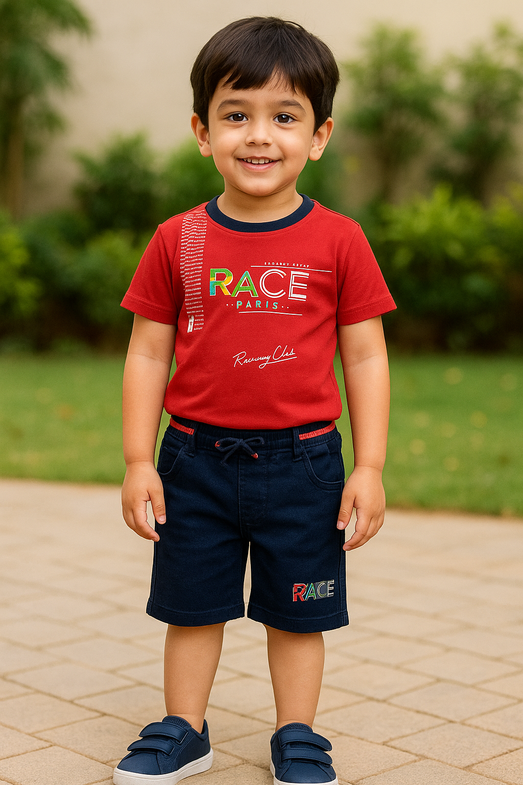 Get your little one ready for the day with our Boys Printed T-Shirt And Shorts set. With a comfortable round neck and short sleeves, your child will love wearing this outfit. The playful typography print adds a fun touch to their wardrobe. Perfect for any casual occasion.