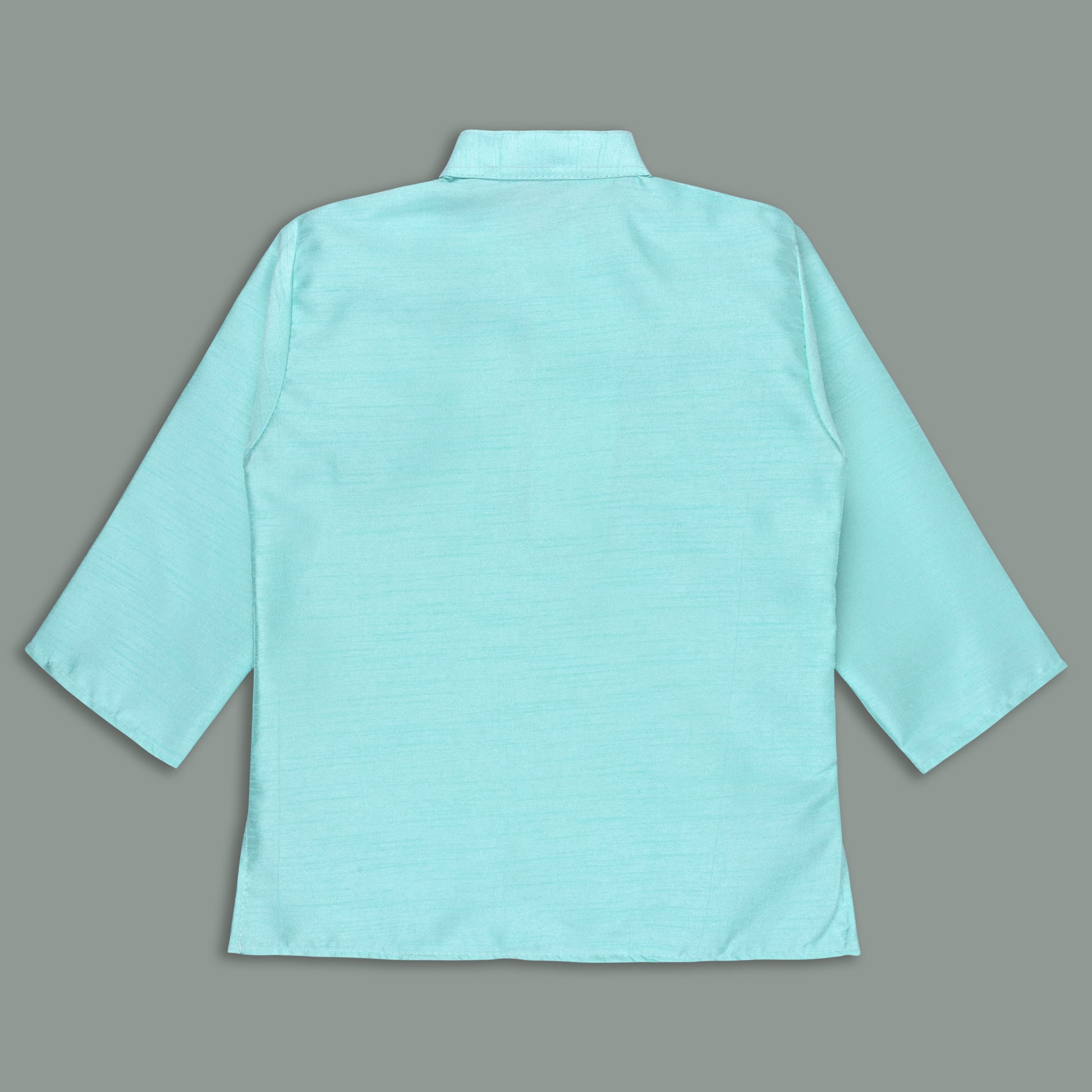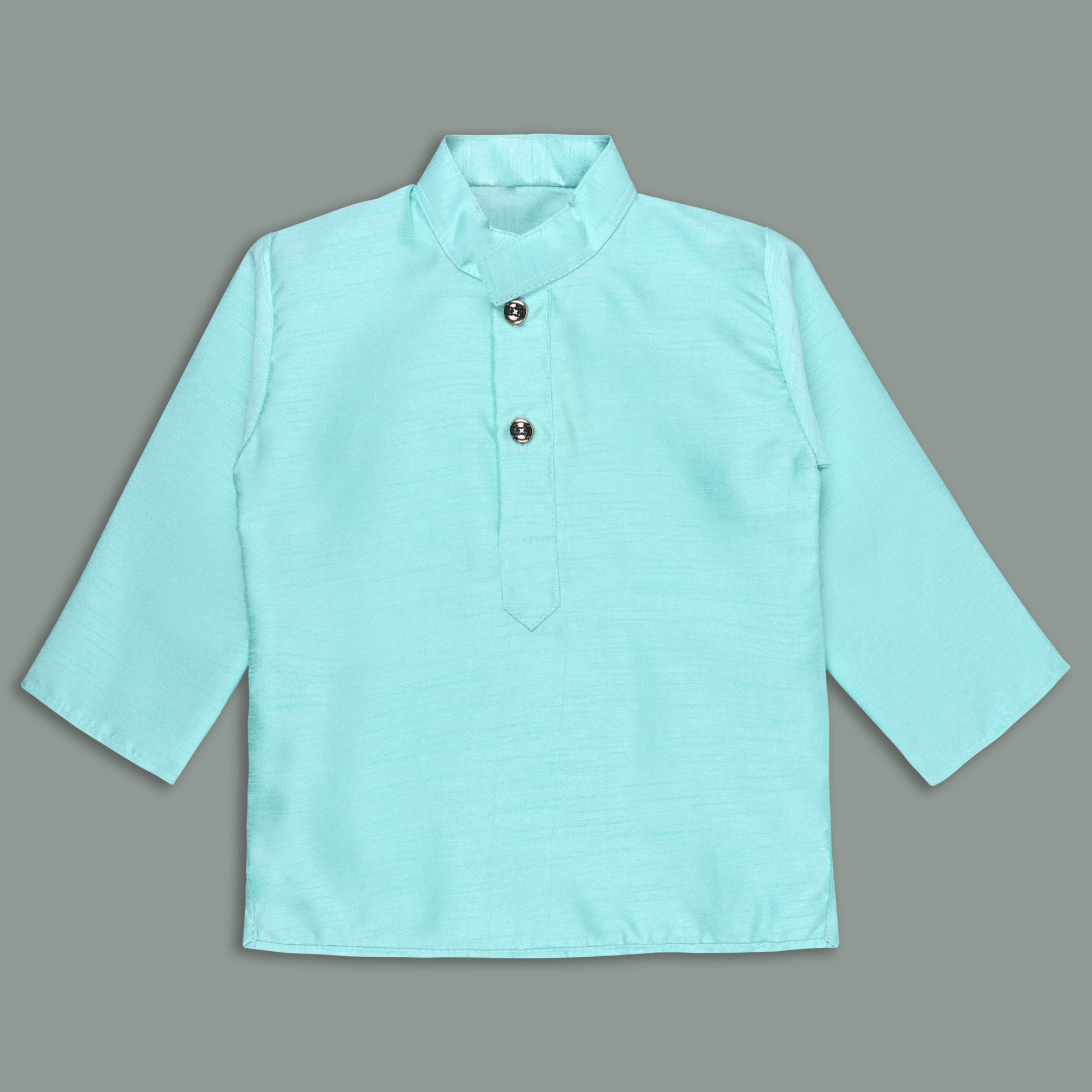 Dress your little one in elegant traditional style with this Aqua Blue Art Silk Dhoti & Kurta Set. Crafted from premium art silk fabric, this outfit offers a soft, smooth feel with a subtle festive sheen. The kurta features a mandarin collar and button placket, paired with a matching dhoti enhanced with a golden zari border for a royal touch.