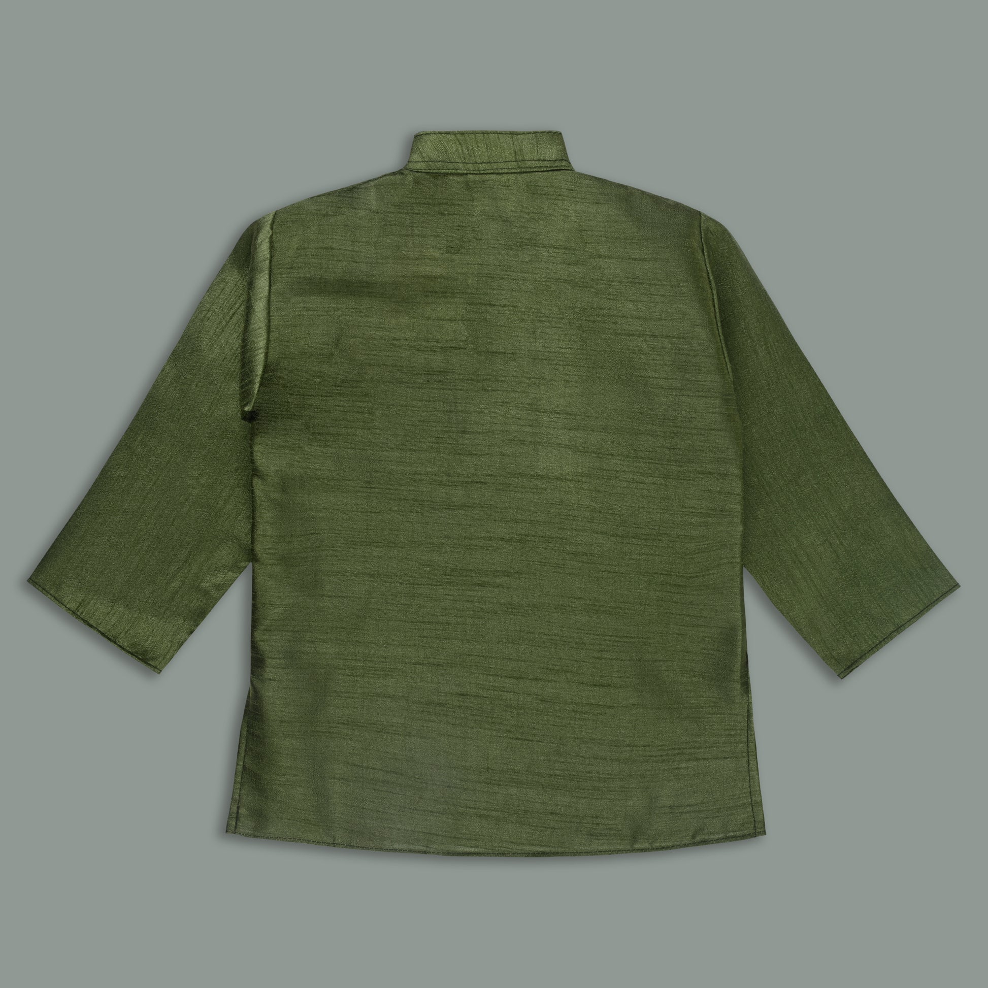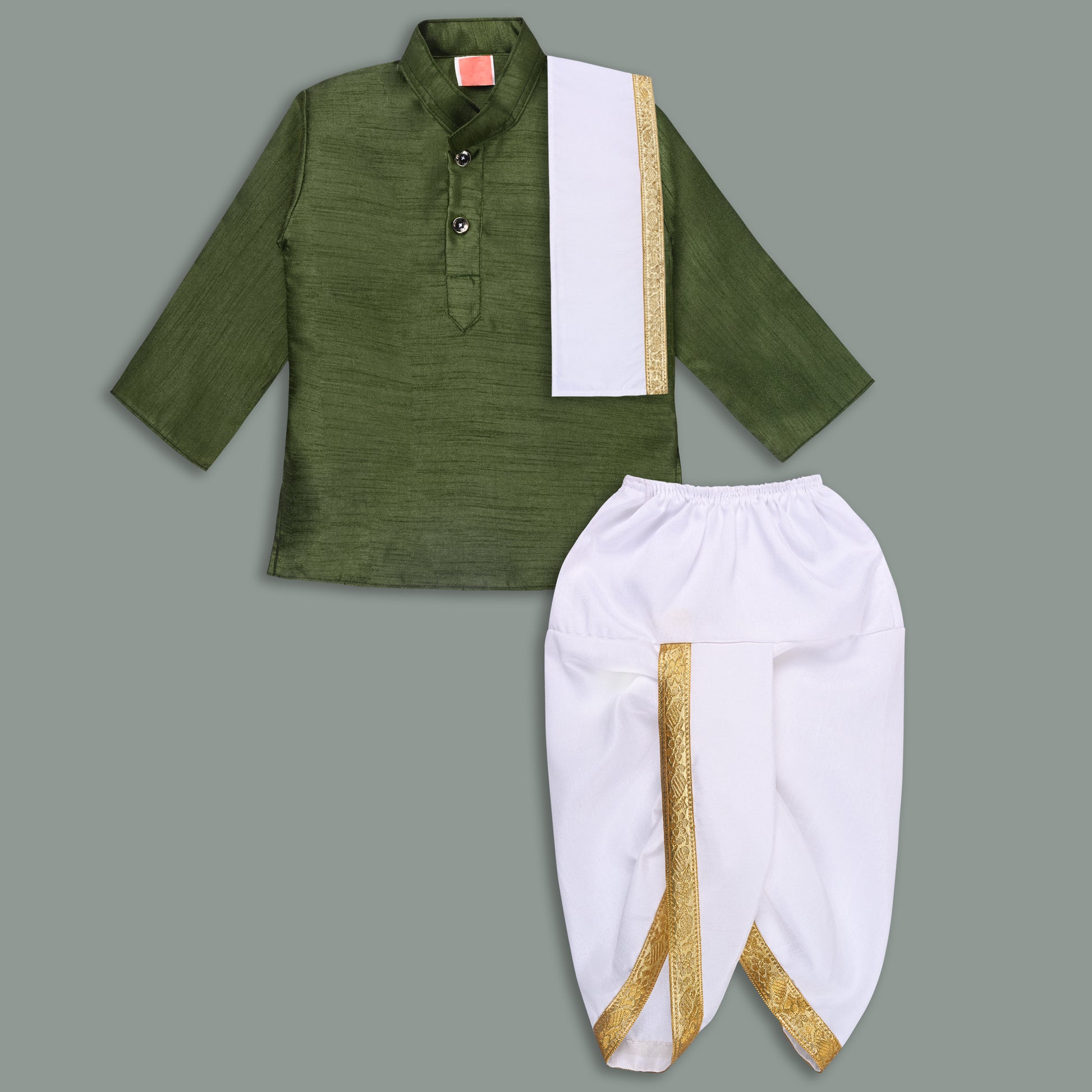 Dress your little one in timeless traditional charm with this elegant kurta and dhoti set, perfect for festive occasions and cultural celebrations. The kurta features a classic mandarin collar with a neat button placket, offering a refined ethnic look. Paired with a comfortable dhoti-style bottom detailed with traditional border accents, the outfit ensures ease of movement while maintaining a rich, festive appeal. The matching angavastram completes the ensemble, adding a graceful finishing touch. Ideal for festivals, weddings, temple visits, school functions, and family gatherings, this set blends tradition, comfort, and style—making it a must-have ethnic outfit for boys.
