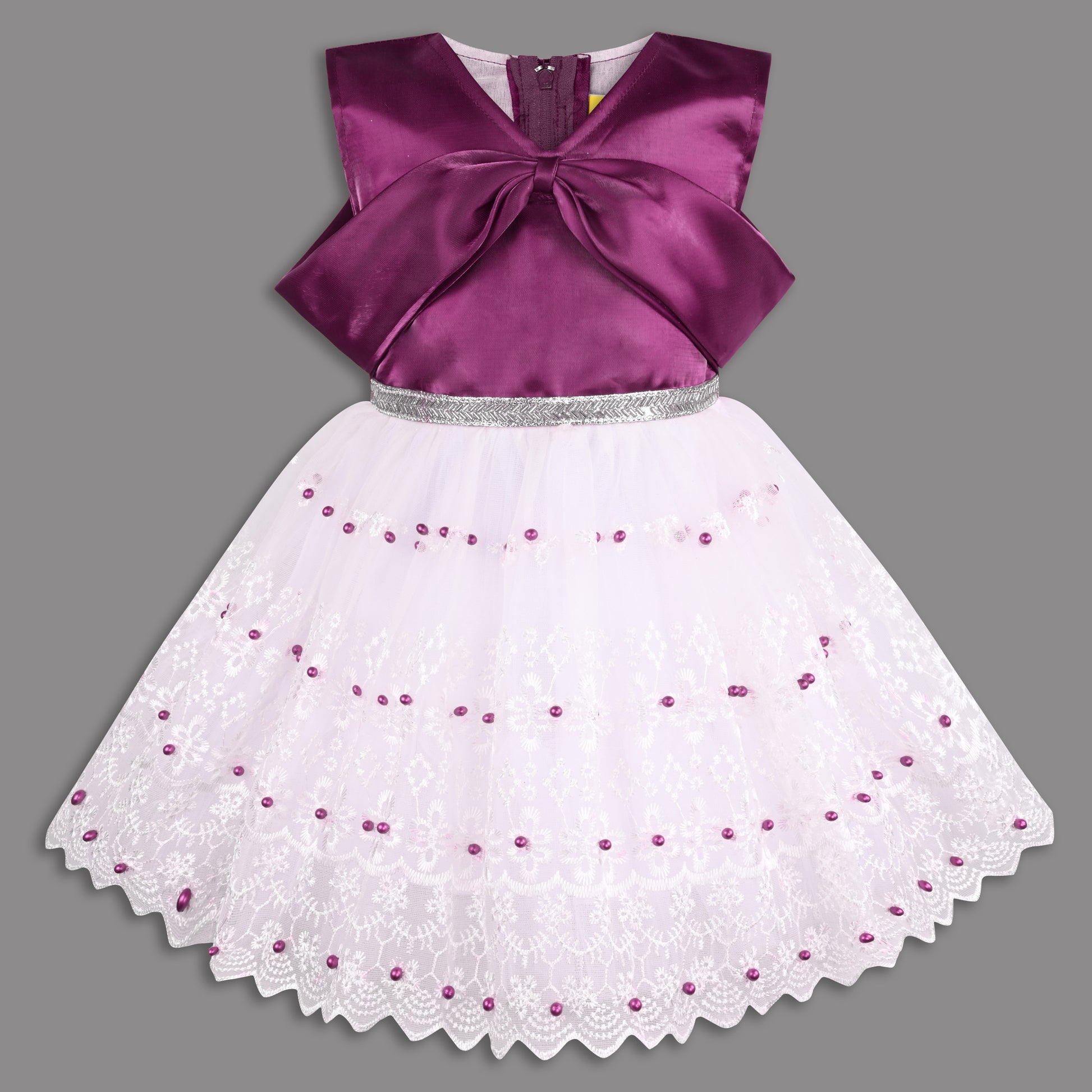 Elegant Satin & Net Party Dress for Girls – Sleeveless Design with Bow and Embellished Lace Skirt