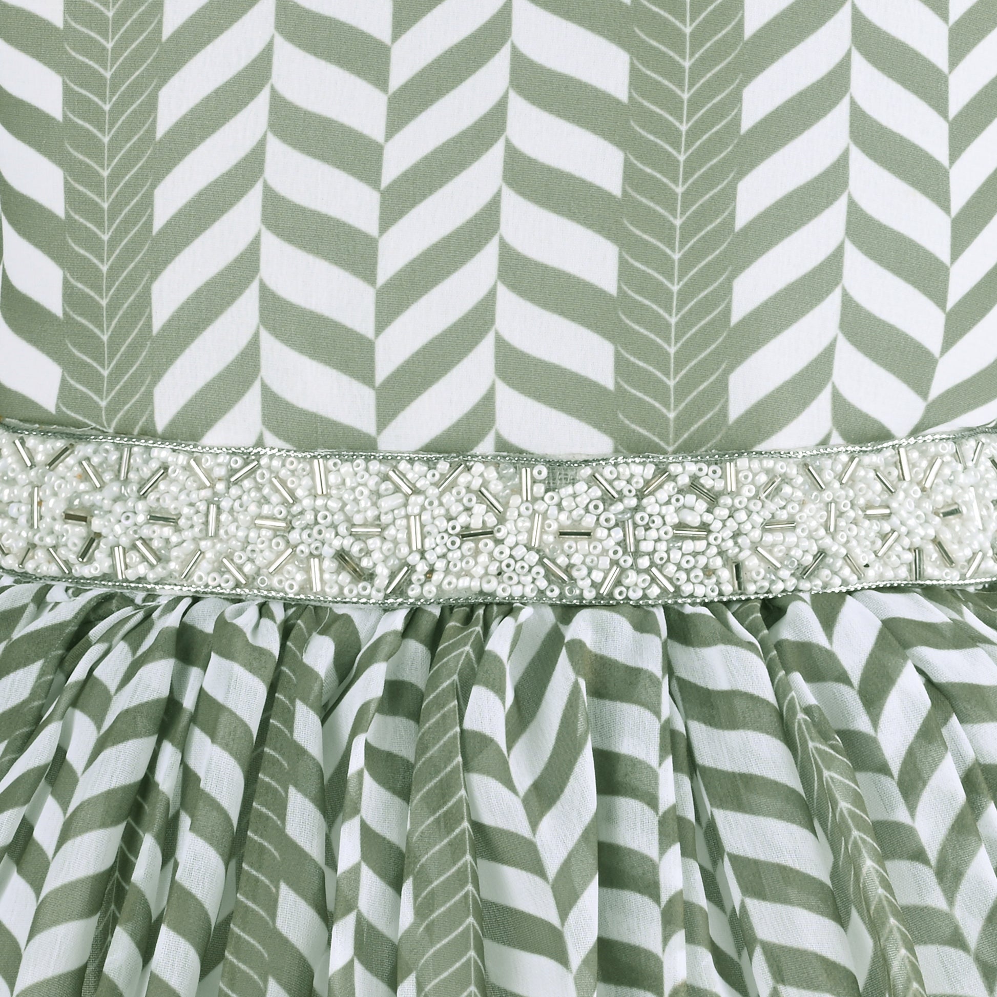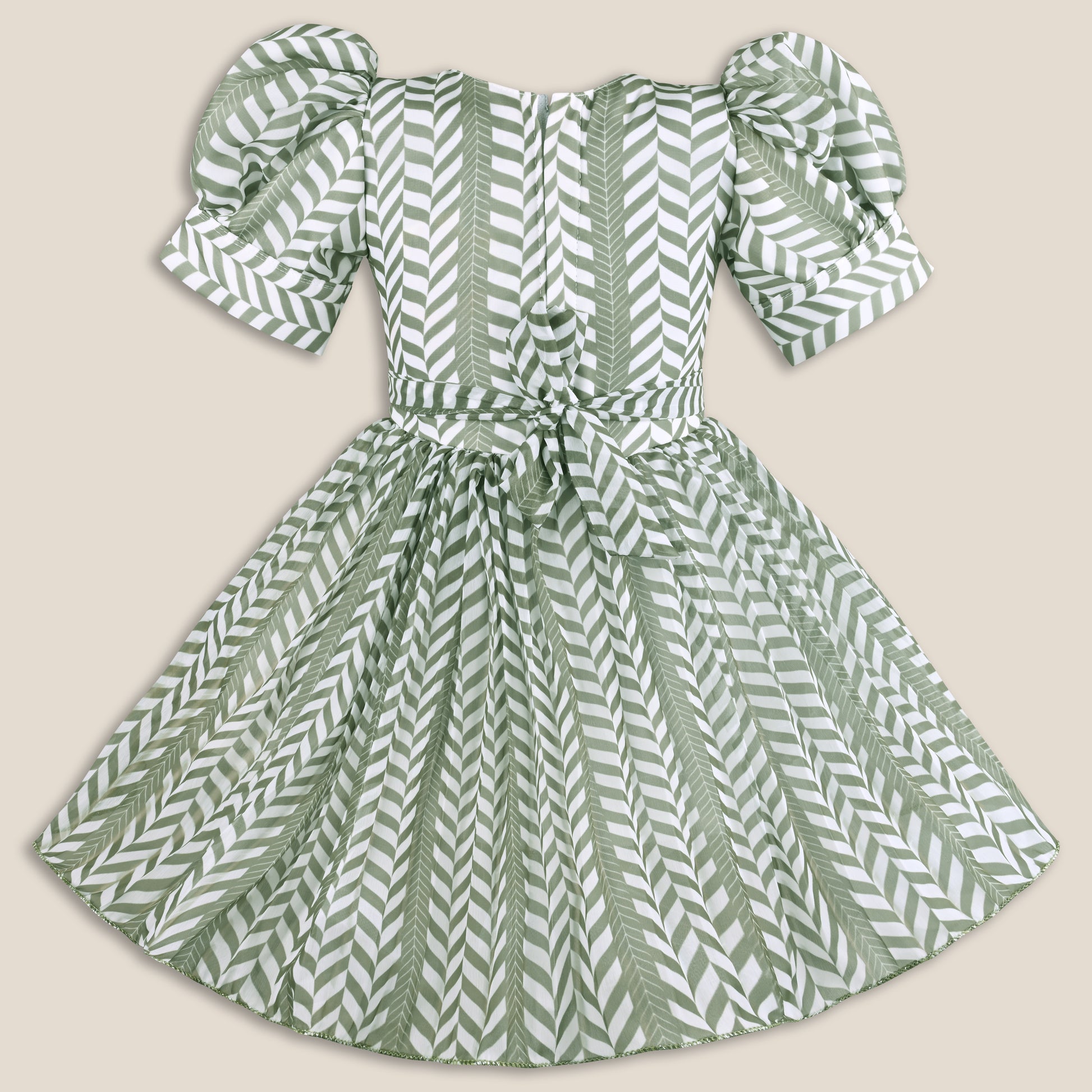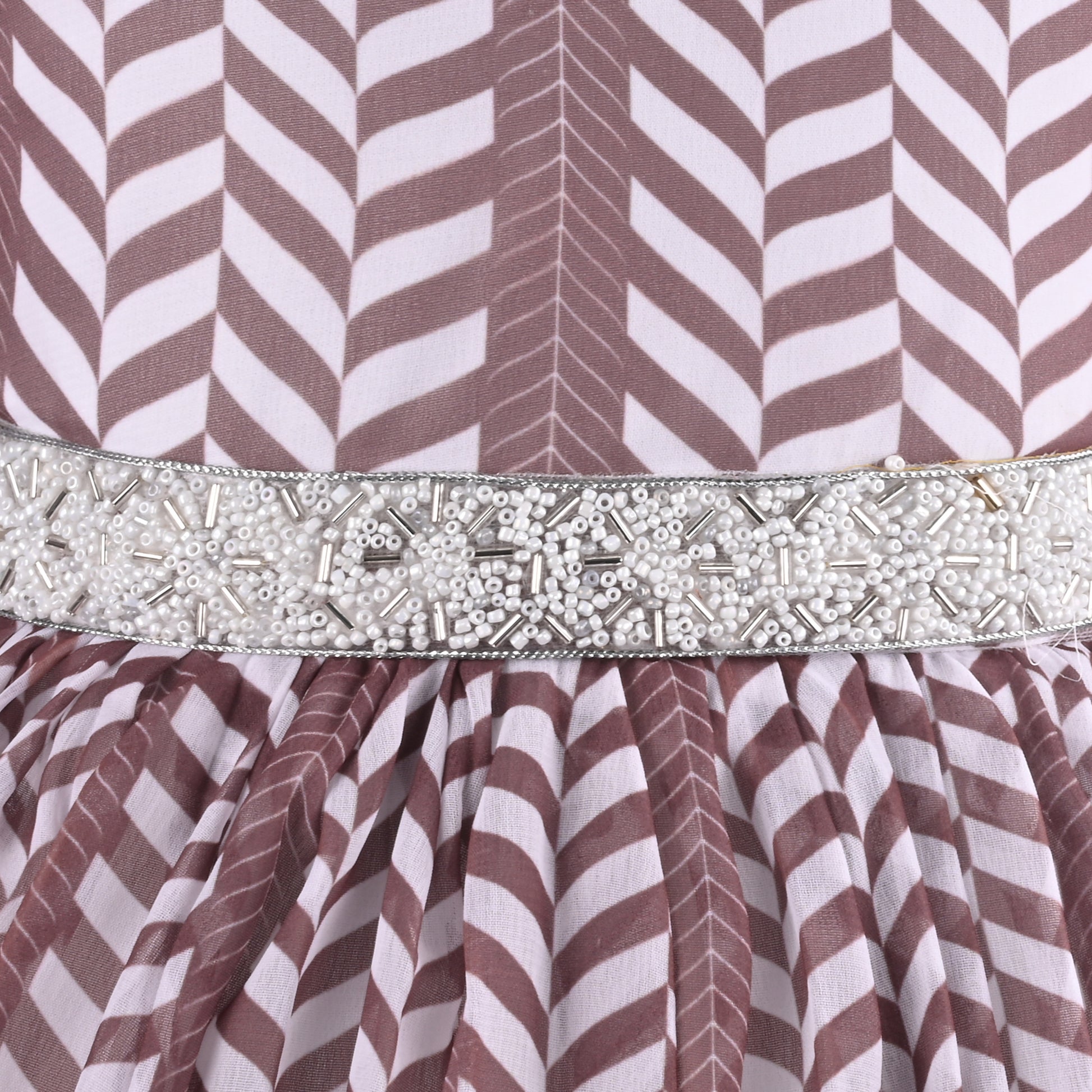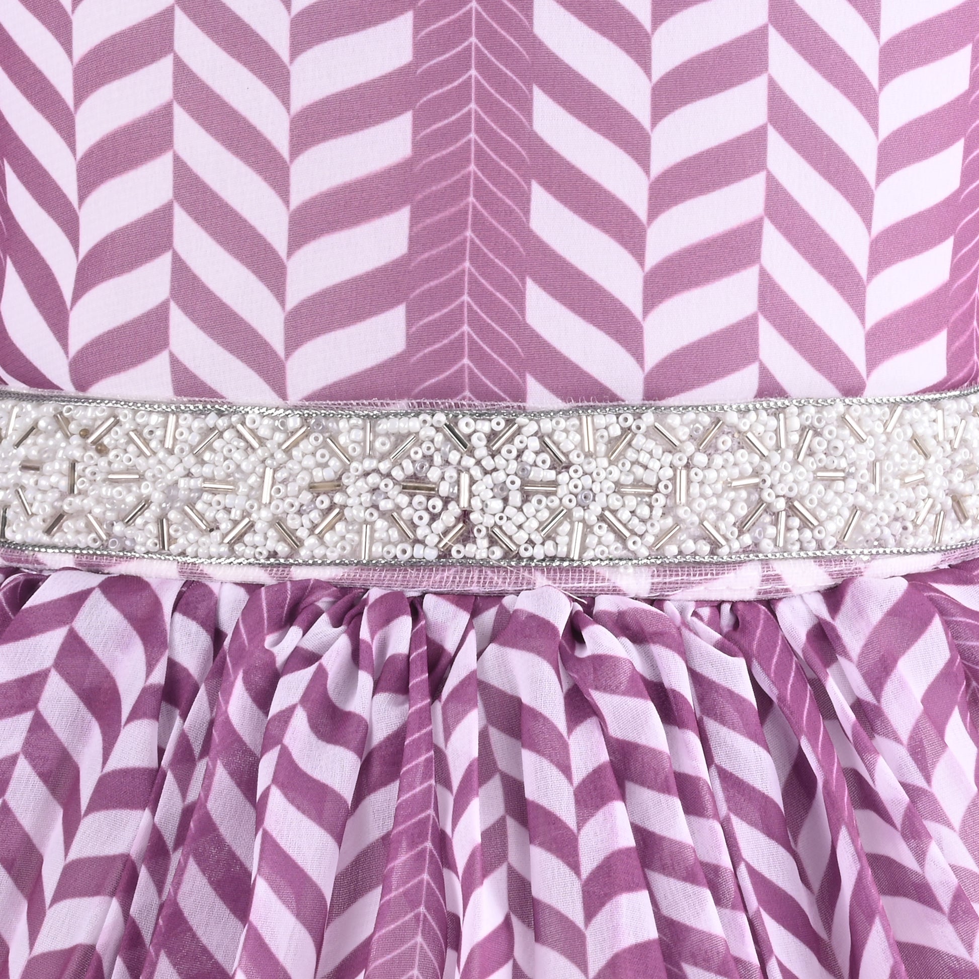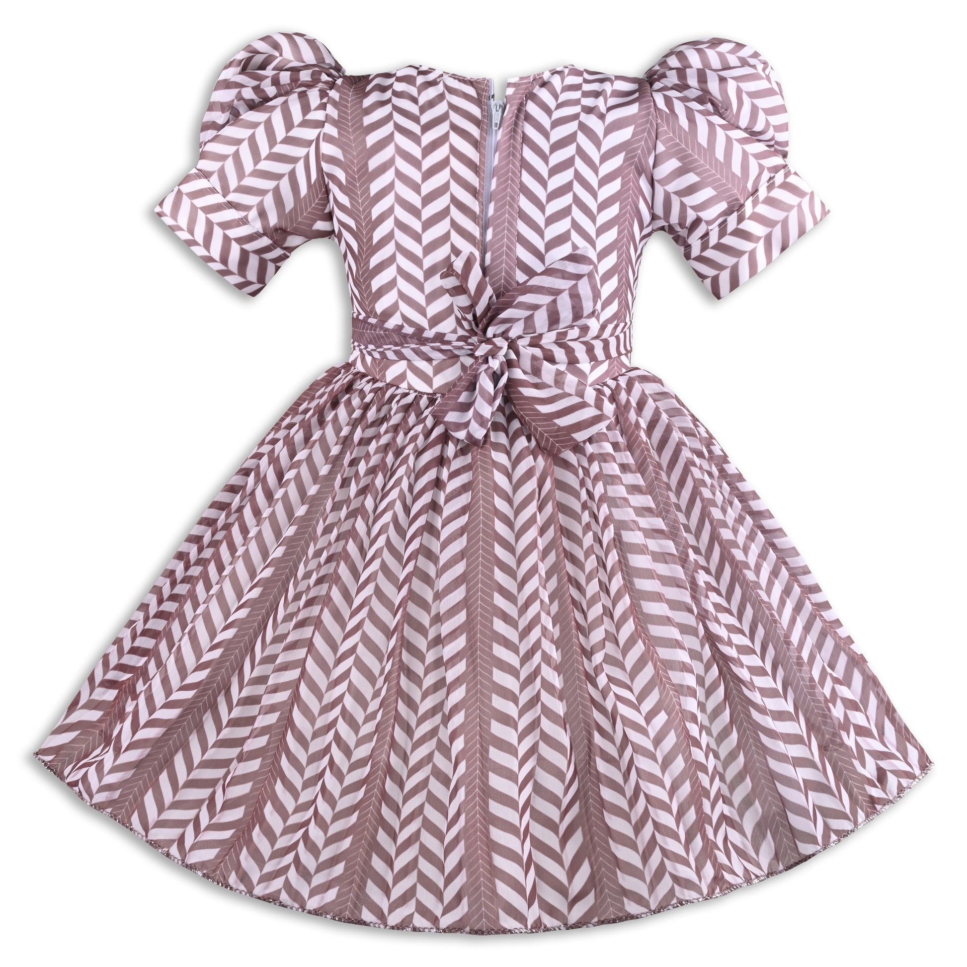 Make your little one shine with this beautifully crafted girls' party dress made from premium quality georgette fabric. Designed with a chic and modern chevron pattern in soft mauve and white tones, this dress effortlessly combines elegance and style. The standout feature is its stylish puff sleeves, adding a charming vintage flair while providing comfortable movement. The round neckline is adorned with delicate embellishments, enhancing its festive appeal. A shimmering embroidered waistband cinches the waist, creating a flattering silhouette and a touch of sparkle. Perfect for birthdays, weddings, or special occasions, this dress promises both comfort and standout style.