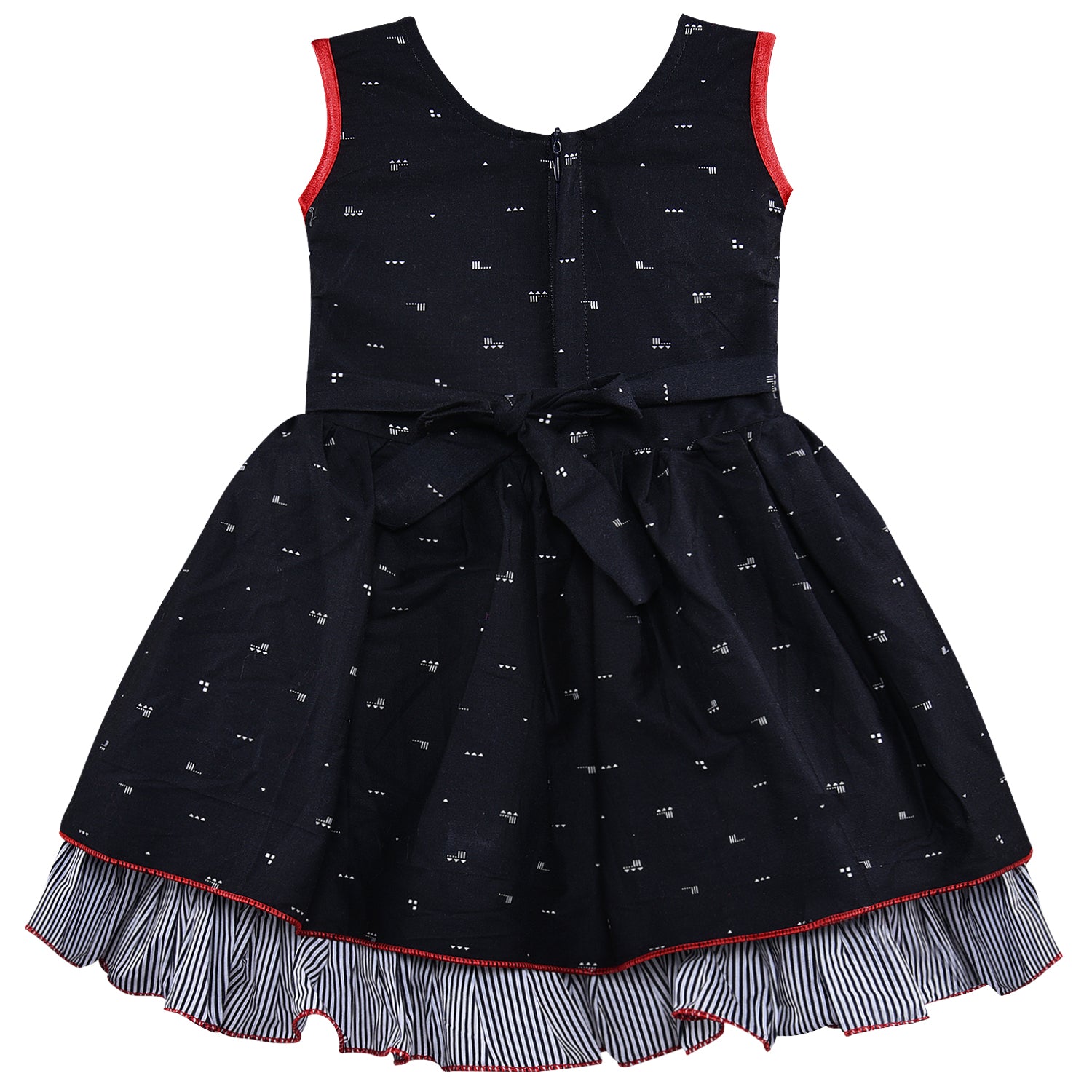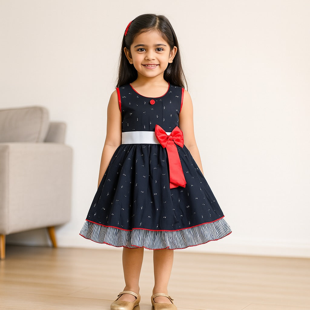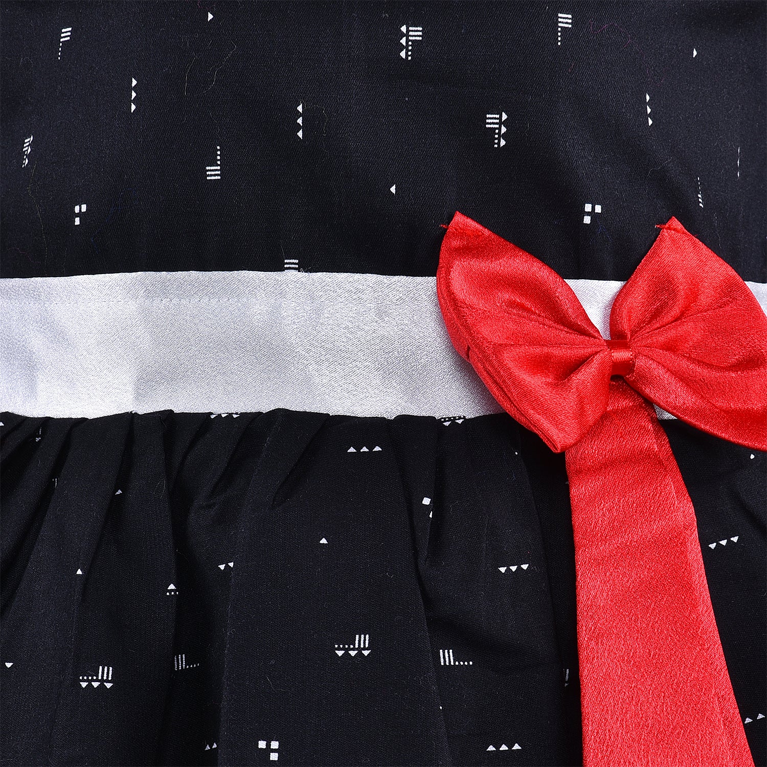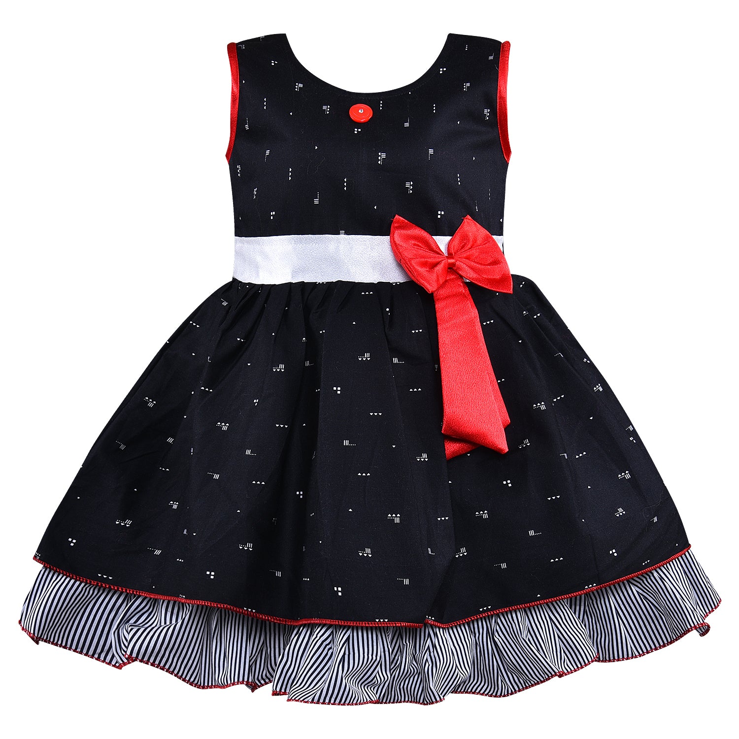 This A-line dress for girls features a fun graphic print and a charming bow detail. With a round neck, zipper closure, and knee length design, it is perfect for casual occasions.