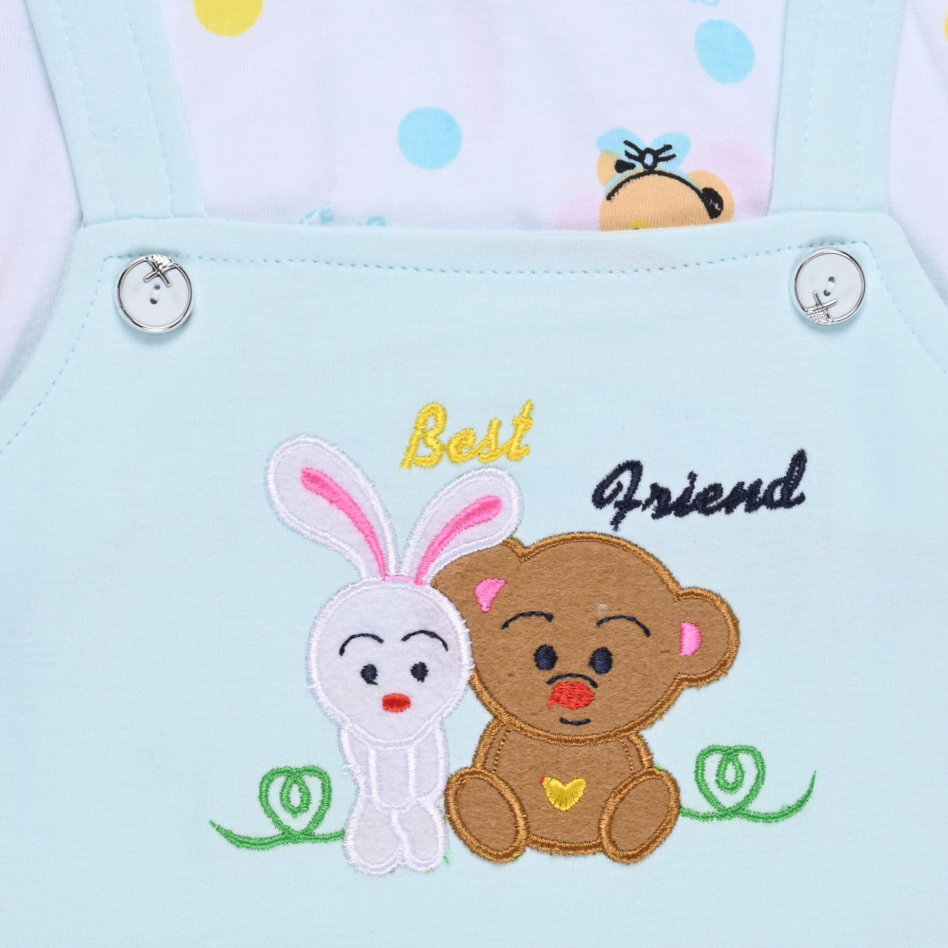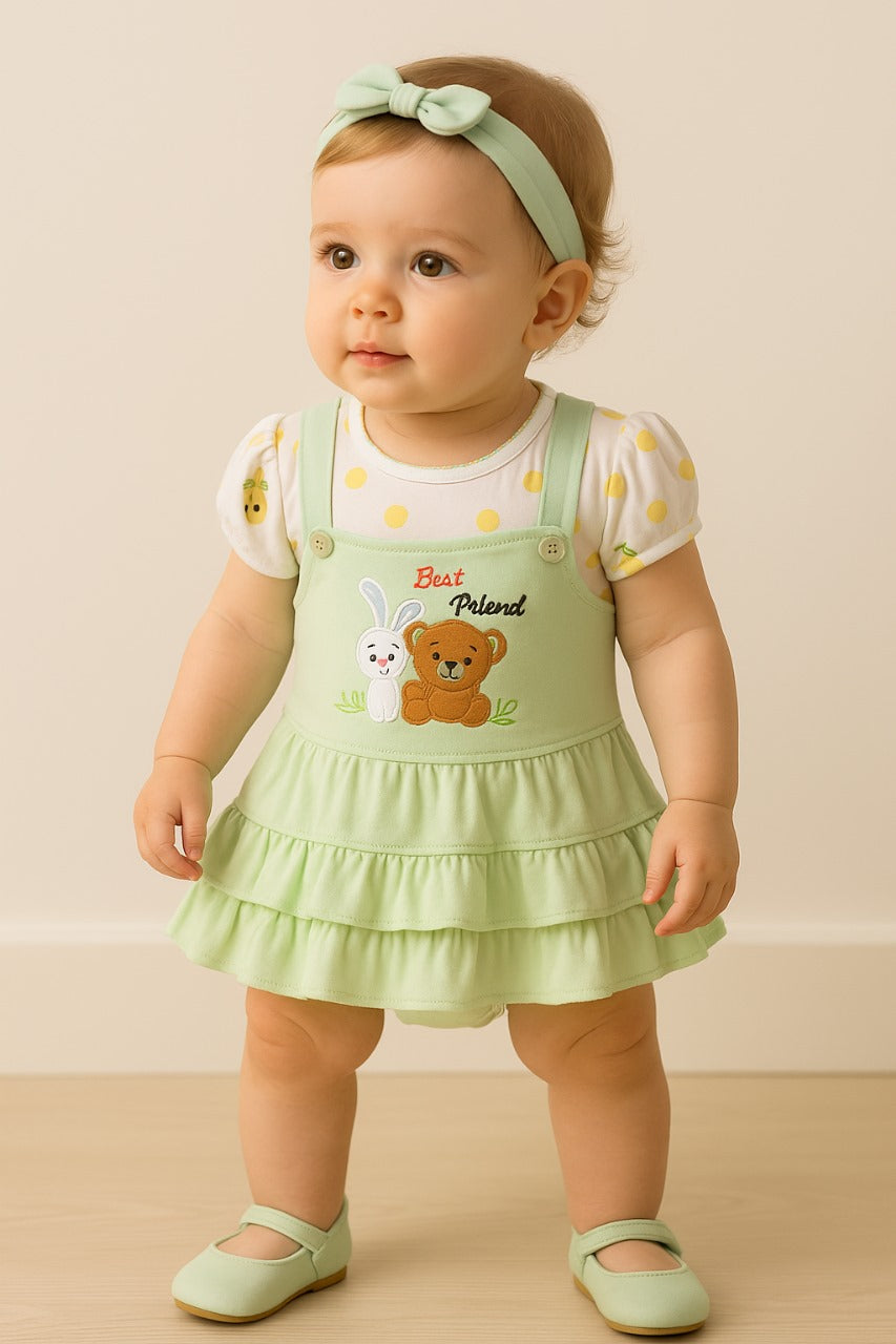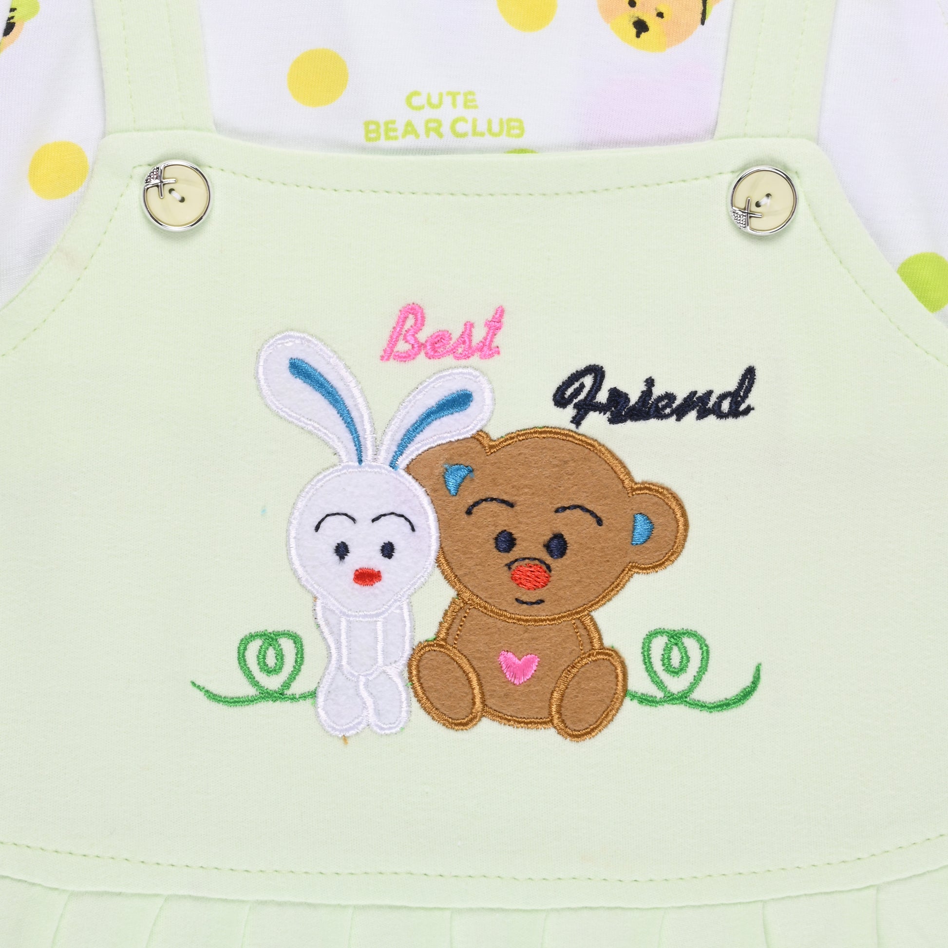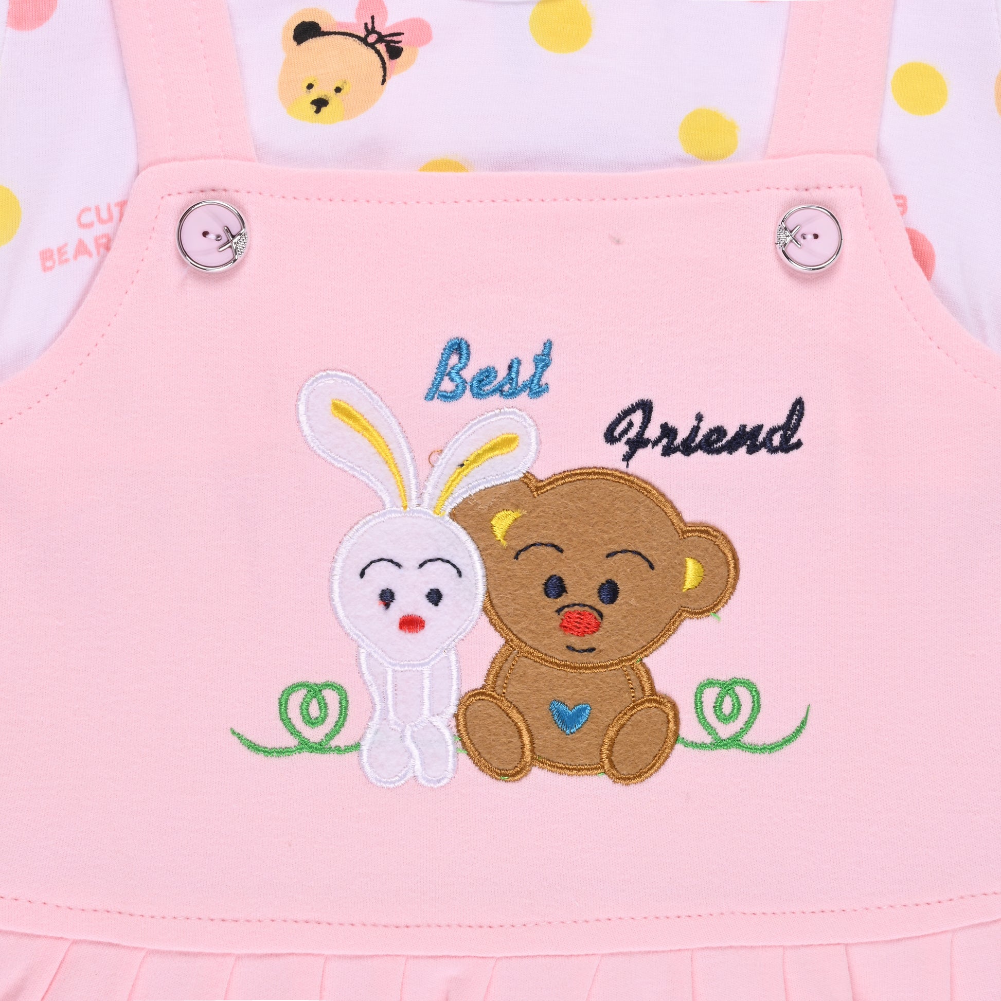 This stylish A-line frock dress features a bold animal print and cute applique details. Made with comfortable cotton fabric and adorned with a round neck and cap sleeves, it's perfect for any occasion. The dress also comes with a matching brief for a complete look.