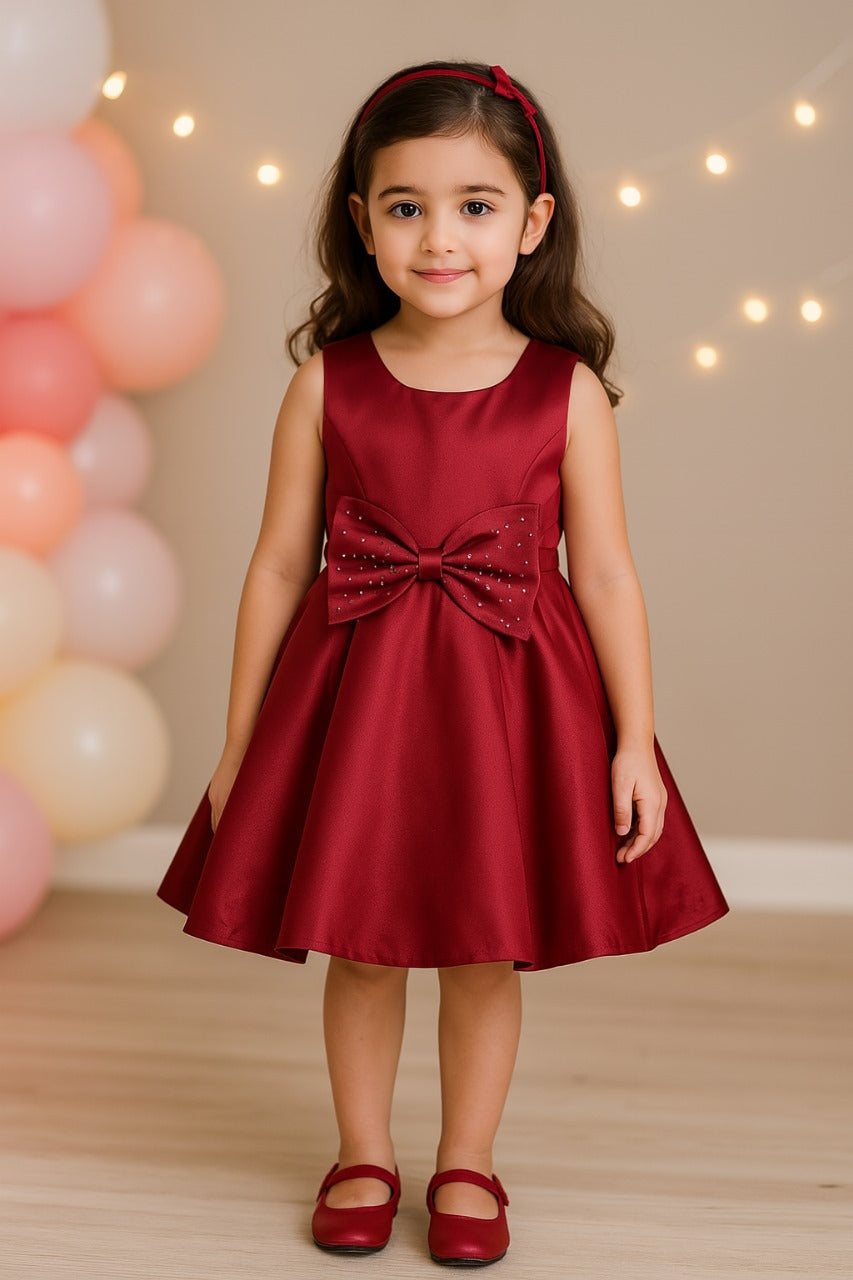 Introducing our party wear girls dress, featuring a round neck design, sleeveless style, and knee-length cut. The circular flare adds a playful touch, while the back tie up and zip opening make it easy to wear. Complete with a charming bow detail, this dress is perfect for any occasion.