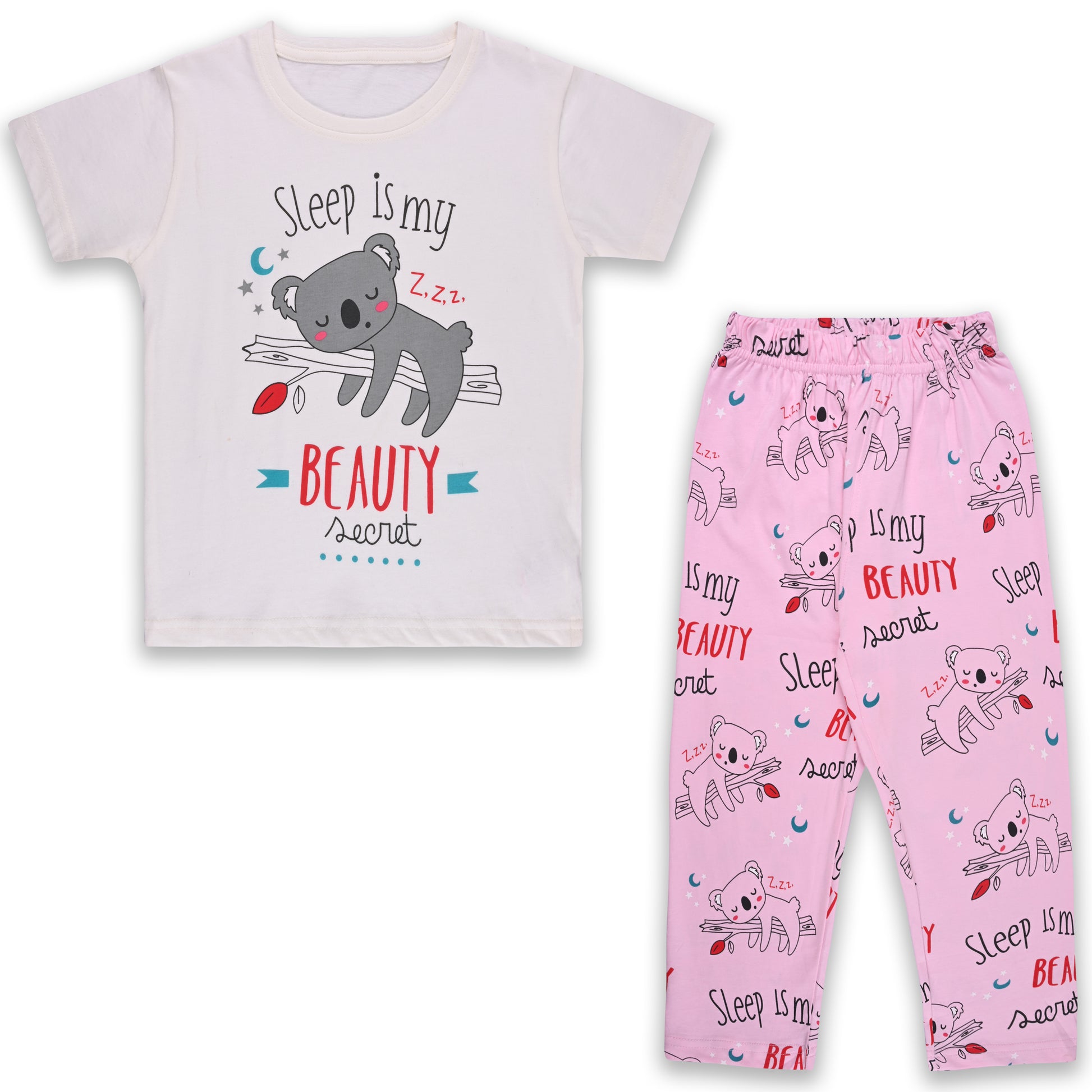 This girls' cute printed cotton nightsuit is designed for ultimate comfort and style, ensuring a restful night’s sleep. Made from soft, breathable cotton, it keeps your little one cozy and cool throughout the night. The set includes a short-sleeve tshirt with an adorable koala print, paired with matching comfortable pajamas for a relaxed fit. The elastic waistband ensures easy wear, while the lightweight fabric allows for free movement. Perfect for bedtime, lounging, or sleepovers, this nightsuit combines cuteness with comfort.