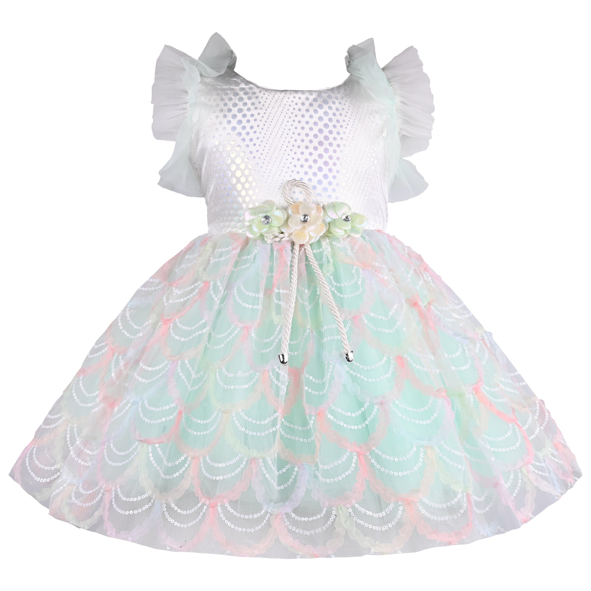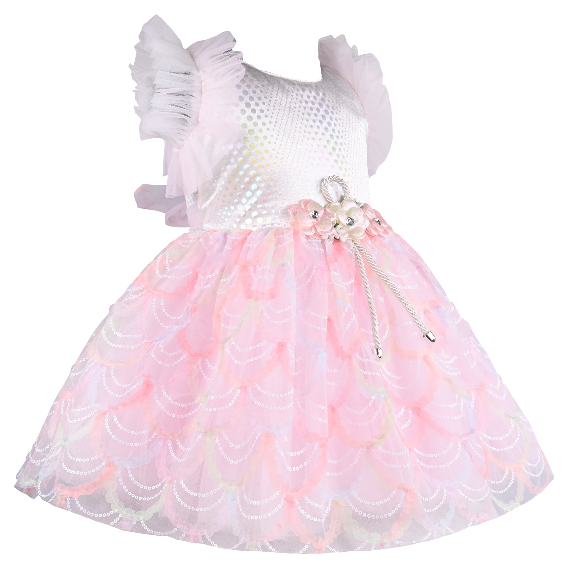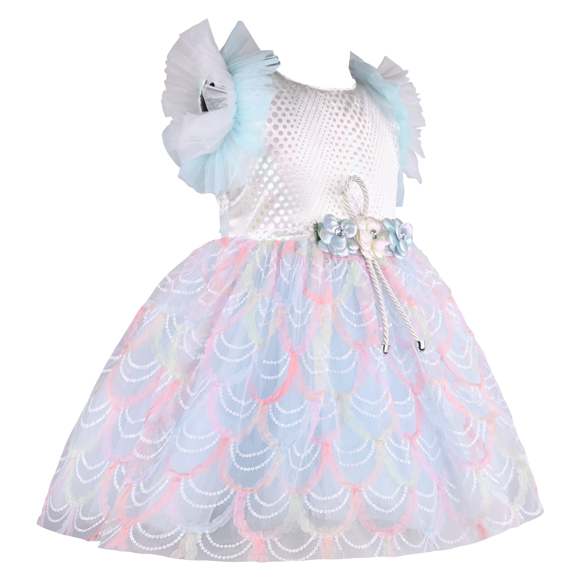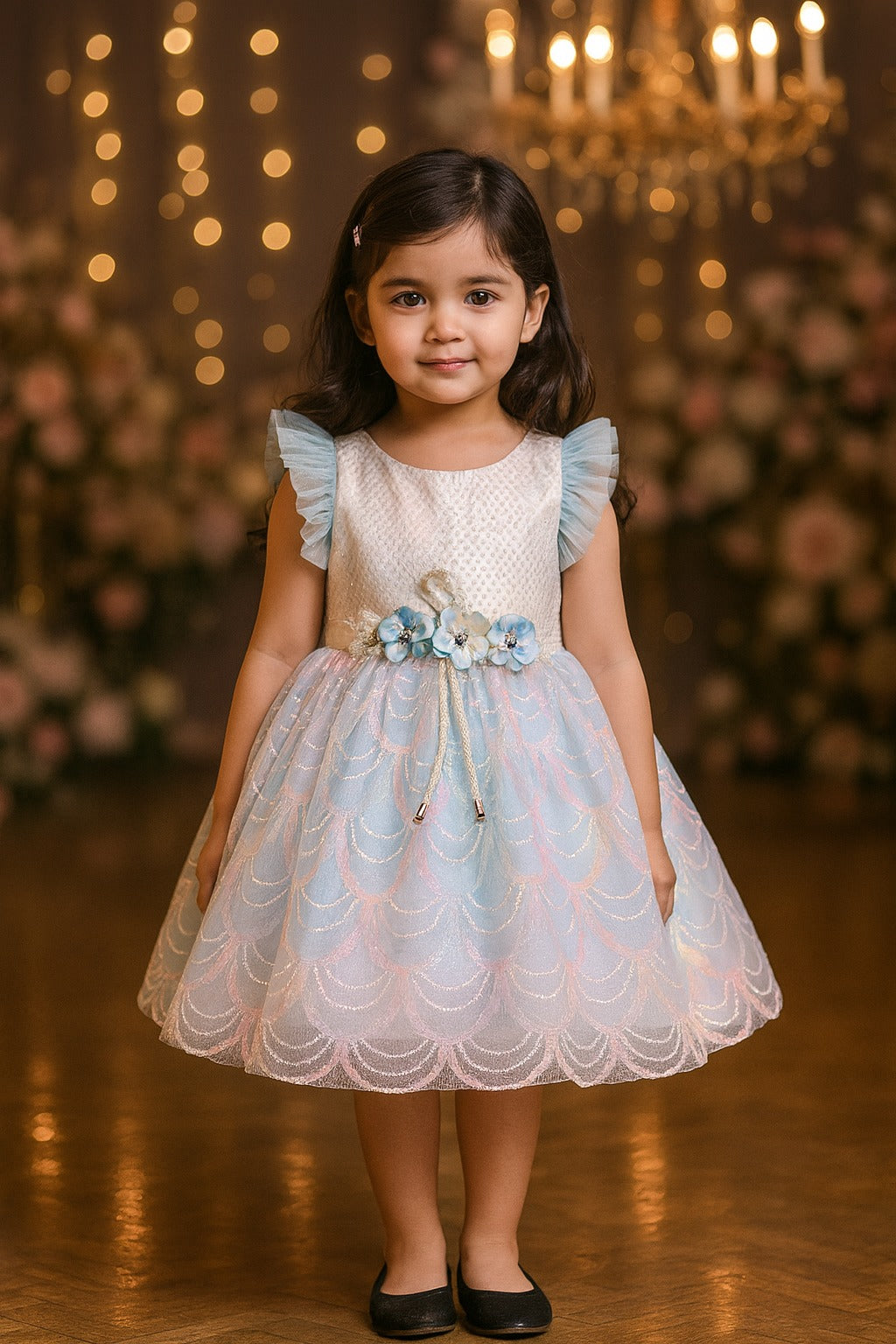 Make your little girl stand out at any celebration with this Girls Floral Embellished Ruffle Flared Party Dress. Adorned with delicate floral detailing and dramatic ruffle layers, this dress offers a fairytale vibe with every twirl. Soft fabric and a flared silhouette ensure both comfort and style—ideal for birthdays, weddings, or festive events.