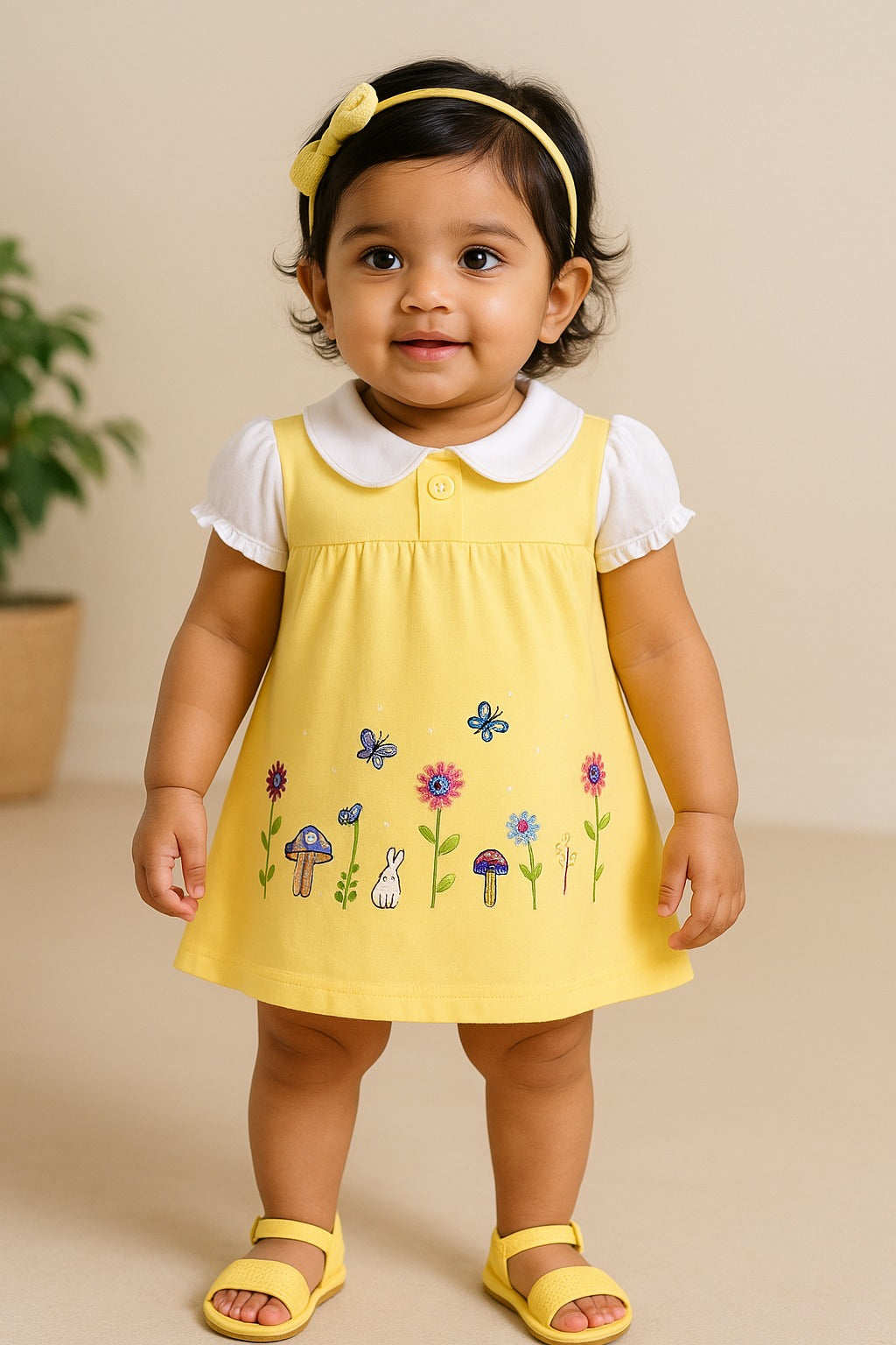 This short sleeve frock is made of soft and breathable cotton, with beautiful embroideries that add a touch of elegance. The A-line silhouette flatters all body types, while the included brief ensures comfort and practicality. Perfect for your little girl's summer wardrobe.