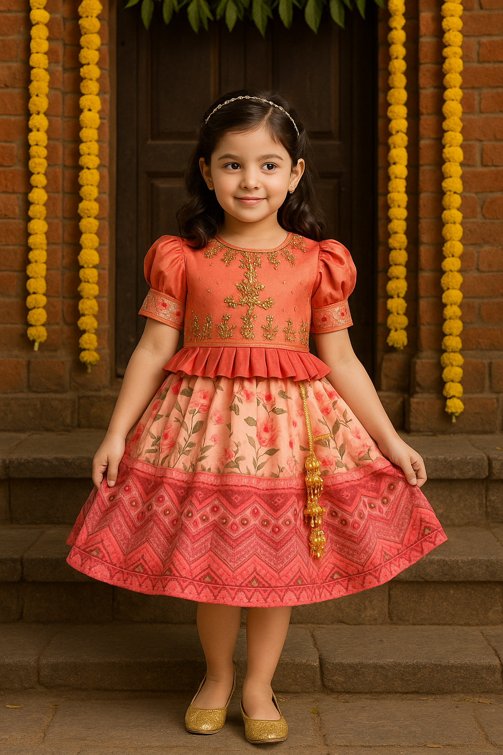 Dress her in timeless elegance with thisΒ Baby Girl Navratri DressΒ β a bead embellished printed silk ethnic outfit that beautifully blends traditional charm with festive flair. Made from rich silk fabric, it features an intricate all-over print and delicate bead embellishments that enhance its celebratory look. Soft, comfortable, and gracefully designed, itβs perfect for Navratri, weddings, festivals, or special family events. The ethnic cut ensures a flattering fit, while the thoughtful detailing makes it a standout piece in her festive wardrobe.