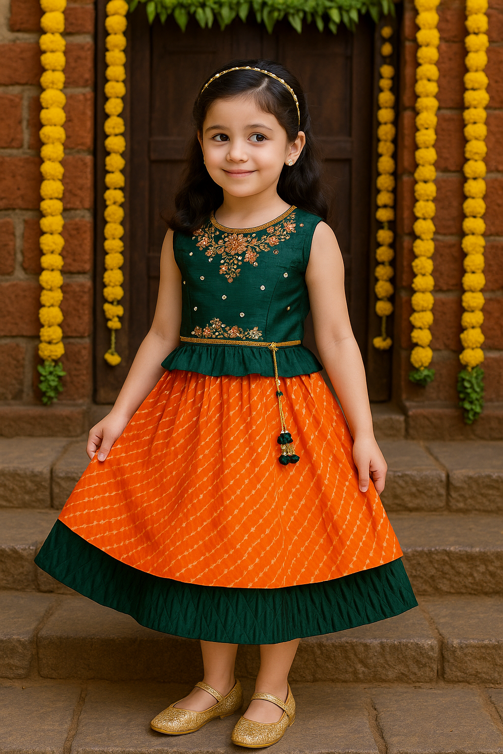 Dress her in timeless elegance with this Baby Girl Navratri Dress – a bead embellished printed silk ethnic outfit that beautifully blends traditional charm with festive flair. Made from rich silk fabric, it features an intricate all-over print and delicate bead embellishments that enhance its celebratory look. Soft, comfortable, and gracefully designed, it’s perfect for Navratri, weddings, festivals, or special family events. The ethnic cut ensures a flattering fit, while the thoughtful detailing makes it a standout piece in her festive wardrobe.