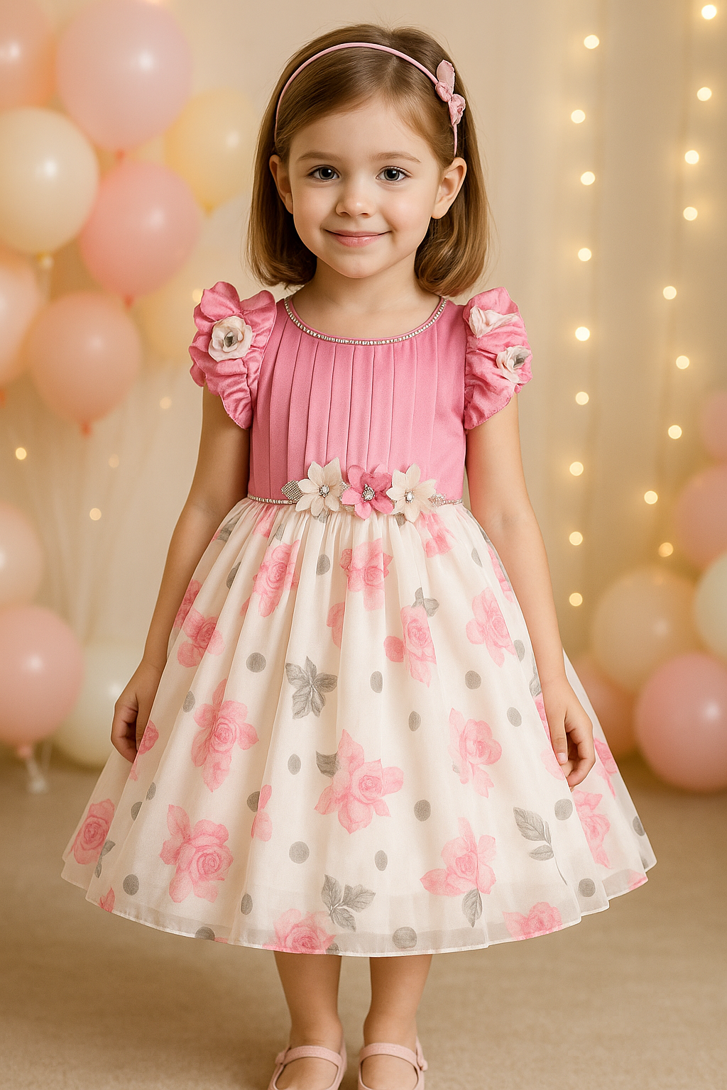 Girls Floral Print Embellished Balloon Party Dress