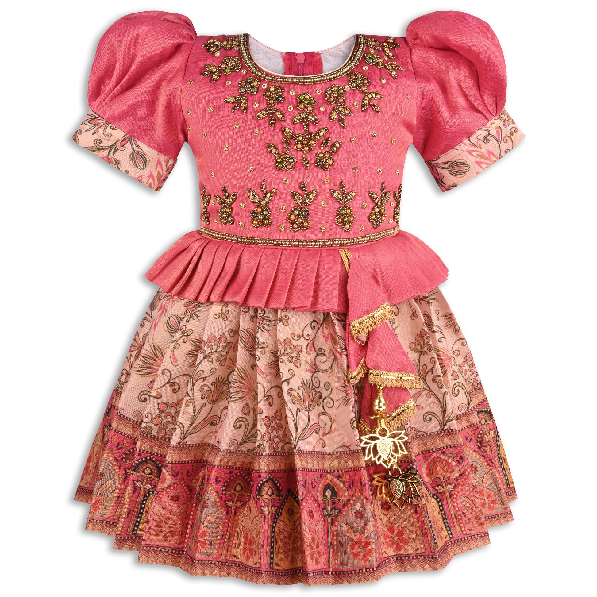 Let her shine at every celebration with this elegant Girls Festive & Wedding Dress, crafted in luxurious art silk with a graceful floral print and delicate bead embellishments. The charming puff sleeves add a vintage-inspired touch, while the rich fabric and festive detailing make it perfect for weddings, festivals, and special occasions. Designed for both comfort and style, this dress blends tradition with a modern flair, making it a standout piece in her ethnic wardrobe.