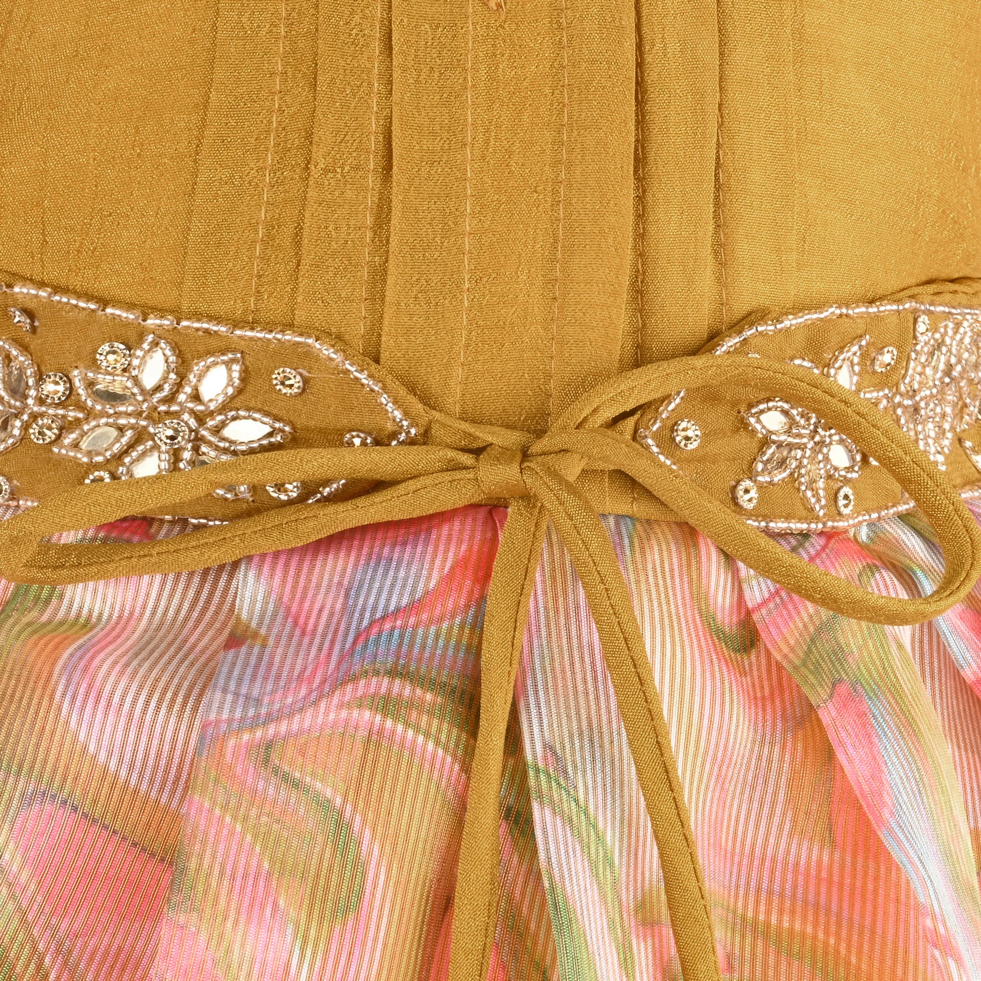 - Design: Floral print with intricate bead embellishments