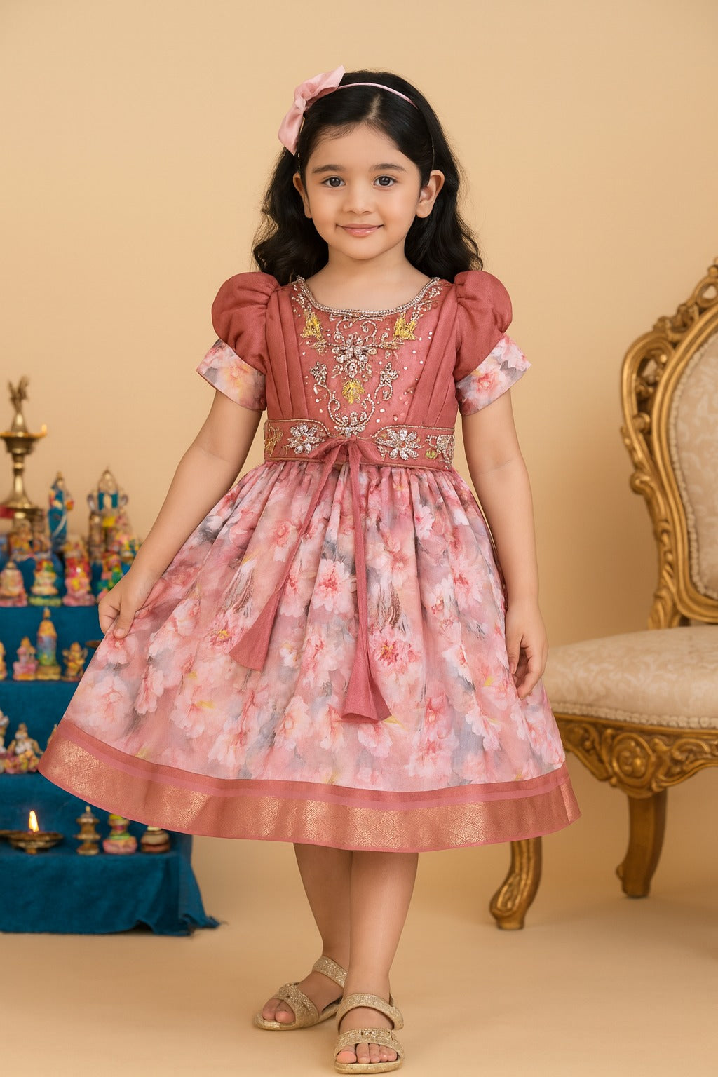 Dress her in timeless festive charm with this Girls Organza Ethnic Fit-and-Flare Dress. Embellished with floral beads and finished with a rich zari border, it blends modern elegance with traditional flair. The puff sleeves add a vintage-inspired touch, while the waist belt ensures a flattering silhouette. Crafted for comfort and breathability, this dress is an ideal choice for Navratri garba nights, weddings, and cultural festivities, making her look radiant and graceful on every special occasion.