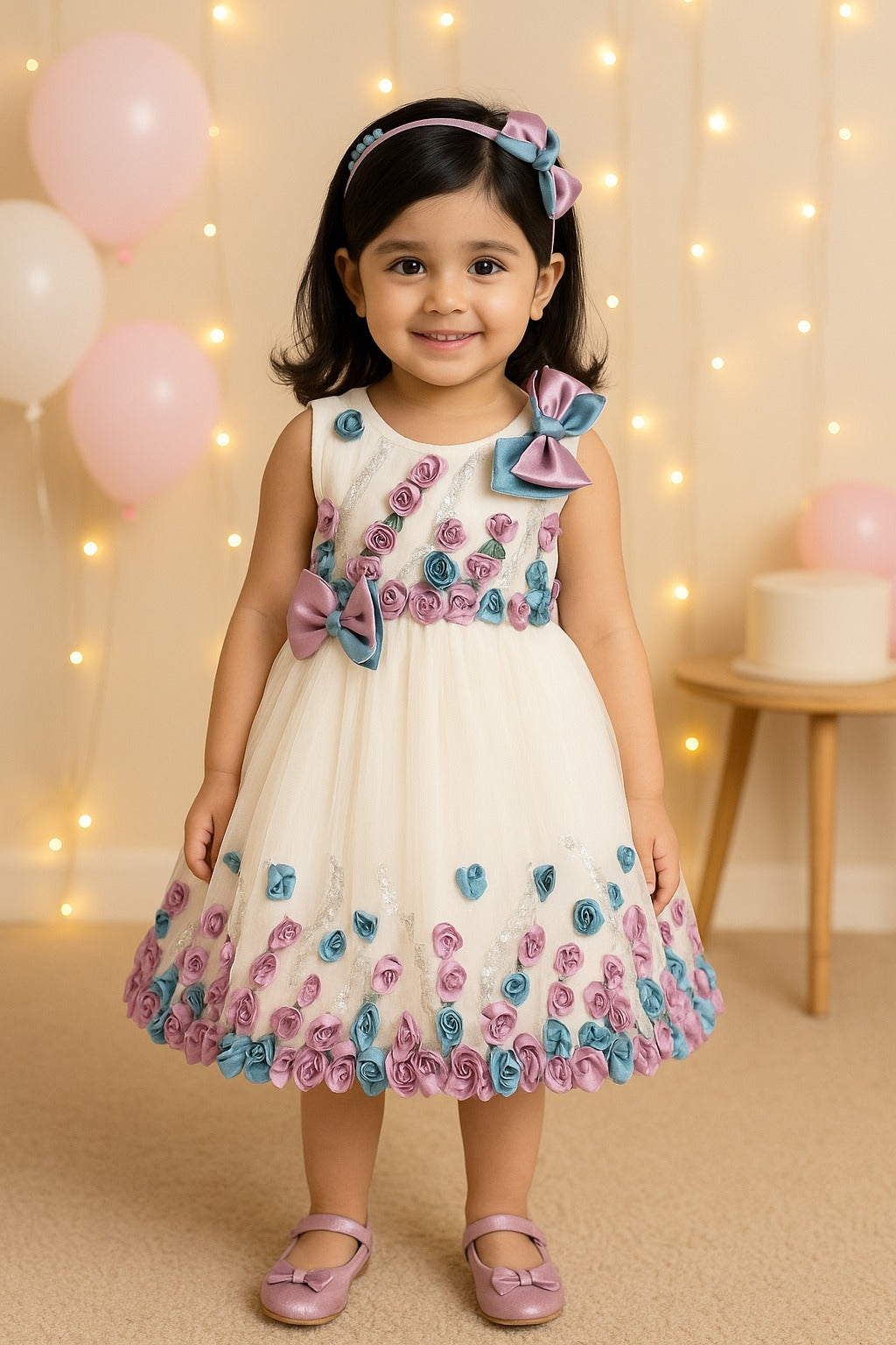 This girls' floral bow applique sequined net party dress is a dazzling choice for special occasions. Featuring a delicate net overlay adorned with shimmering sequins, it adds a touch of sparkle and elegance. The floral applique detailing enhances its charm, while the stylish bow accent adds a sweet, graceful touch. Designed with a soft inner lining for comfort, this dress ensures ease of movement while maintaining a voluminous and princess-like silhouette. Perfect for birthdays, weddings, and festive celebrations, it pairs beautifully with ballet flats and matching accessories for a stunning party-ready look.