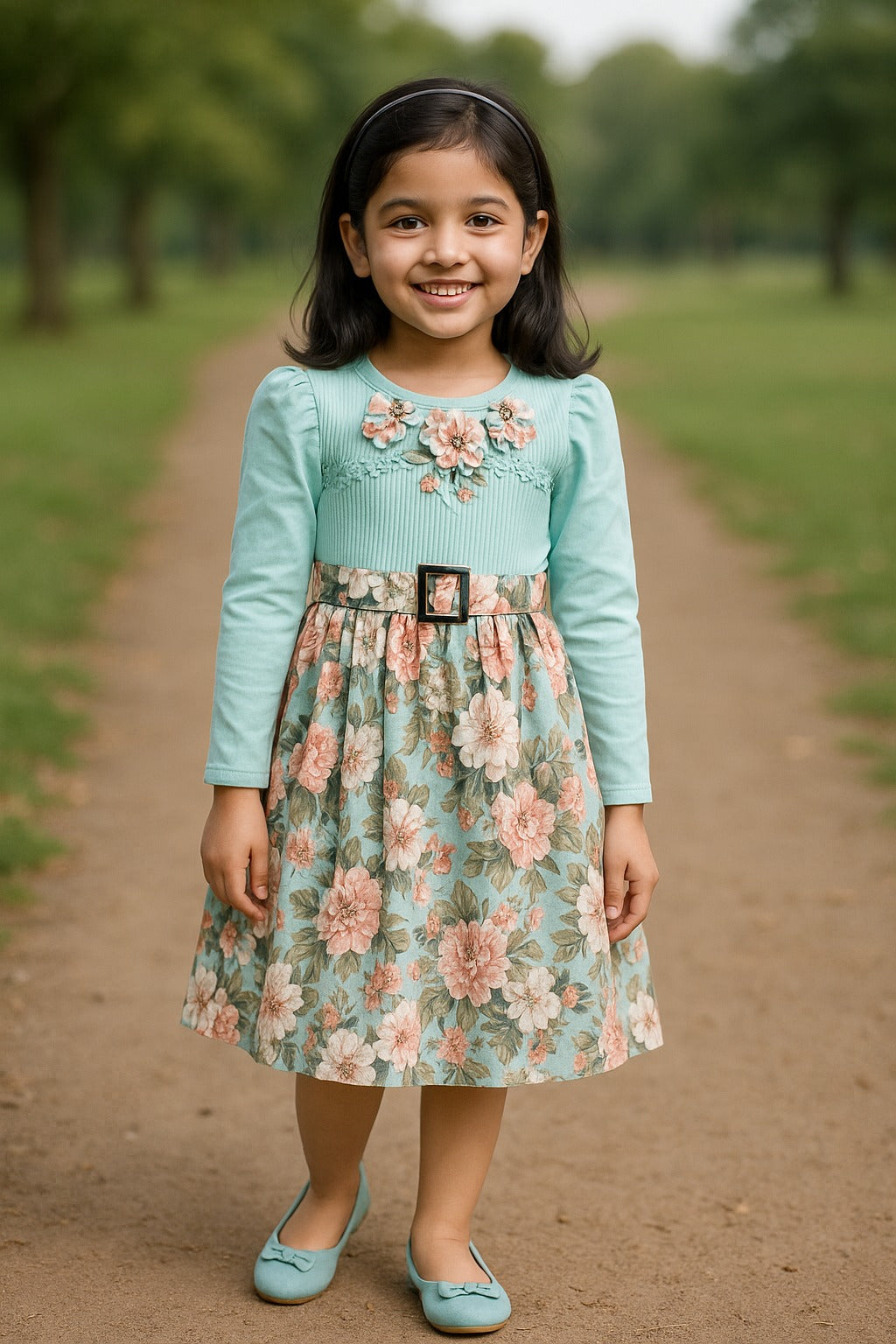 Let her charm shine in this Girls Printed Pleated Casual Dress, designed with thoughtful floral detailing and a flattering silhouette. The dress features long sleeves for a touch of elegance and pleated detailing that gives it a twirl-worthy finish. Crafted from soft, breathable fabric, it's gentle on the skin and great for all-day wear. A matching belt cinches at the waist to enhance the fit and add a stylish touch. Whether she's heading to a casual outing, birthday party, or lunch with family, this dress brings together comfort and effortless style.