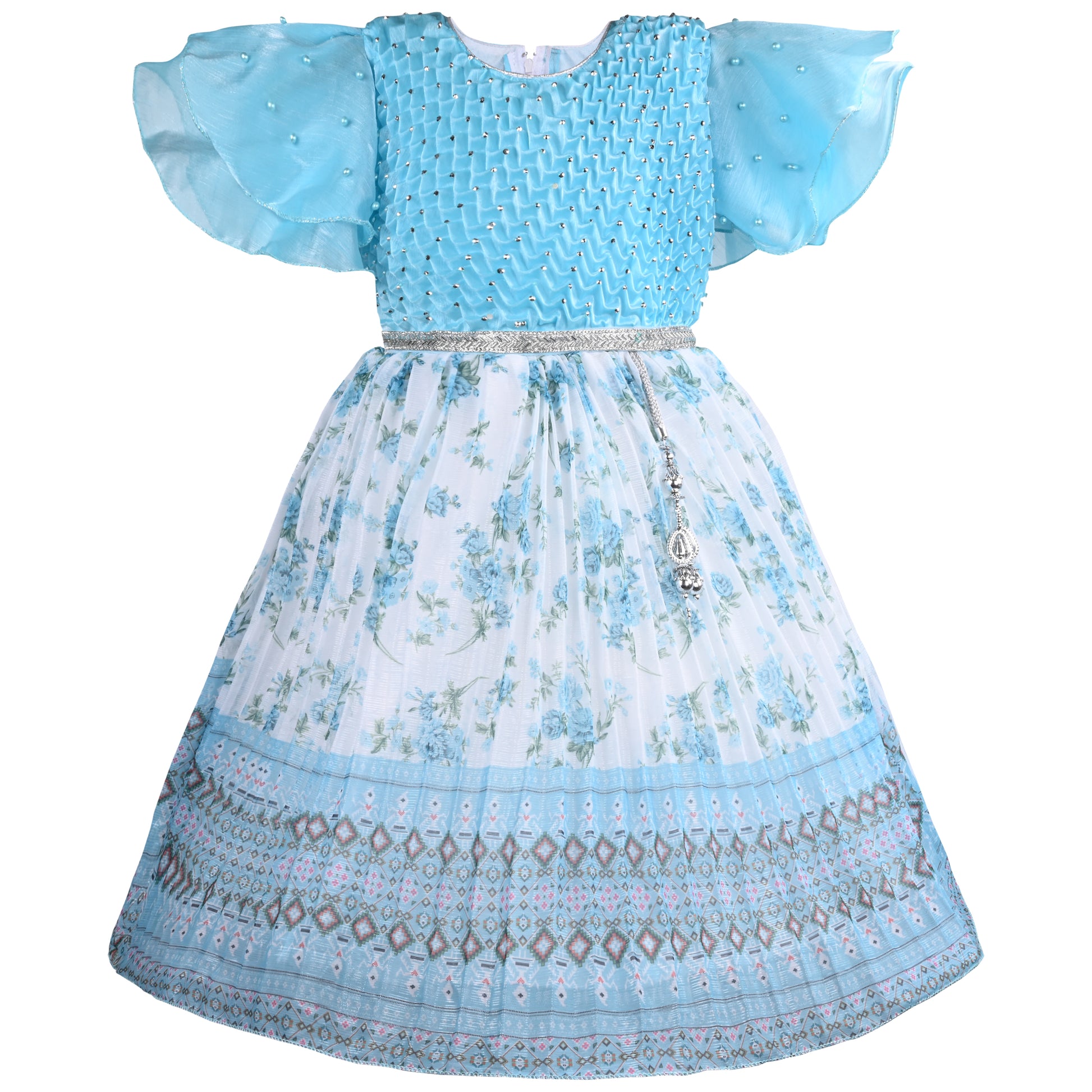 Girls Floral Print Embellished Flared Dress