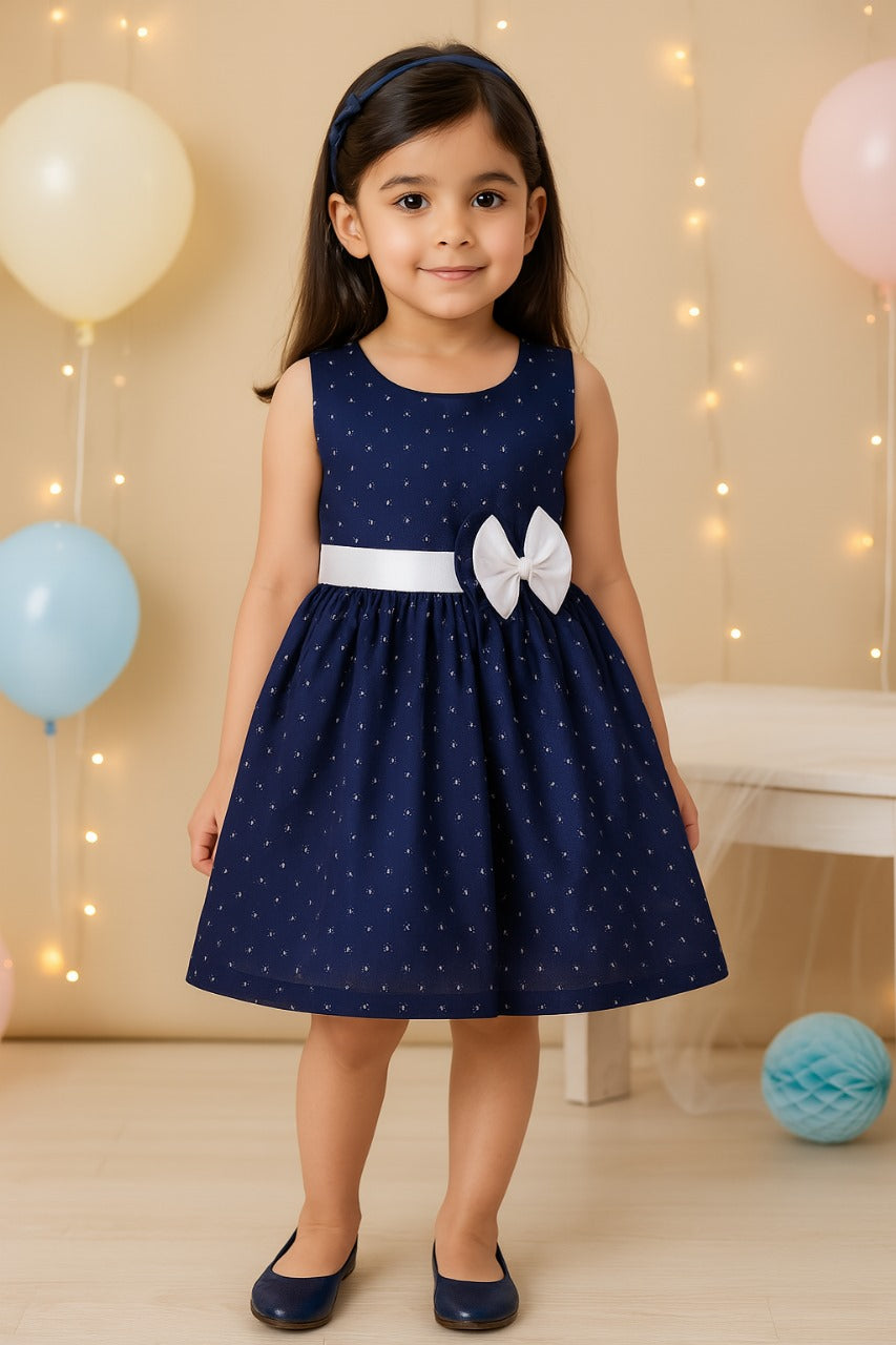 This navy blue Girls Graphic Printed Fit and Flare dress is made of soft cotton and features a sleeveless design and a knee length for comfortable, casual wear. The zipper closure along with the bow design adds convenience and style. Perfect for any fashion-forward girl.