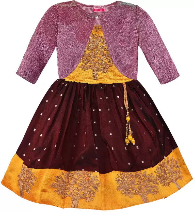 This girls' flared ethnic dress with jacket is crafted from satin silk fabric, featuring beautiful ethnic zari embroidery with a flared pattern and a waist tie-up for perfect fit, perfect for festive occasions, weddings, or celebrations. Its soft and smooth texture with a soft cotton lining ensures all-day comfort while giving a traditional yet stylish charm.