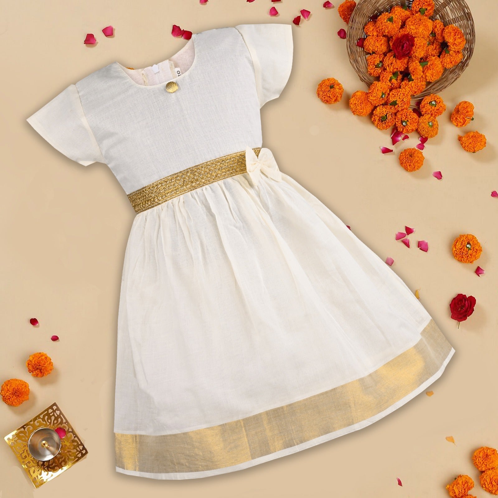 - Design: Traditional Kasavu-inspired golden zari border with elegant lace and bow detail at waist and a golden button at neck