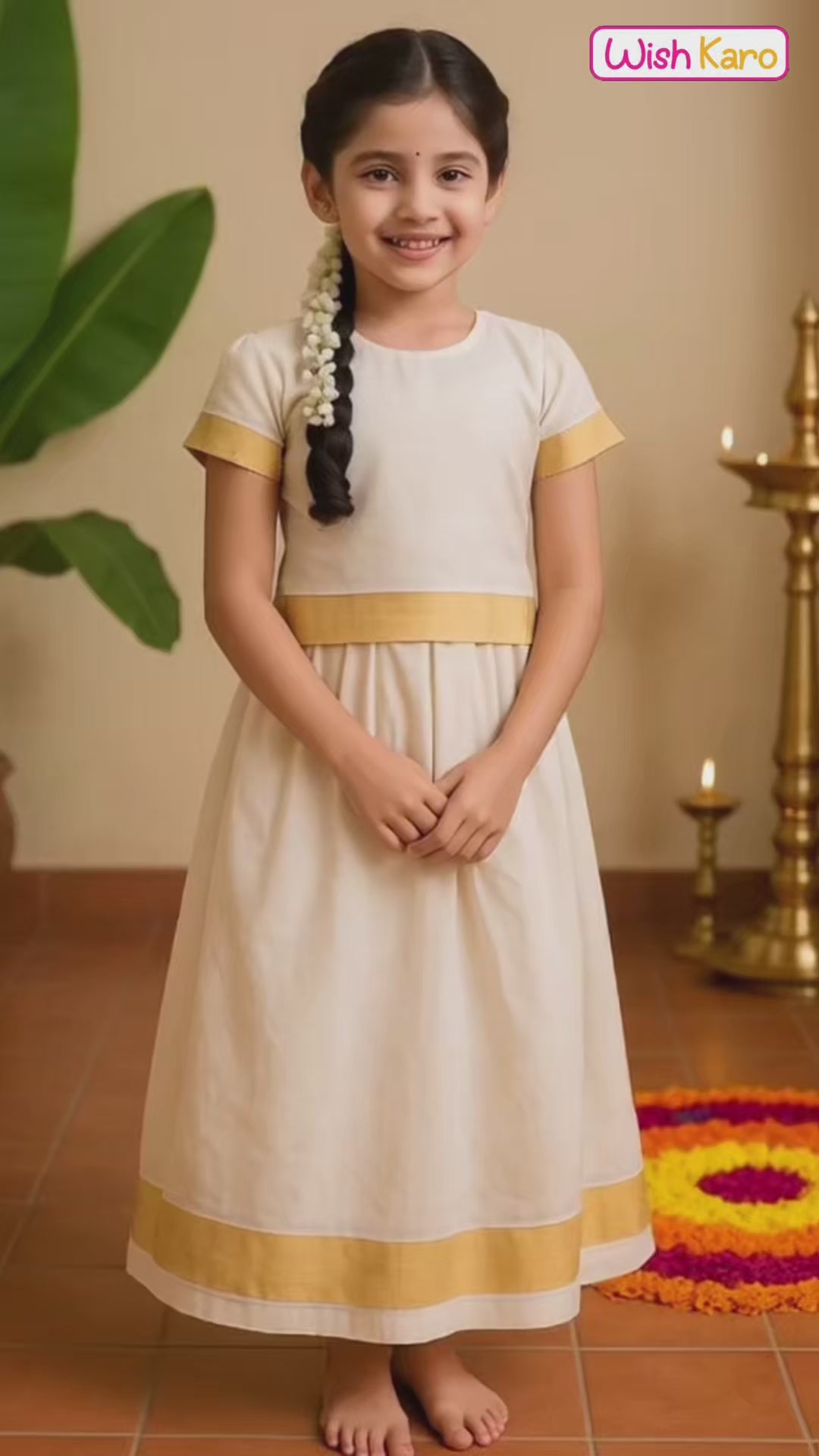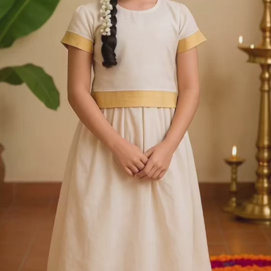Celebrate tradition with this charming Baby Girls Onam Kasavu Top and Skirt Set, crafted for festive elegance. Made from a soft and breathable cotton blend, this ethnic ensemble features a beautifully woven golden zari border that reflects the essence of Kerala’s heritage. The blouse and pleated skirt combination offers comfort and grace, perfect for cultural celebrations, especially Onam. Designed with attention to detail and ease of wear, this set ensures your little one looks adorable while staying comfy all day. A perfect pick for introducing traditional style to your child’s festive wardrobe.