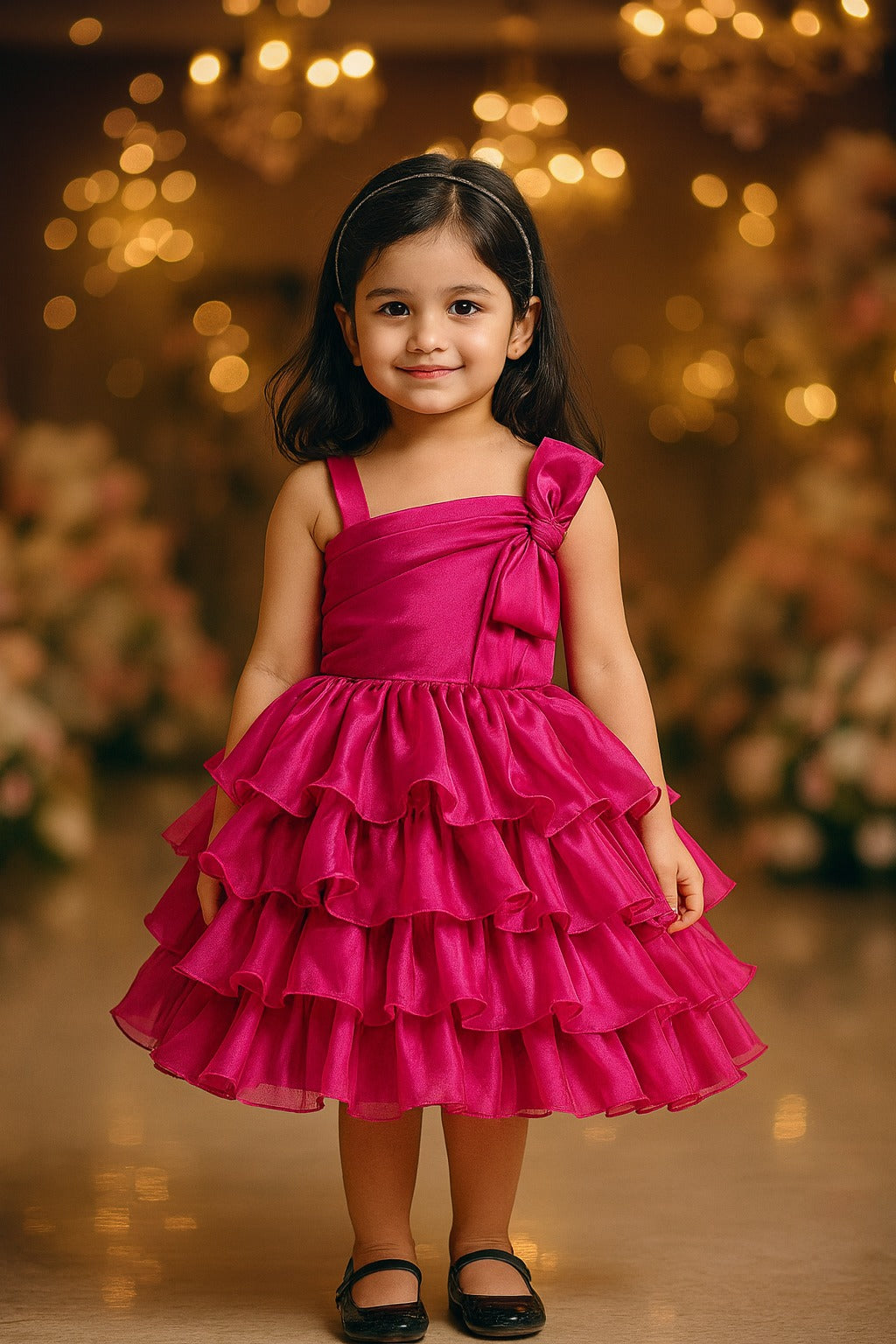 Girls Princess Style Flared Organza Party Dress with Bow Shoulder