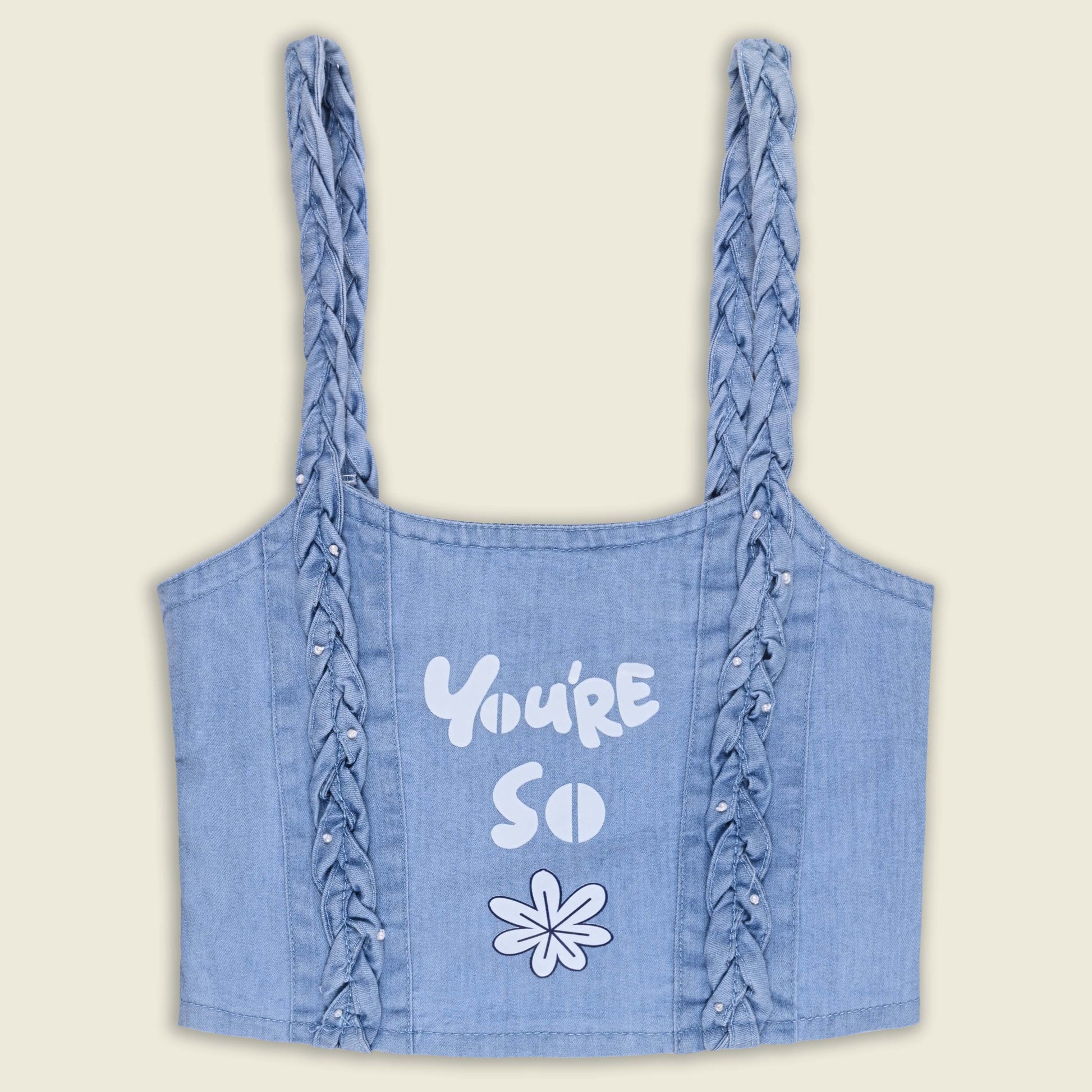 - Top: Stylish printed denim crop top for a modern look