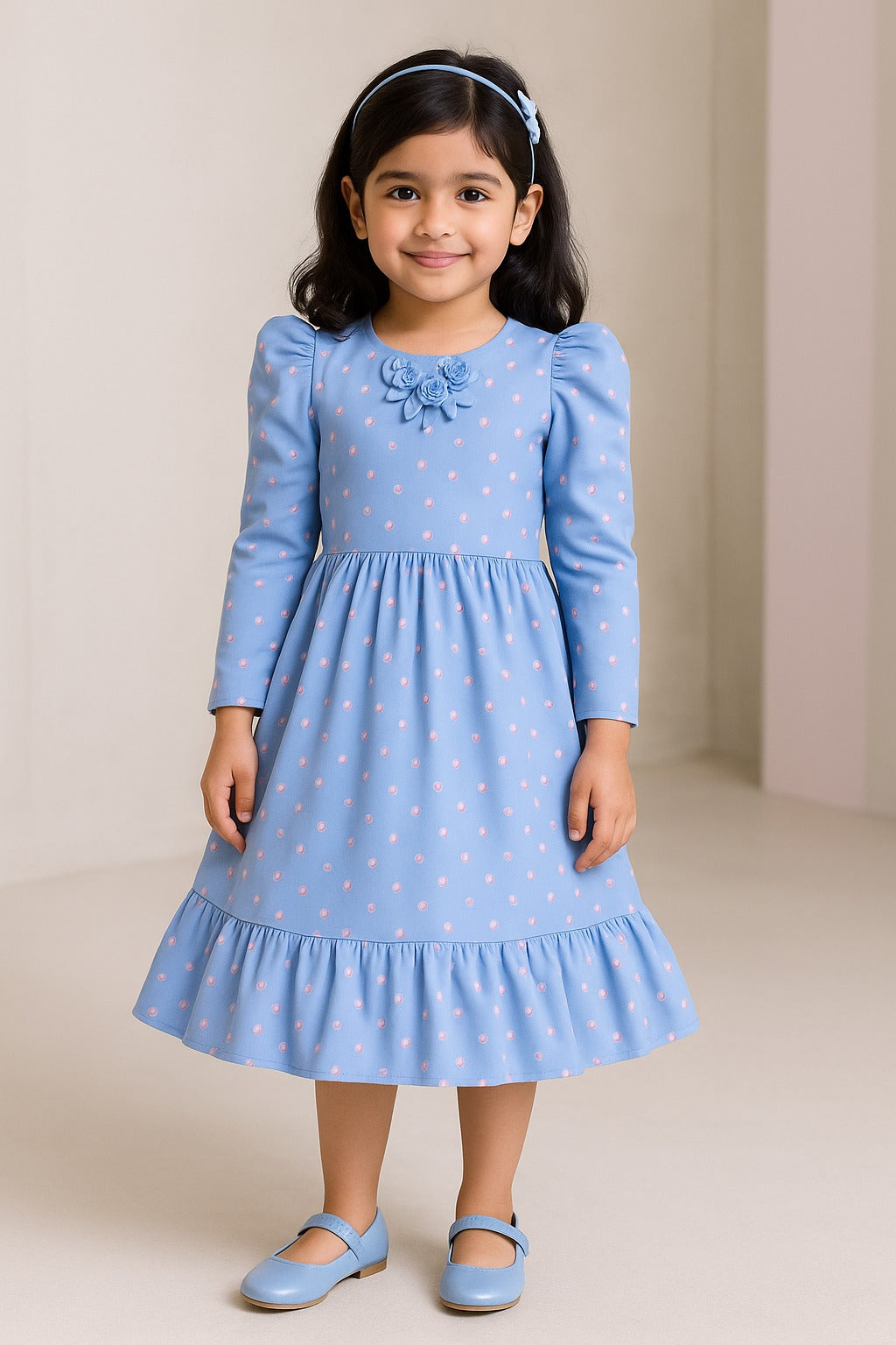 Girls Printed Flared Casual Dress with Puff Sleeves