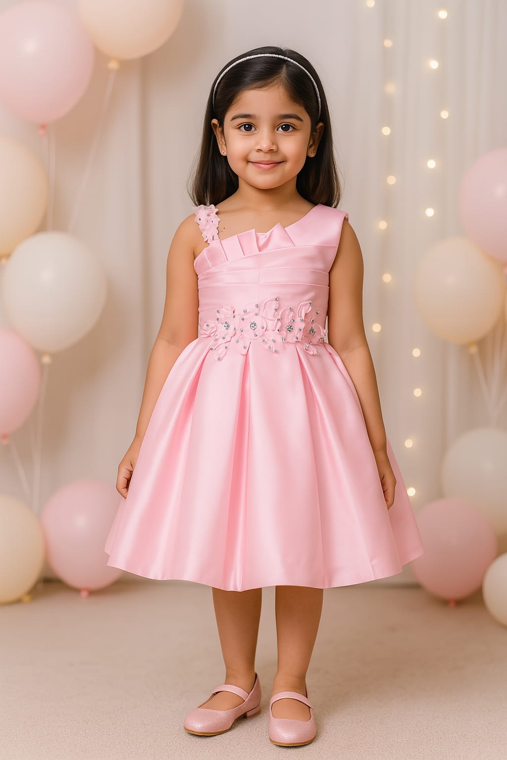 - This Satin Fit and Flare Knee Length birthday dress features delicate flower detailing and elegant embellishments, making it a perfect choice for special occasions. The sleeveless design adds a touch of sophistication while the knee length style provides comfort and versatility. Make a statement in this stunning dress.
