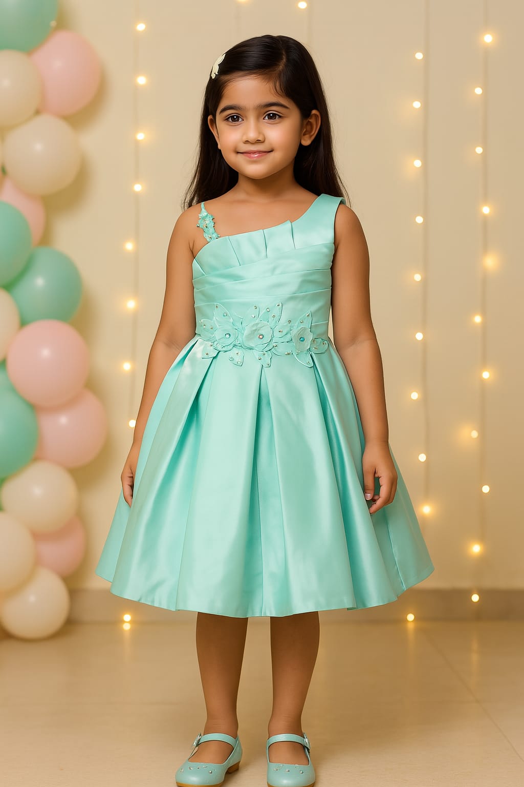 Girls Satin Embellished Flower Detailed Fit and Flare Dress