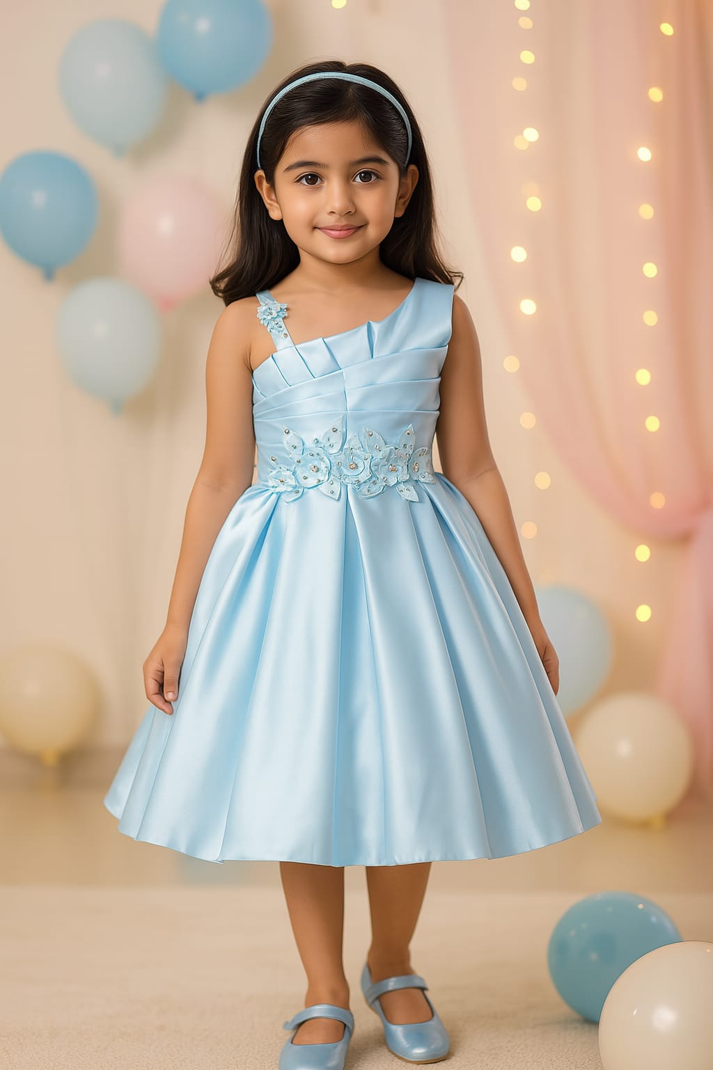 - This Satin Fit and Flare Knee Length birthday dress features delicate flower detailing and elegant embellishments, making it a perfect choice for special occasions. The sleeveless design adds a touch of sophistication while the knee length style provides comfort and versatility. Make a statement in this stunning dress.