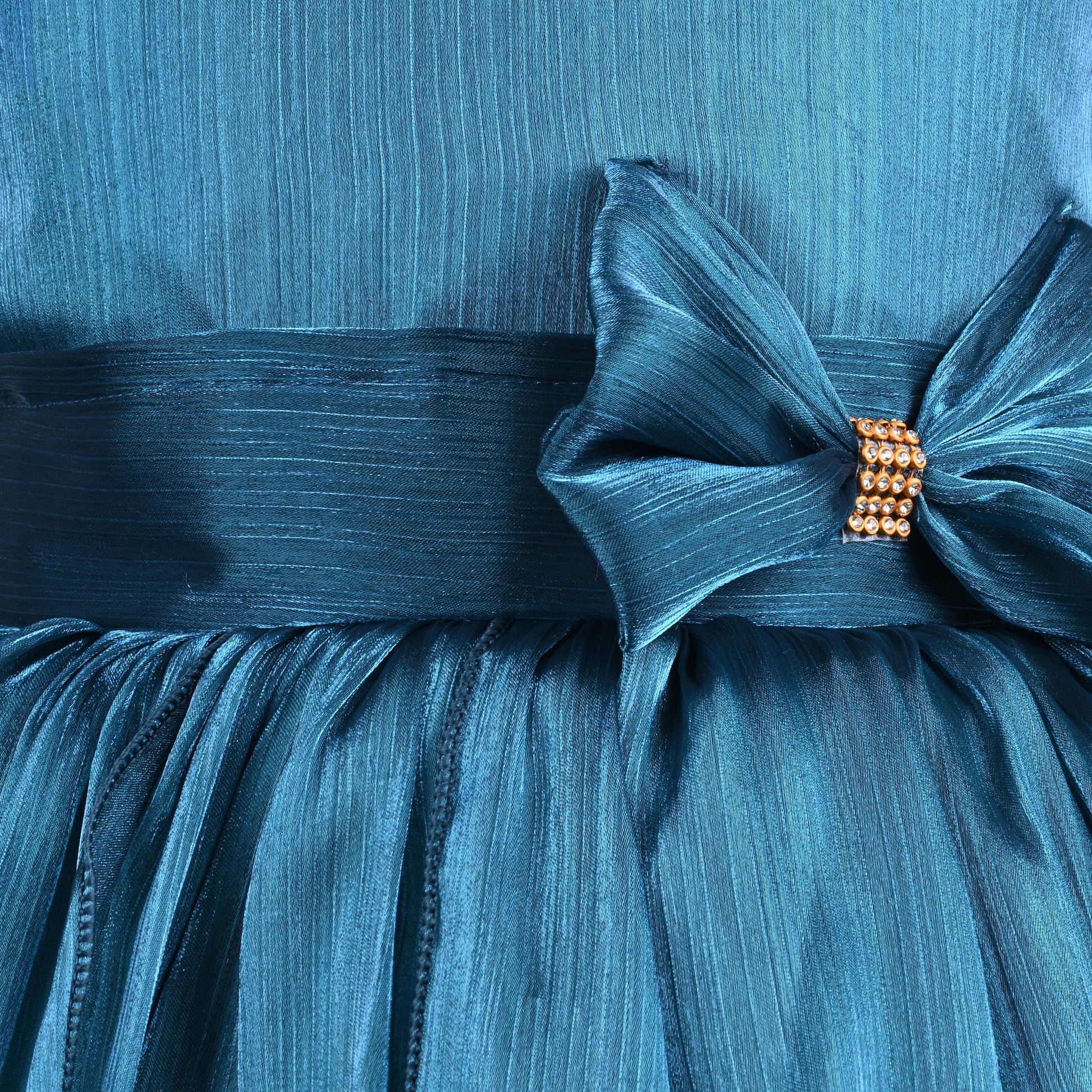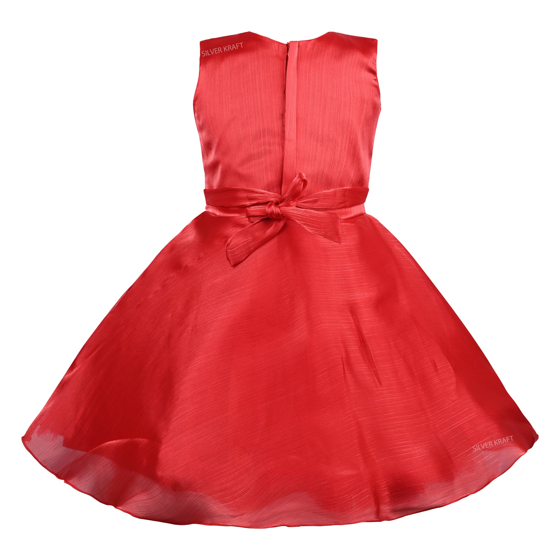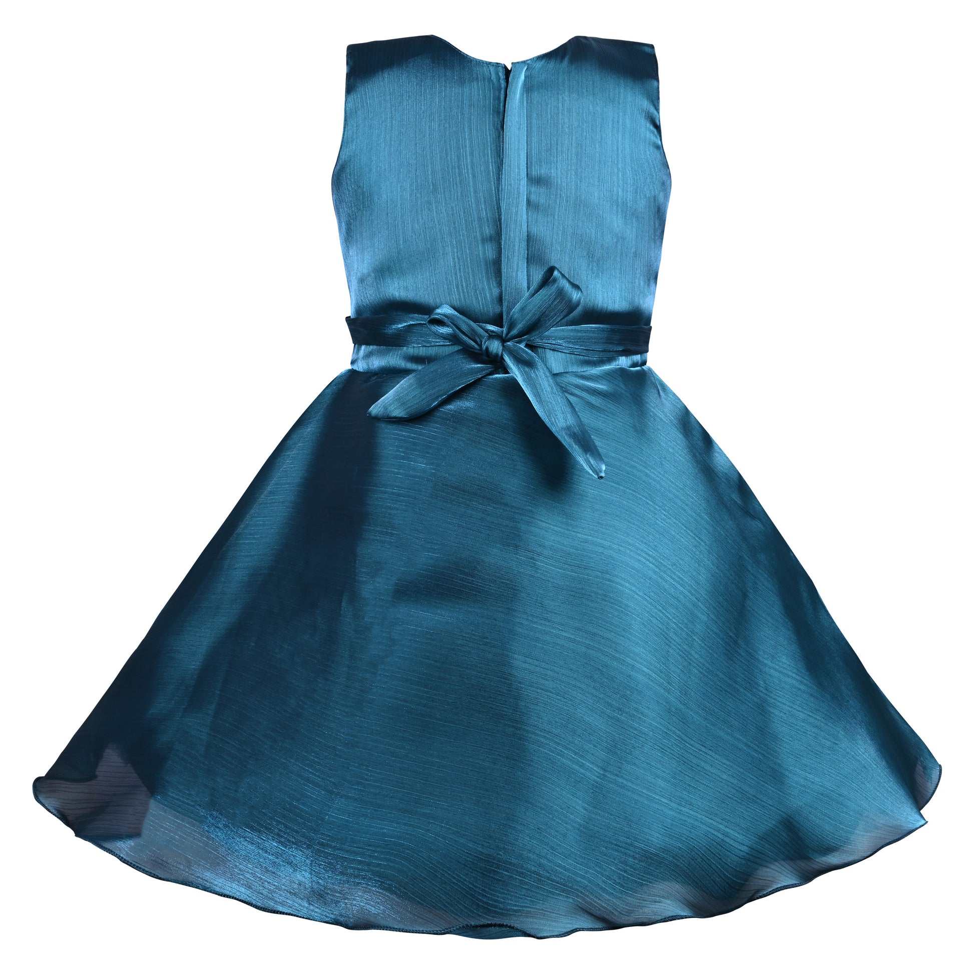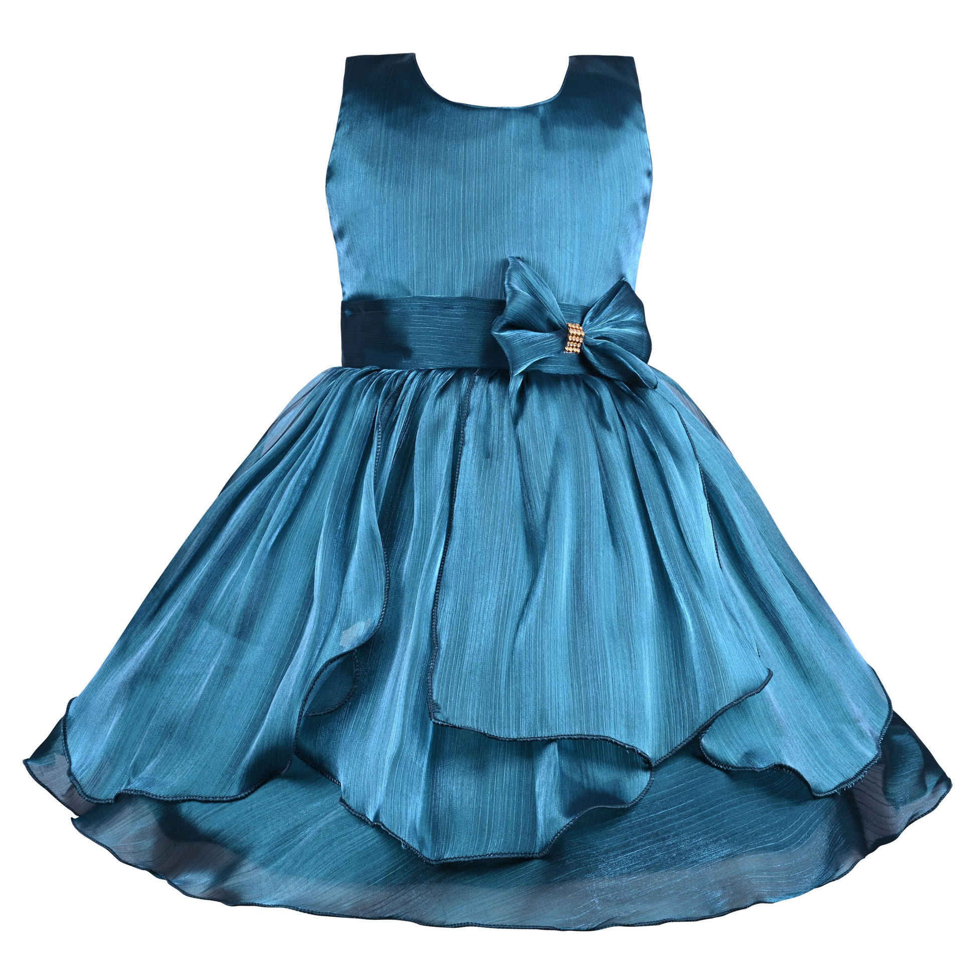 The frock is crafted in premium satin fabric, designed in a sleeveless style with a layered flared hemline that adds volume and charm. A statement satin bow at the waistline enhances the dress’s graceful appeal, making it a must-have outfit for special celebrations.