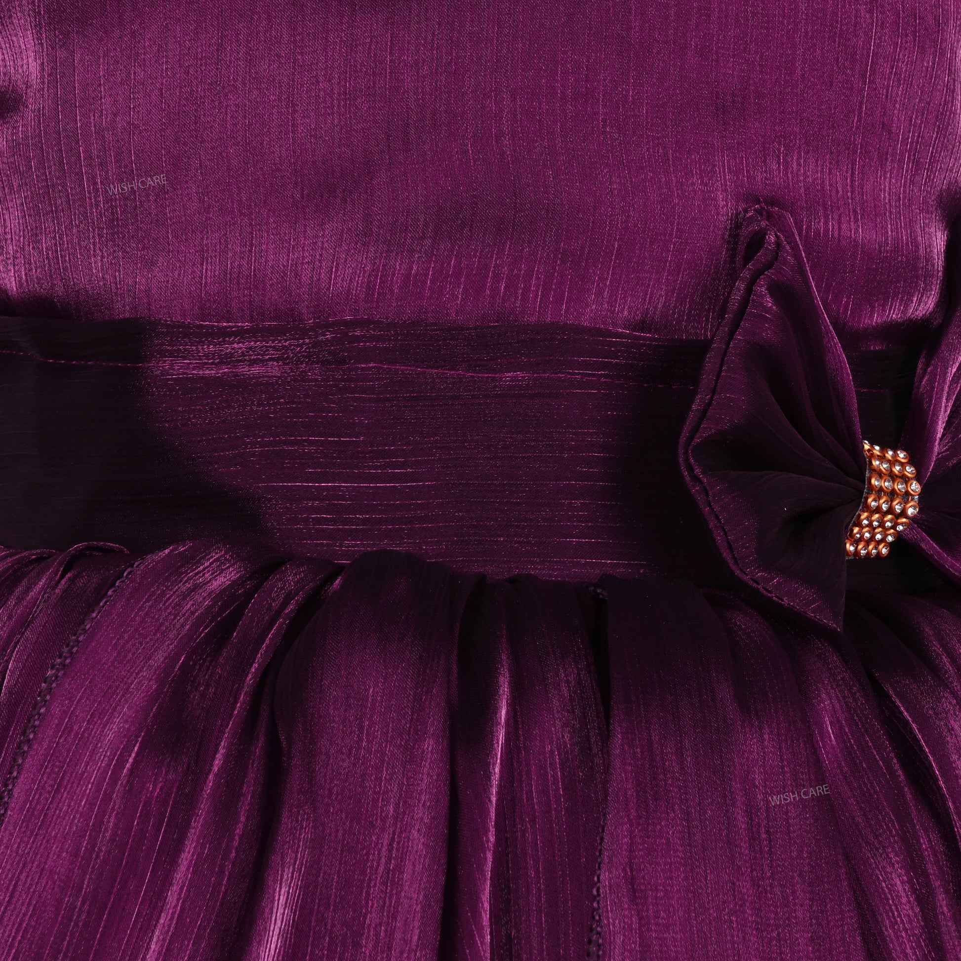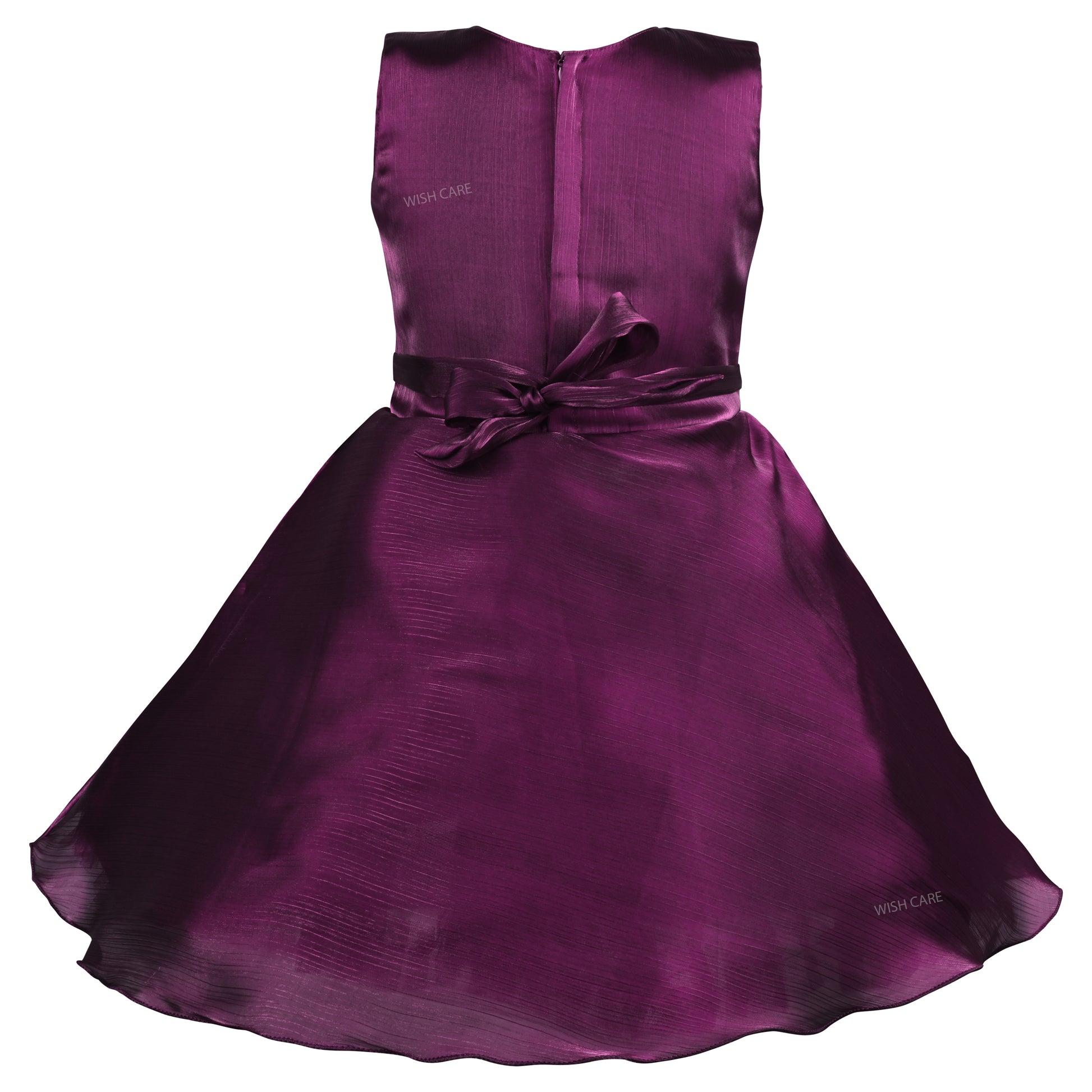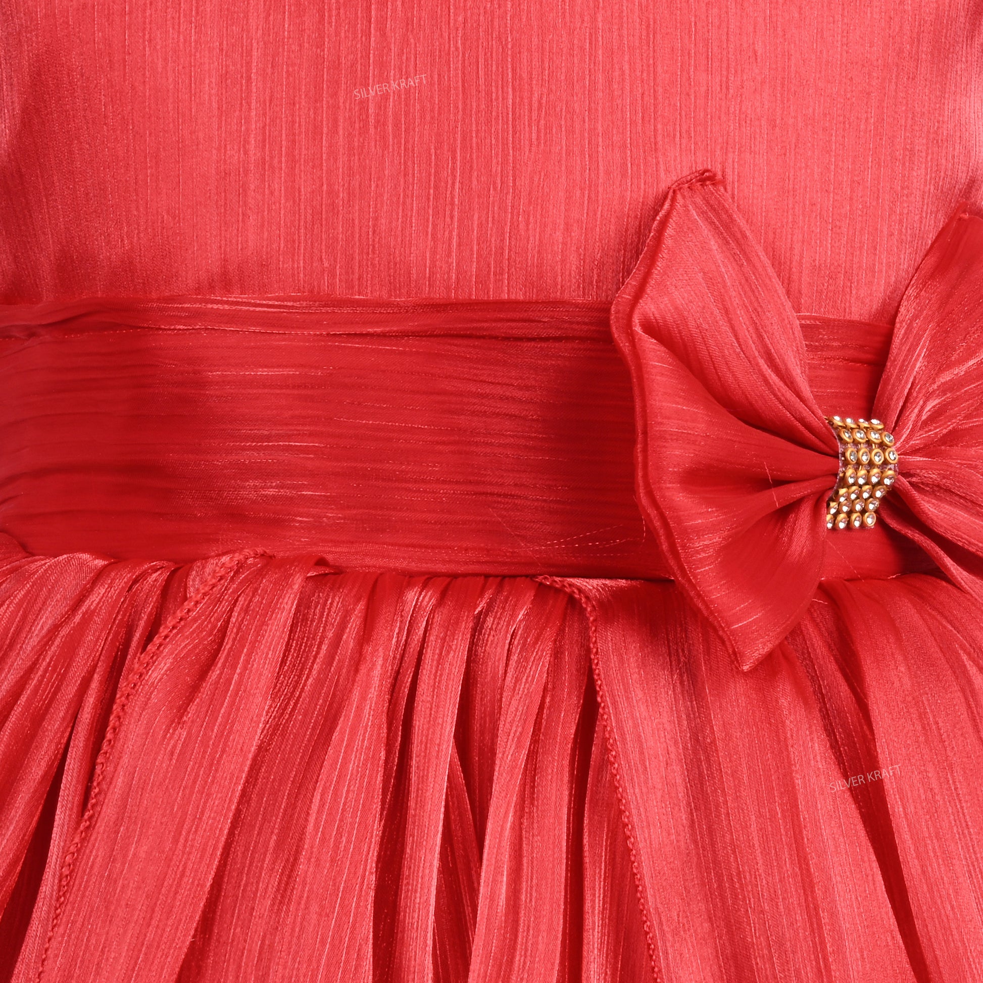 The frock is crafted in premium satin fabric, designed in a sleeveless style with a layered flared hemline that adds volume and charm. A statement satin bow at the waistline enhances the dress’s graceful appeal, making it a must-have outfit for special celebrations.