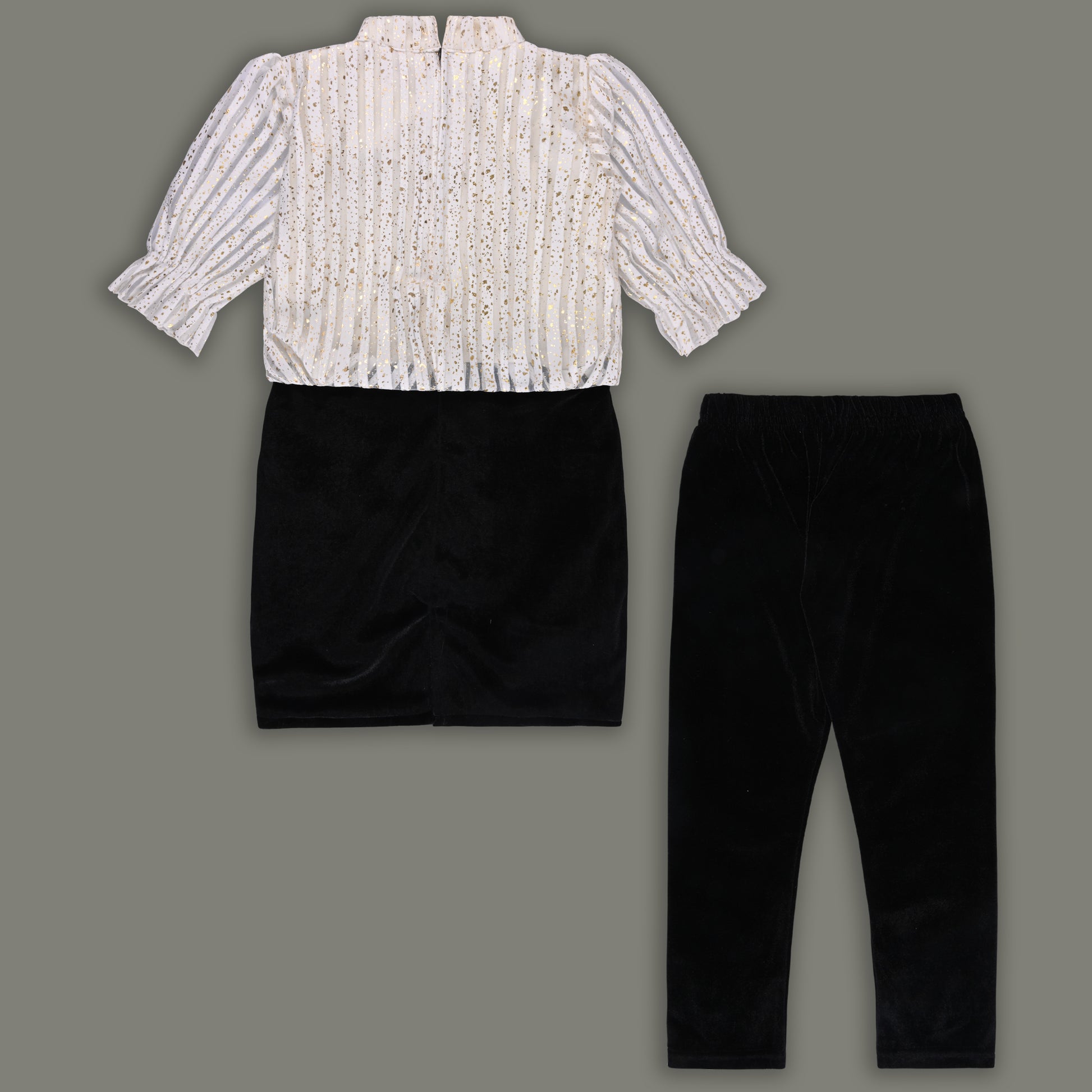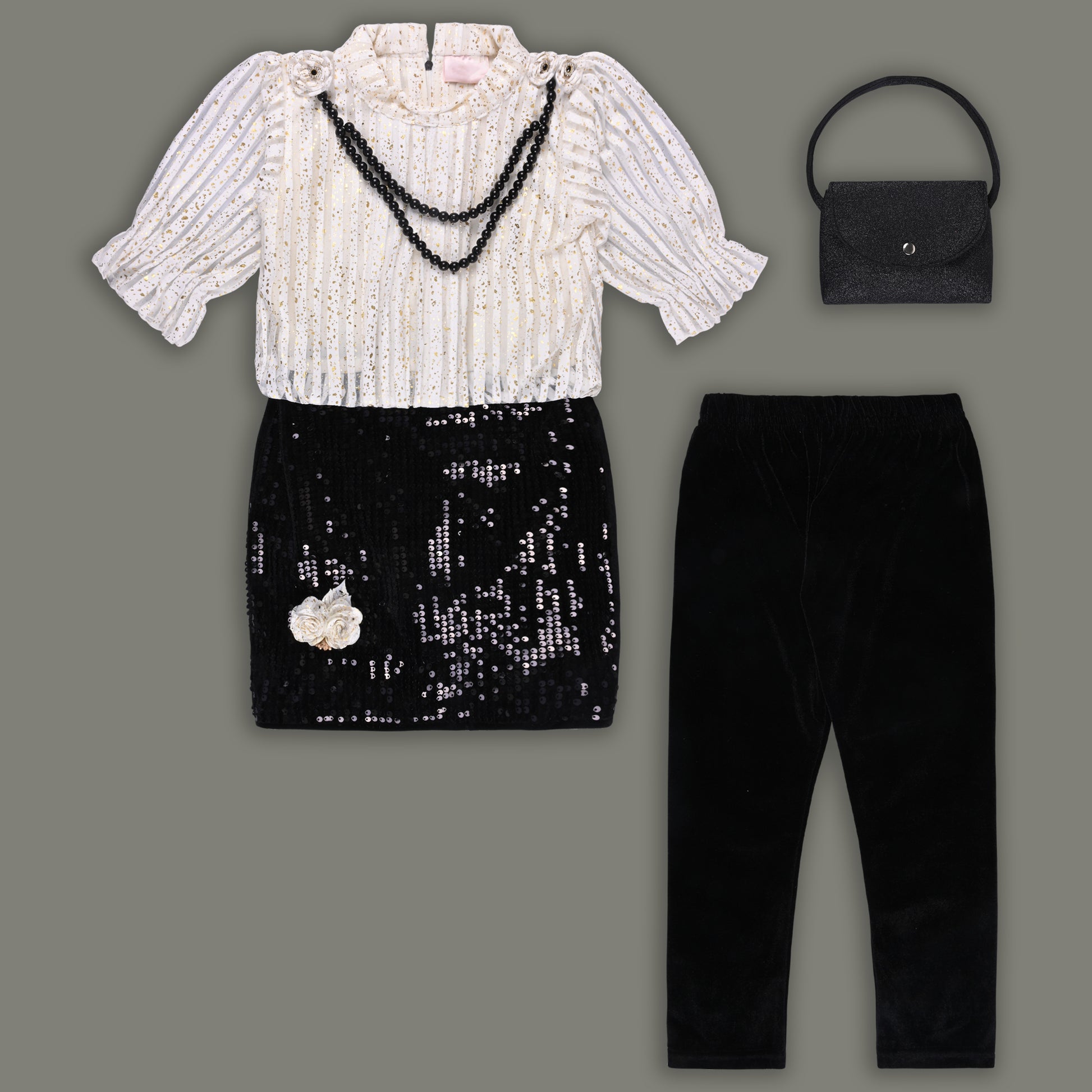 Let your little one shine at every celebration with this Girls' Sequin Embellished Party Dress with Puff Sleeves, Belt, Pant & Purse. Designed with attention to detail, this dress features dazzling sequin accents on the skirt and charming beaded hangings on the topβperfect for turning heads at any event. The elegant puff sleeves and flared hemline add a regal touch, while the soft satin fabric and smooth lining ensure day-long comfort. Complete with a coordinating velvet pant, stylish mini purse, and detachable belt, this outfit is a ready-to-wear ensemble for birthdays, weddings, and festive occasions. Just add sparkling shoes and a cute headband, and sheβs ready to dazzle!