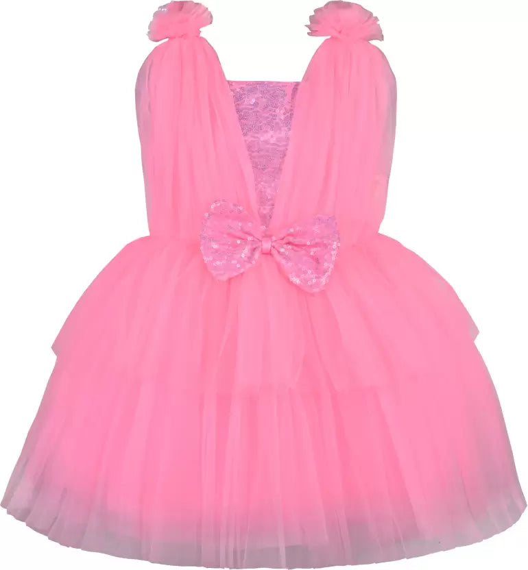 - Elevate her style with this knee length pink net dress. Accented with embellishments, this dress is perfect for birthday parties and special occasions. Made from premium quality fabric, it offers comfort and style in one piece. A must-have for every little fashionista!