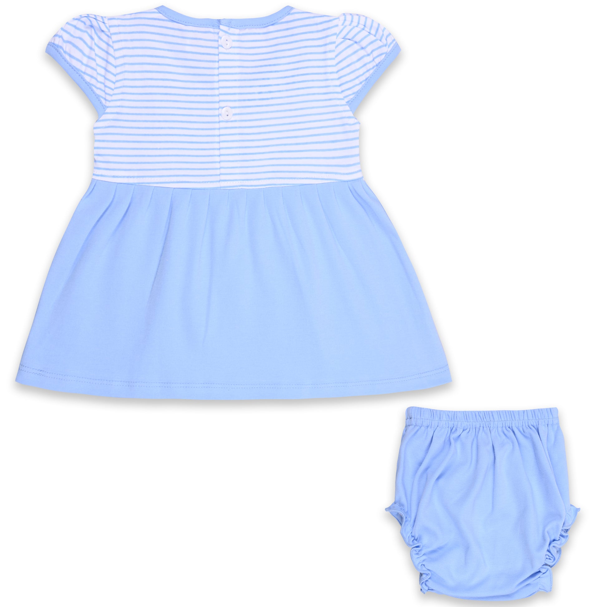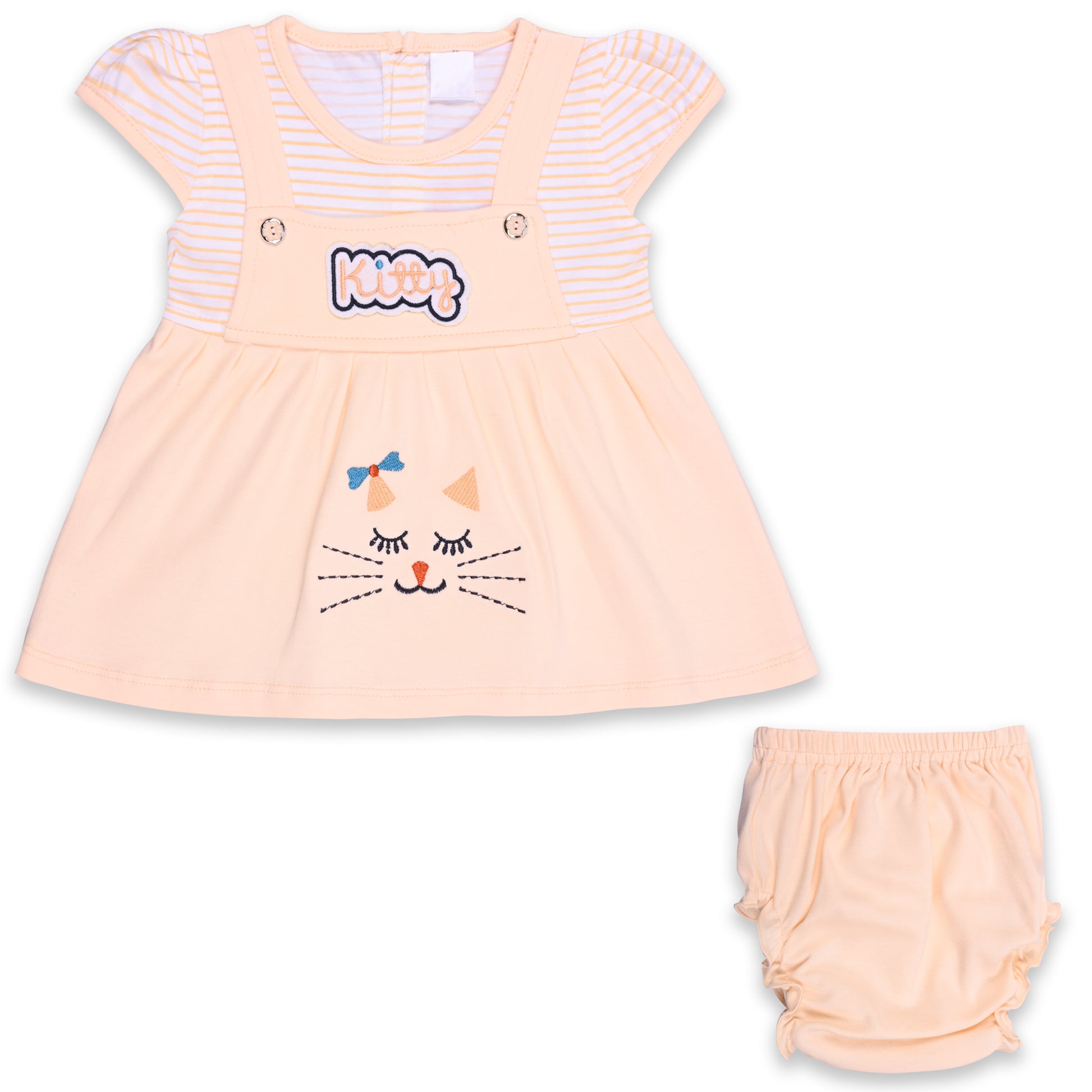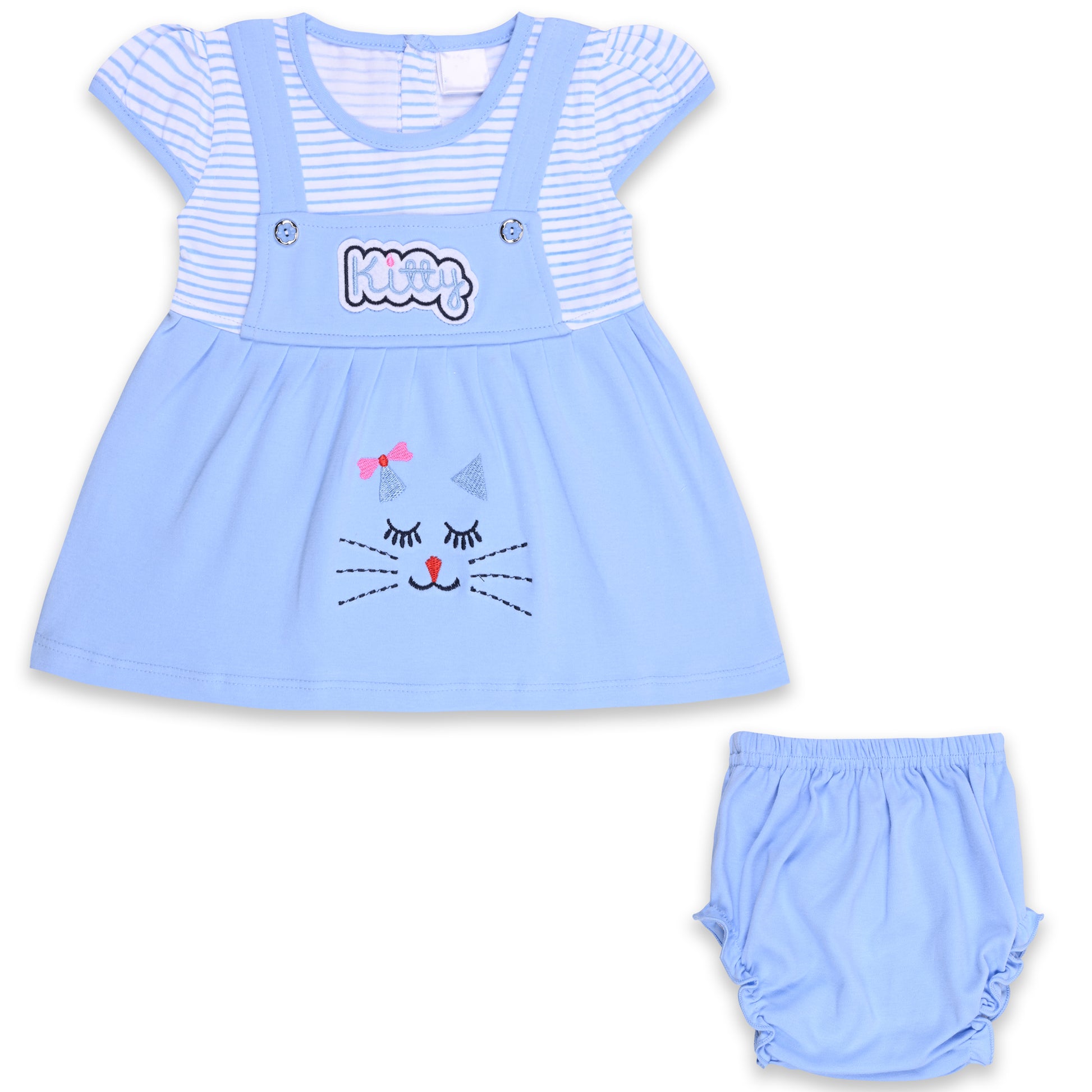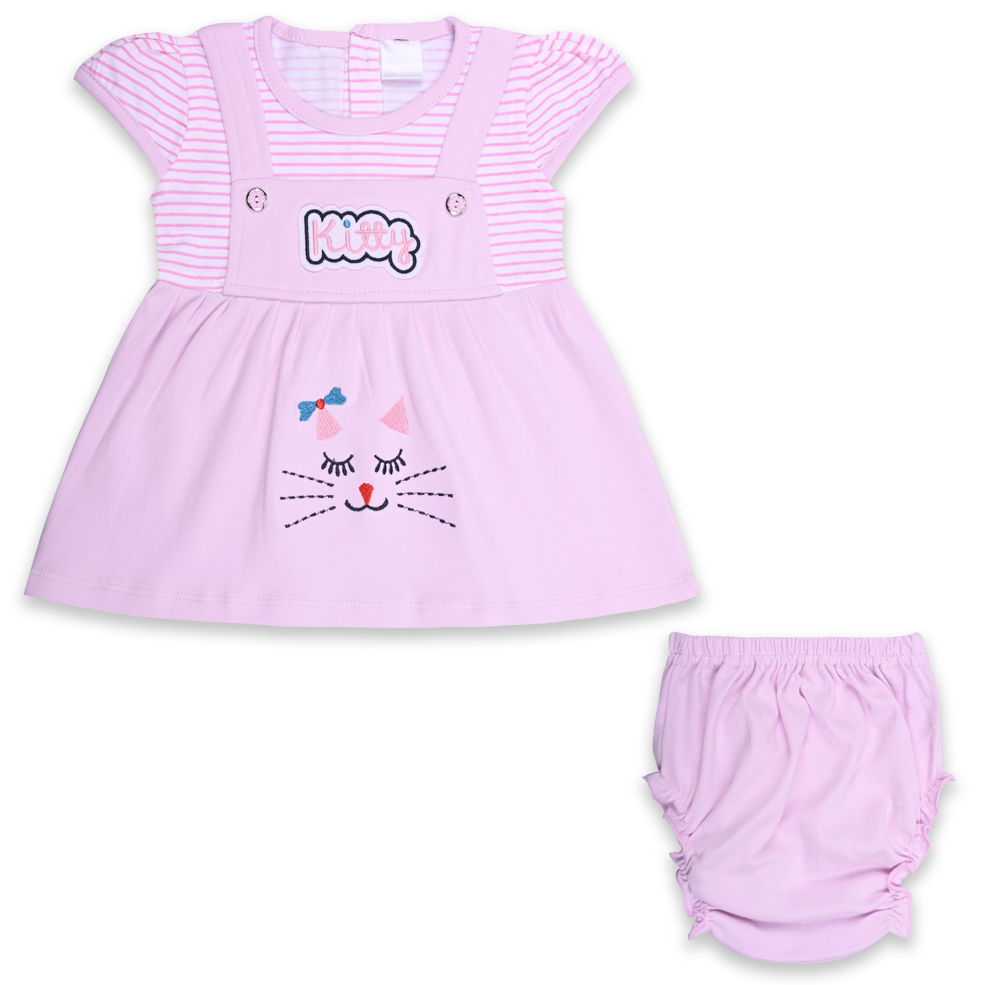 This girls' A-line dress features a stylish embroidered print and comfortable knee length in soft cotton fabric. The round neck and cap sleeves add a touch of classic charm. Comes with a matching brief for a complete outfit.