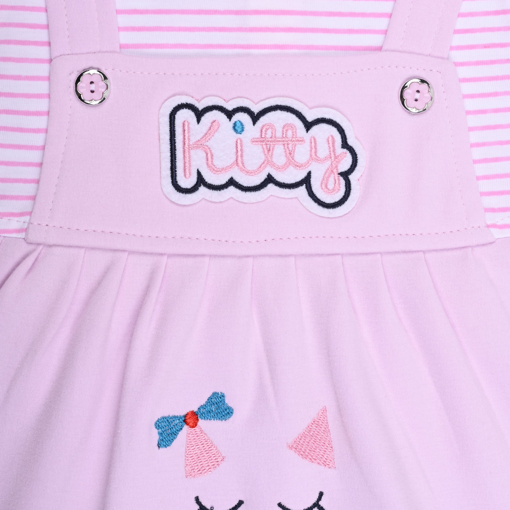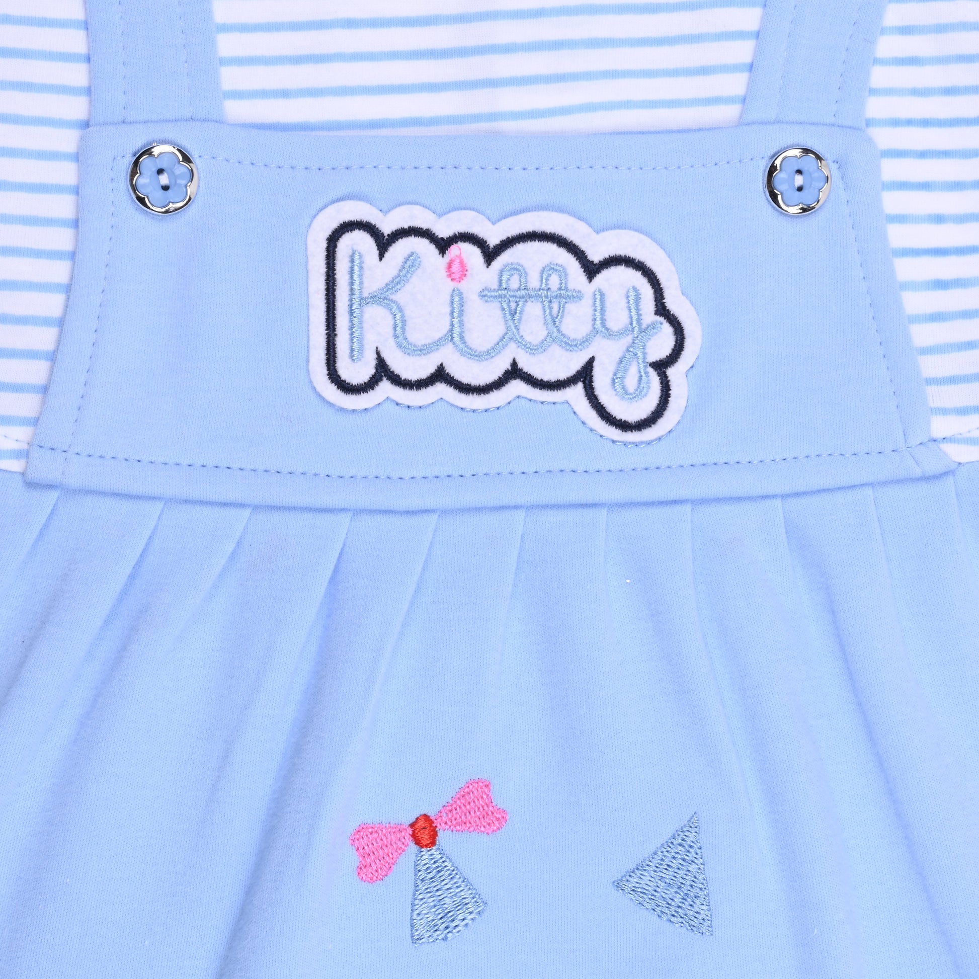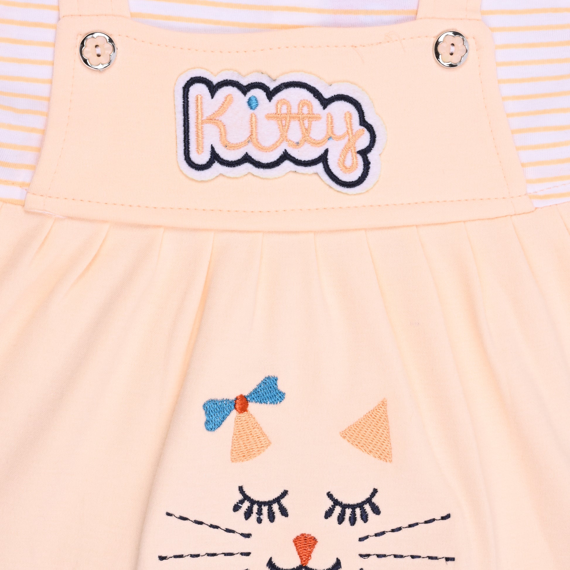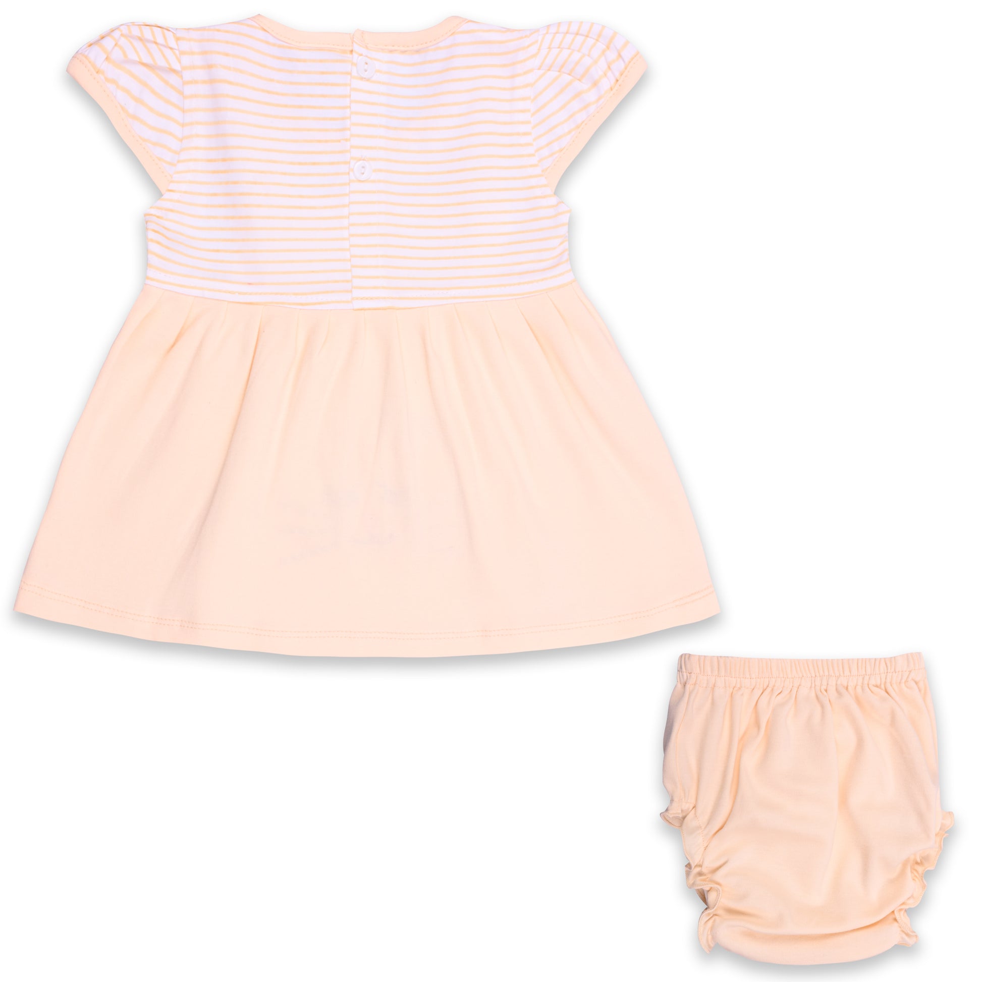 This girls' A-line dress features a stylish embroidered print and comfortable knee length in soft cotton fabric. The round neck and cap sleeves add a touch of classic charm. Comes with a matching brief for a complete outfit.