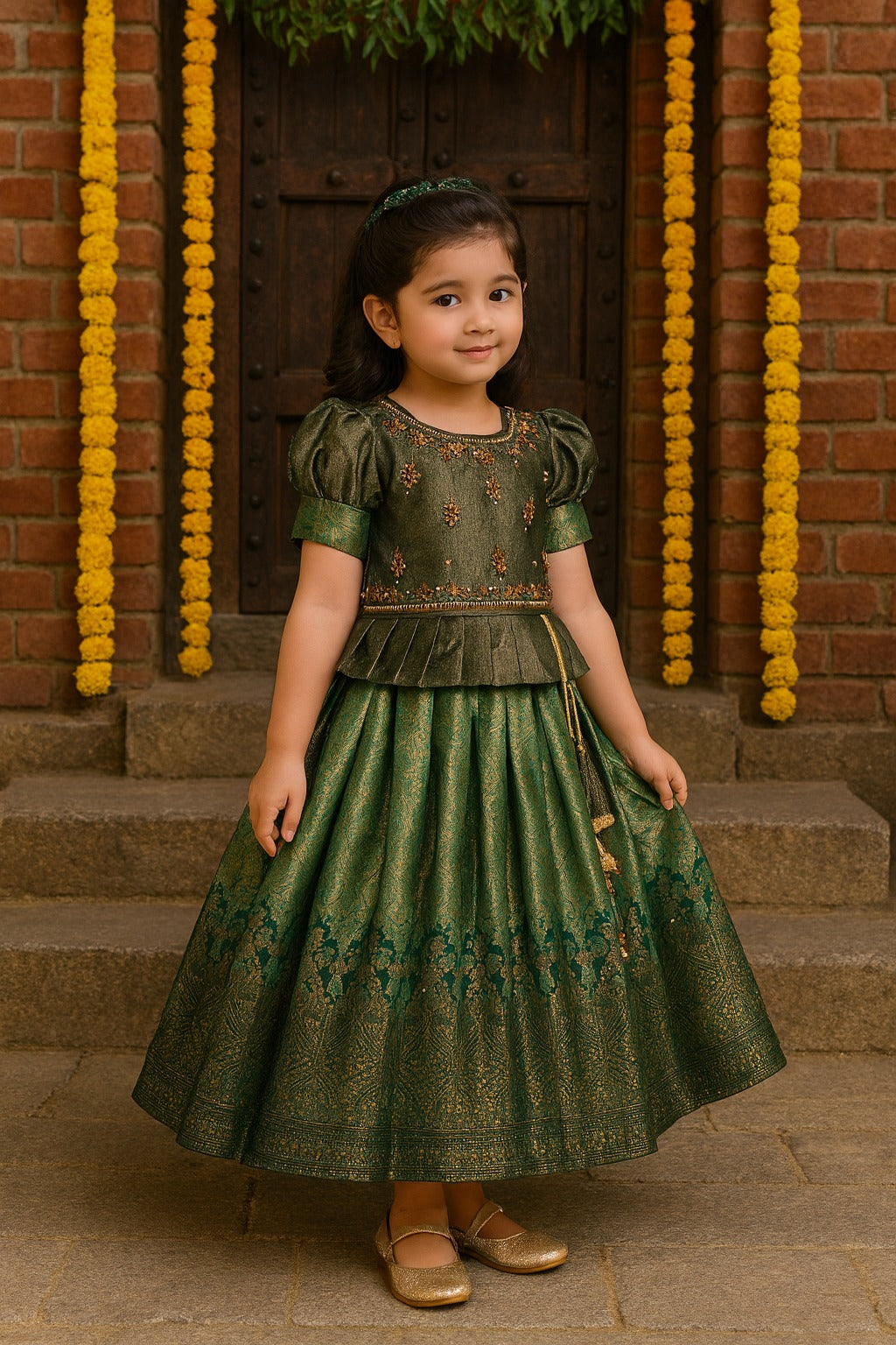 Girls Woven Zari Printed Bead Embellished Ethnic Dress