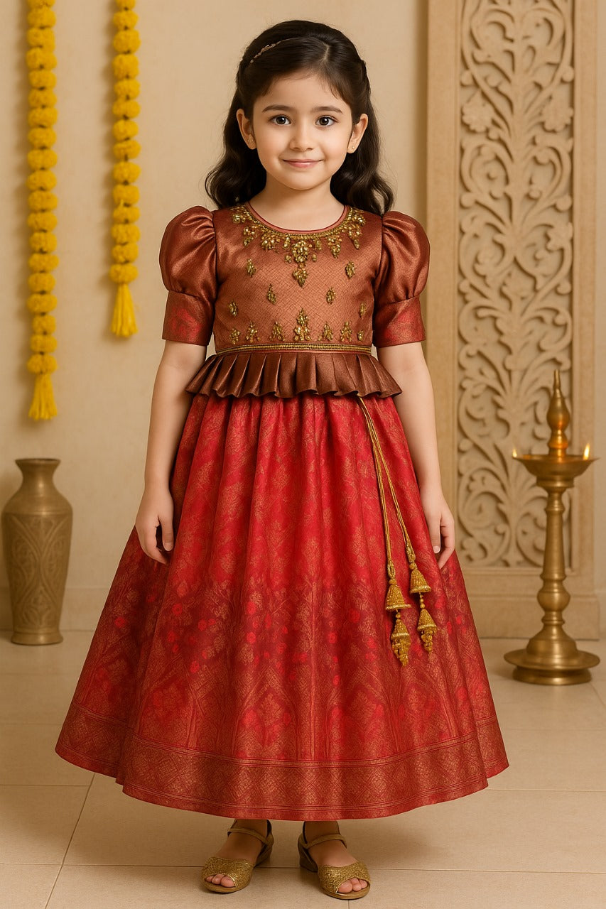 Girls Woven Zari Printed Bead Embellished Ethnic Dress