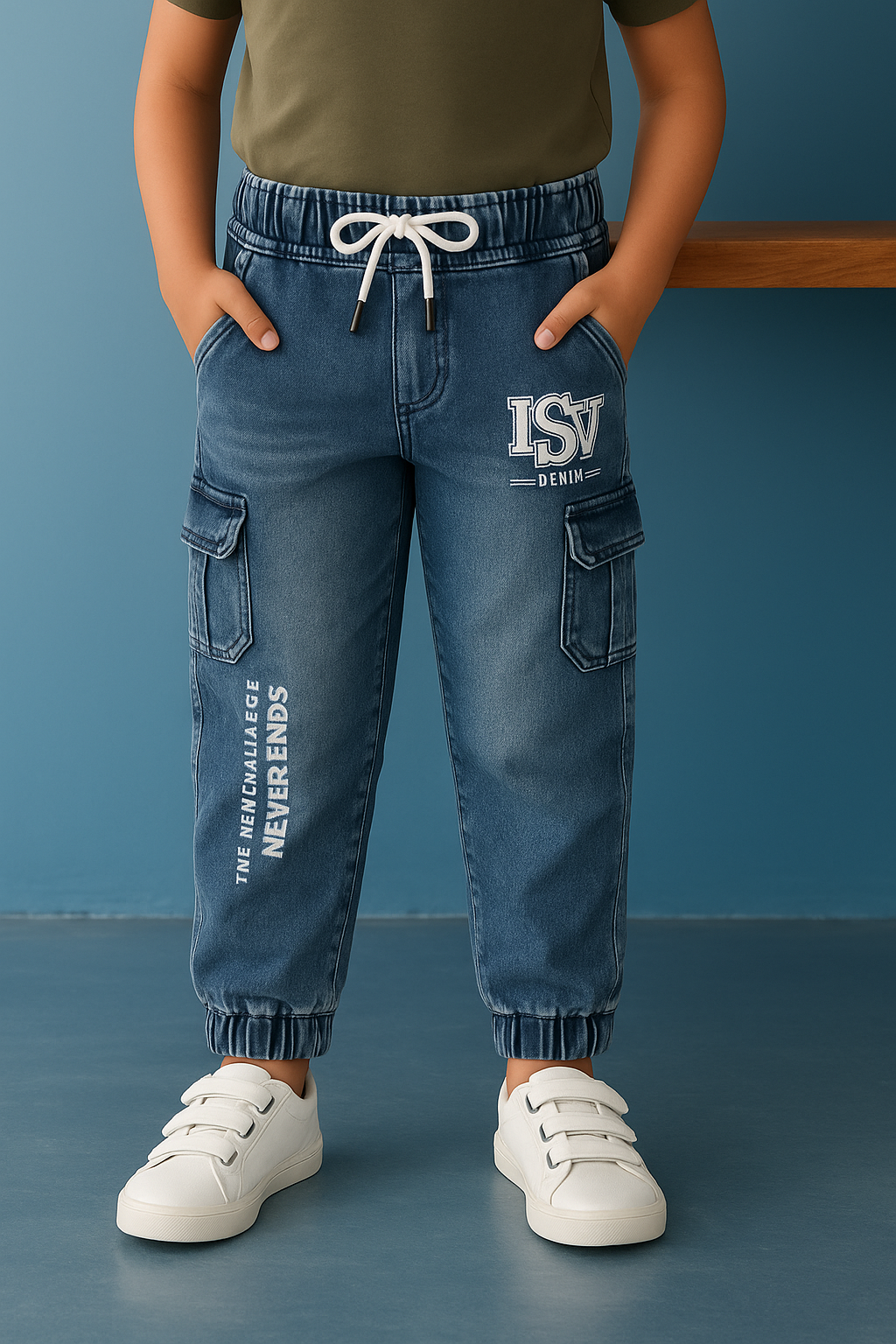 light blue embroidered jogger fit jeans, has mid-rise and drawstring closure. Has 5 pockets.